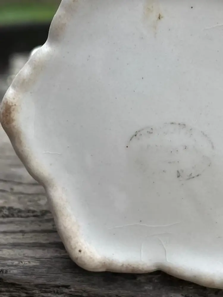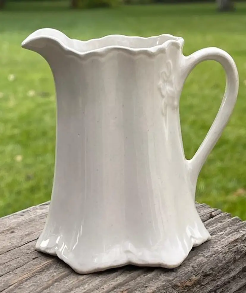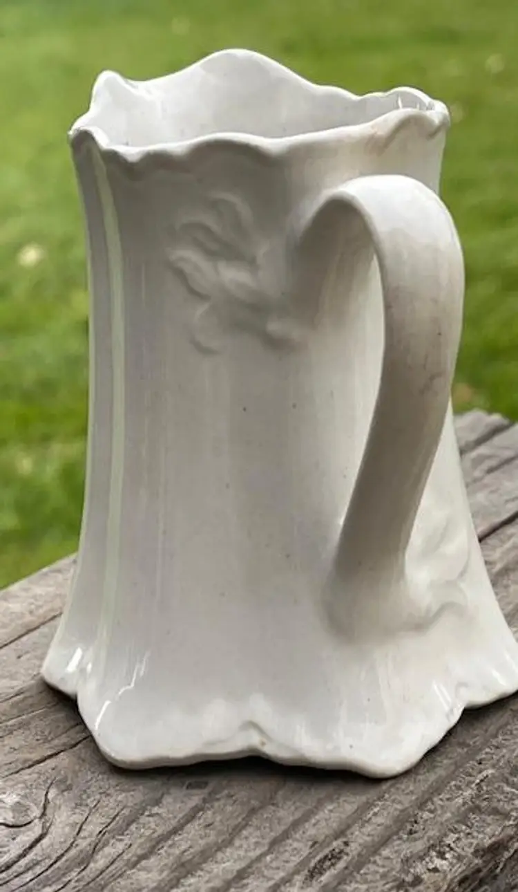 A pretty antique creamer. Scrolling around the top and bottom with two flowers next to the handle at the top and bottom. No chips and such. Some expected crazing.