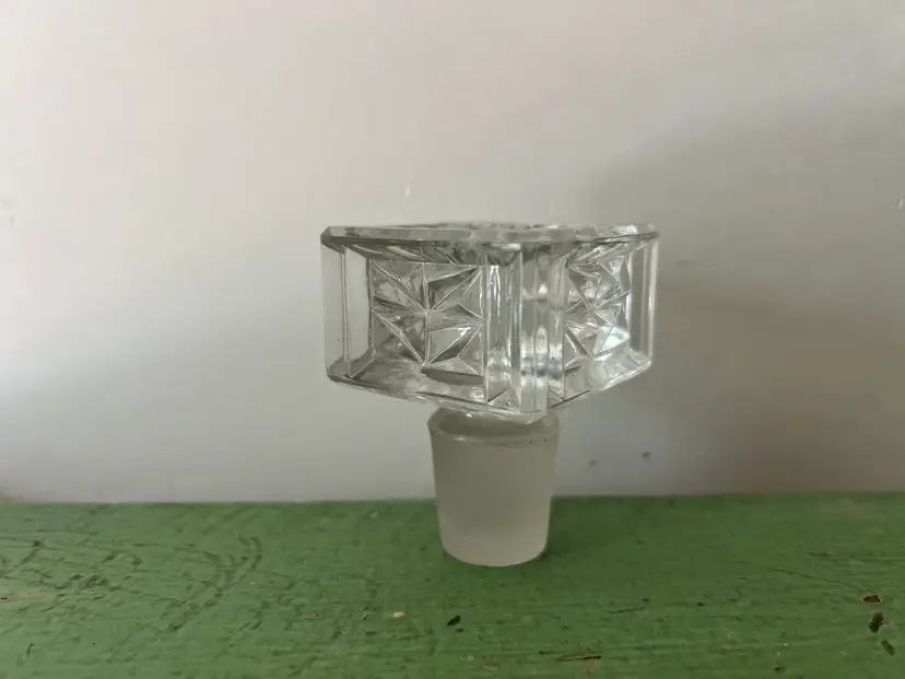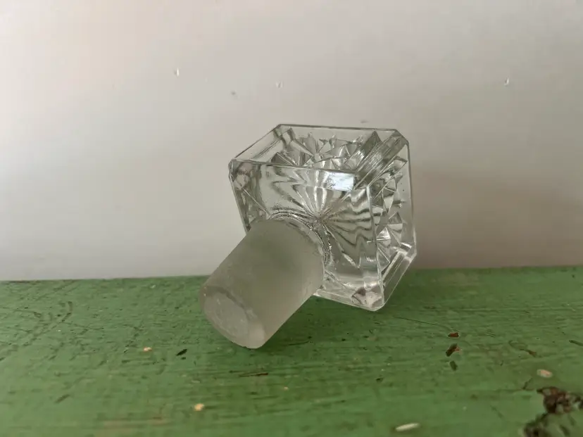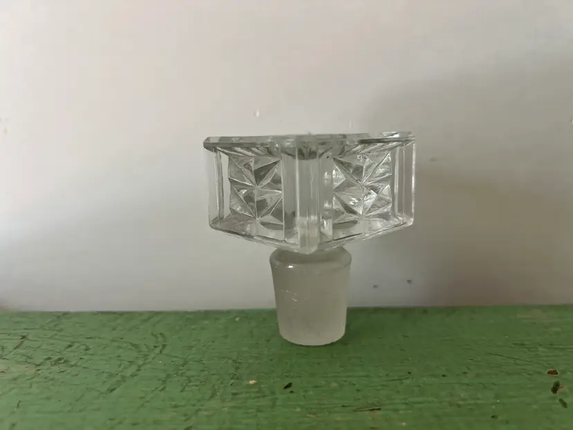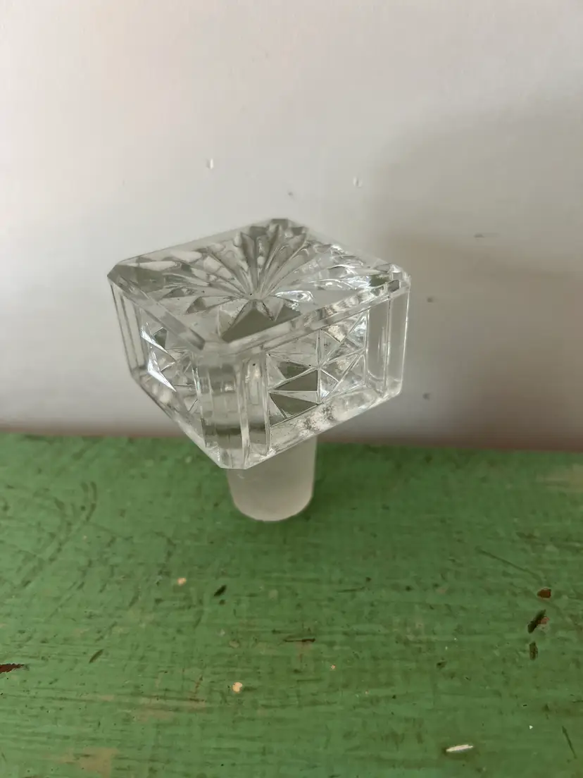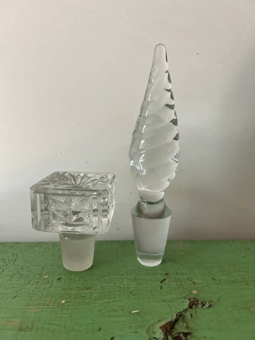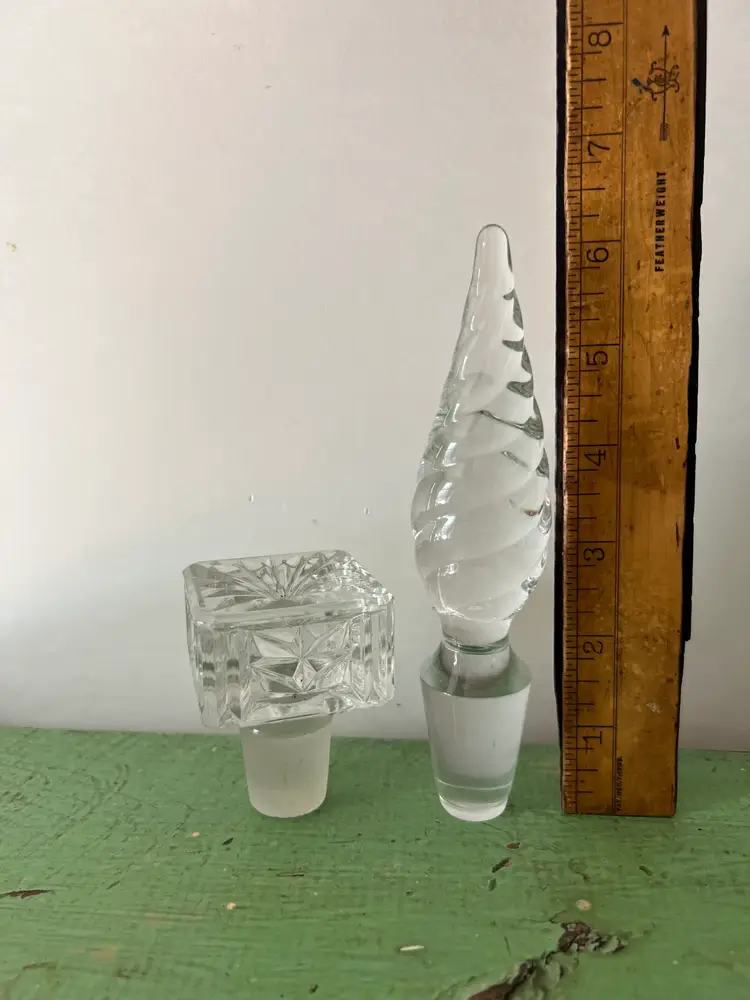 Beautiful pair of antique crystal bottle stoppers. The square stopper is 2 3/8" tall. The stop square is 2" x 2". The end of the decanter that goes into the bottle is 1 7/8" and then tapers to wider. The oblong stopper is 6.25" tall. The end of the decanter that goes into the bottle is .75" and then tapers to wider.