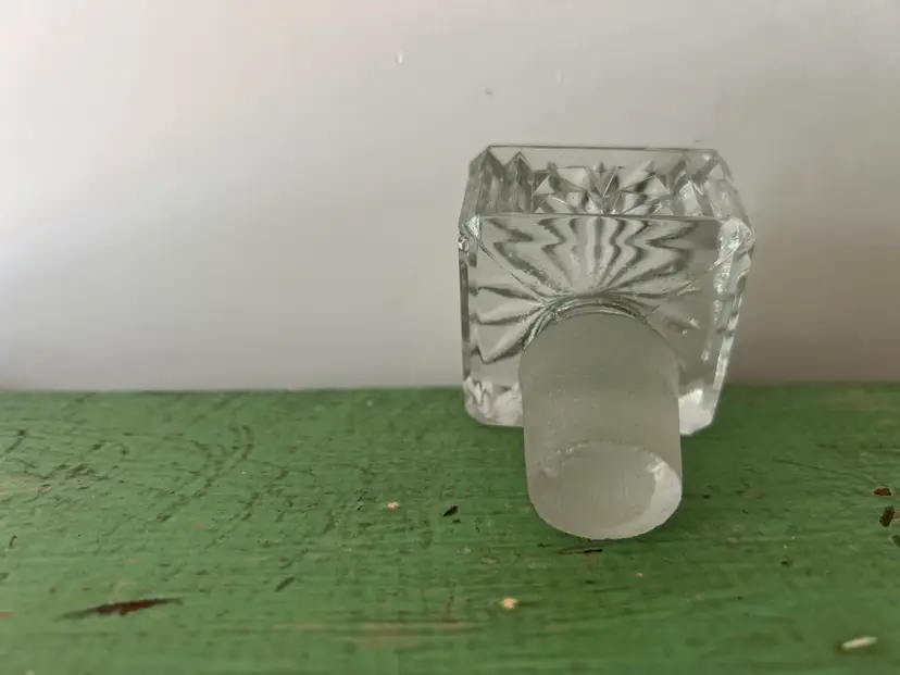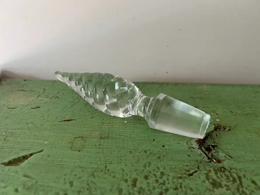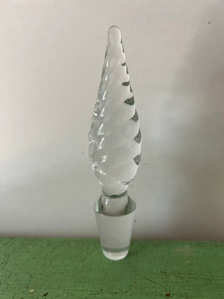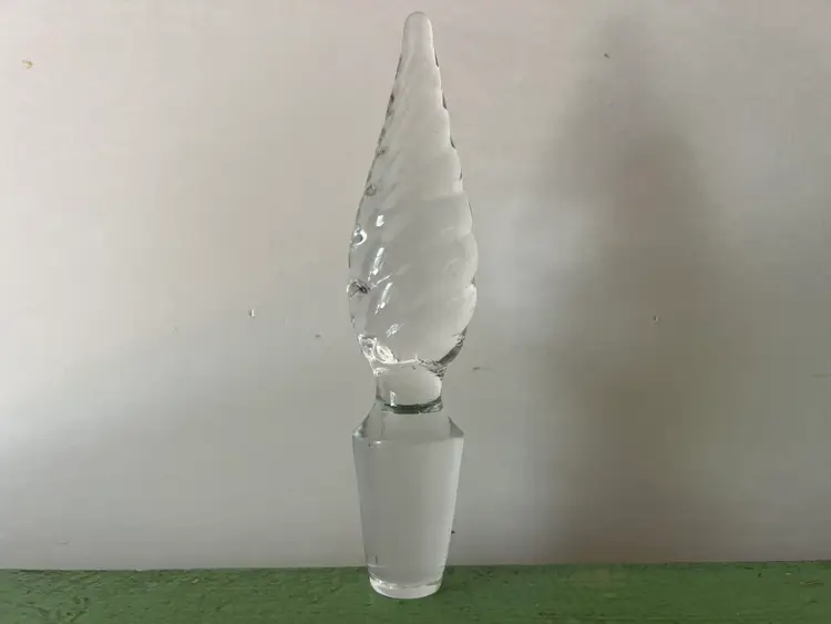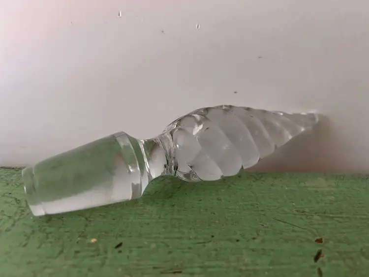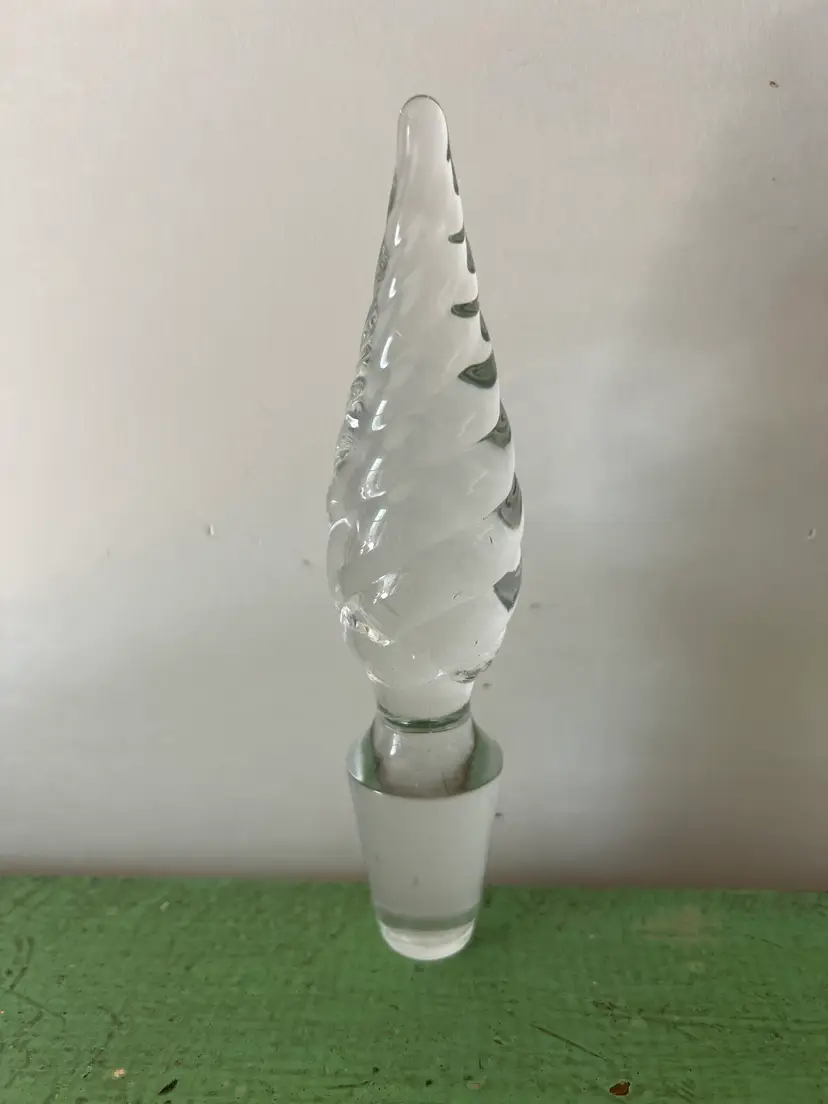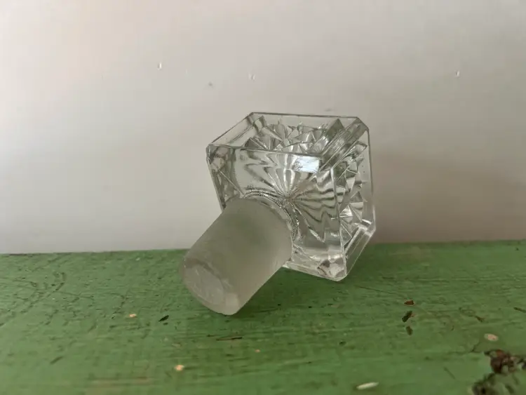 Beautiful pair of antique crystal bottle stoppers. The square stopper is 2 3/8" tall. The stop square is 2" x 2". The end of the decanter that goes into the bottle is 1 7/8" and then tapers to wider. The oblong stopper is 6.25" tall. The end of the decanter that goes into the bottle is .75" and then tapers to wider.