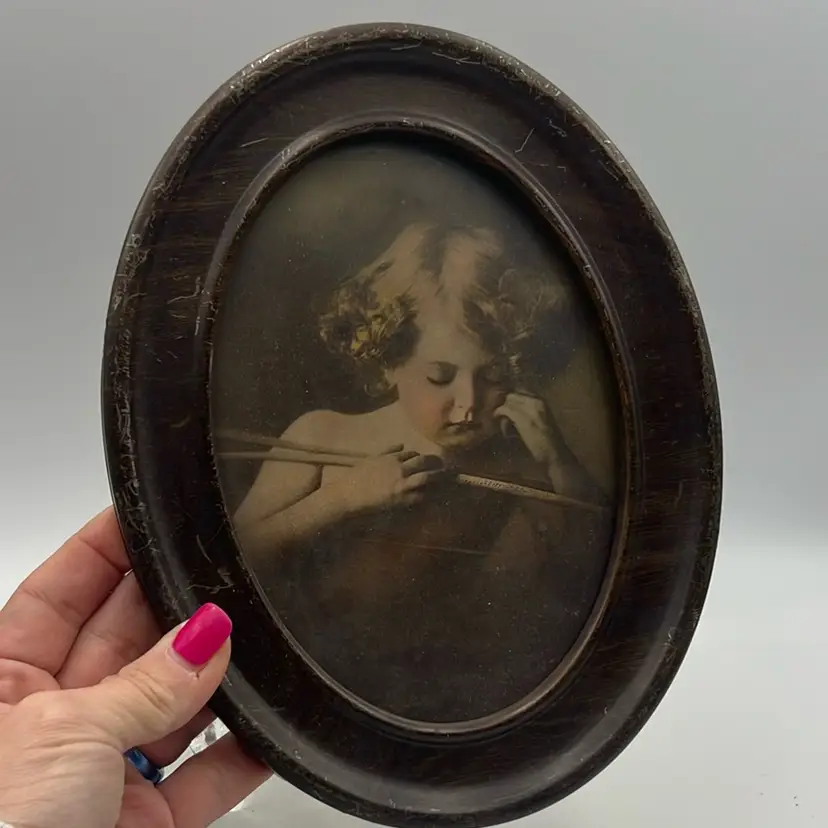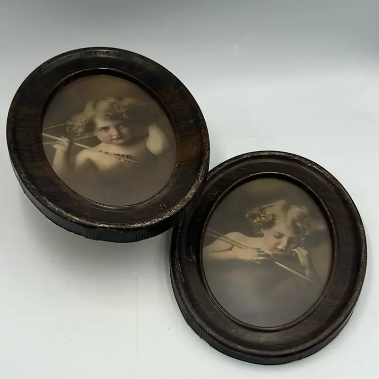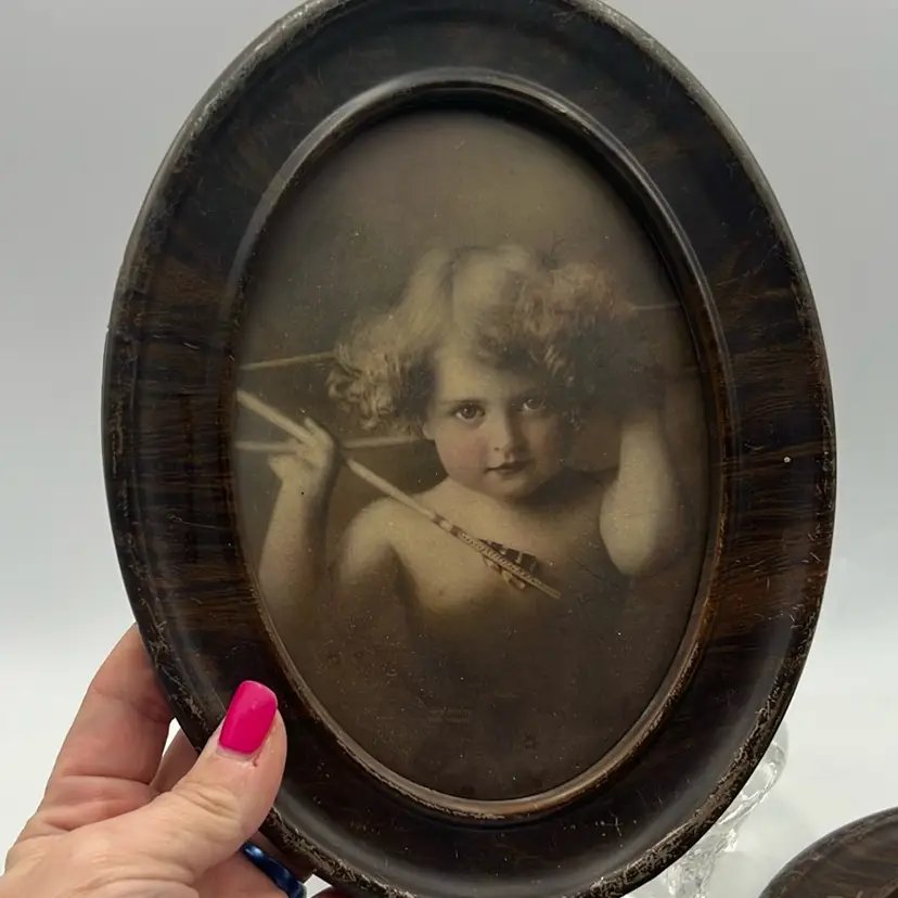 Antique Cupid Asleep & Cupid Awake Oval Framed Photos 1897 8.75x6.75