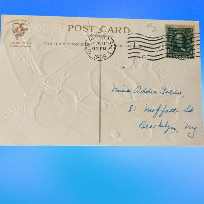 International Art Publ Co, divided back, printed in Germany; posted 1908 (NY, NY). Good condition (says “With love, Ethel” on front).