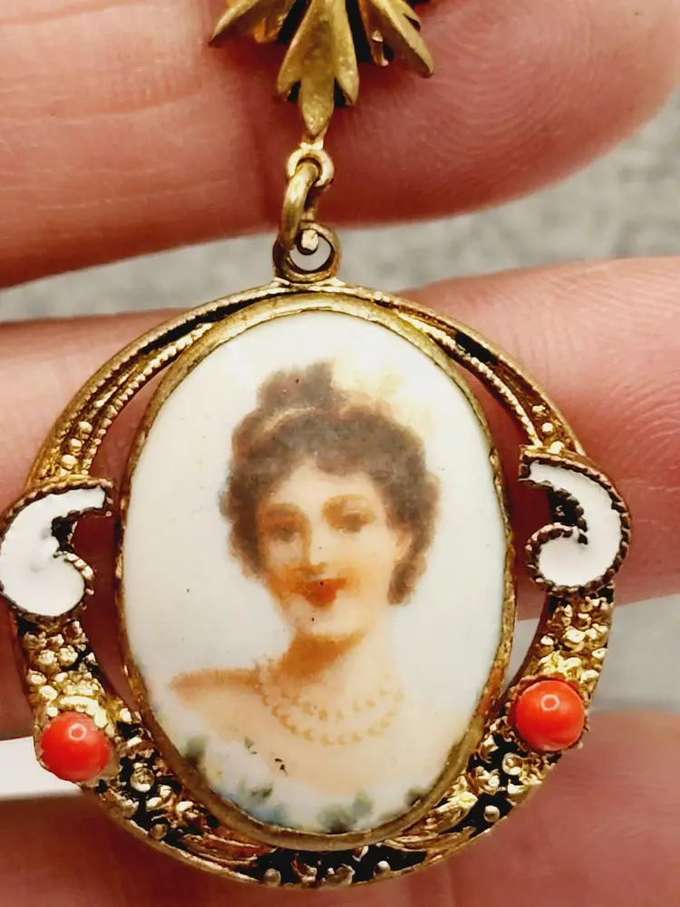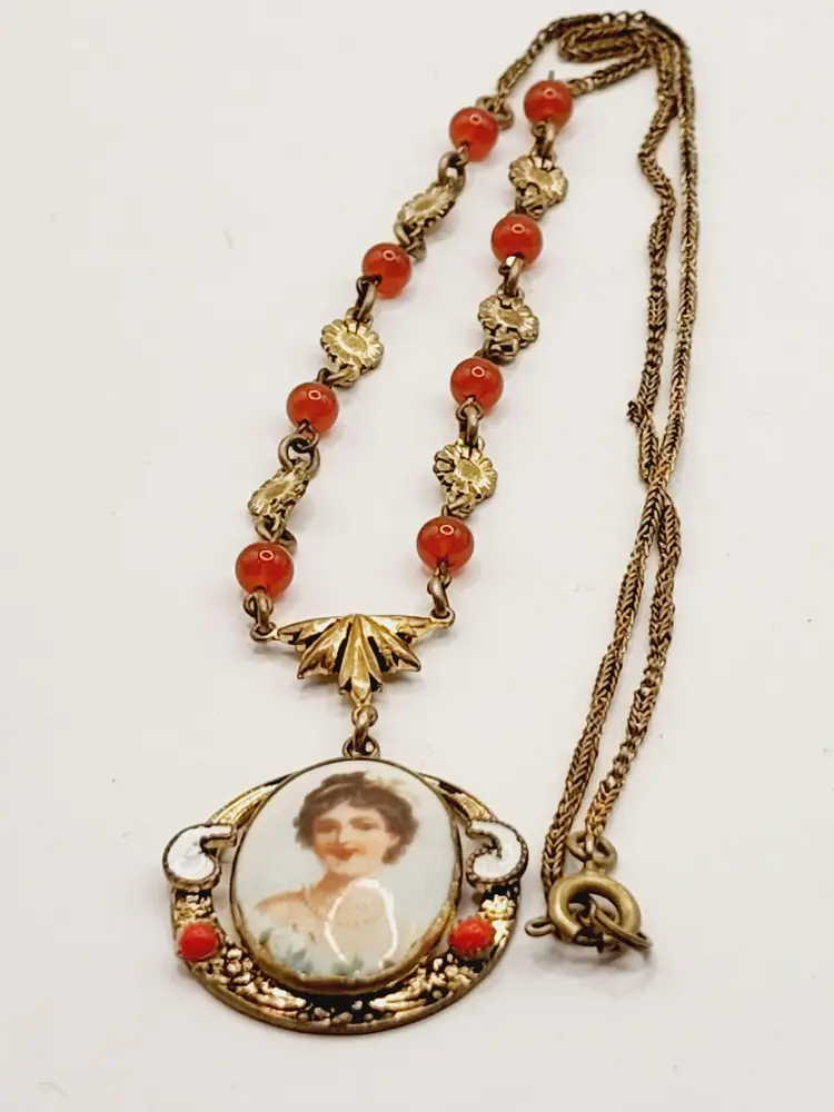 This Antique Czechoslovakian necklace features a Lady portrait in porcelain pendant set into a brass frame with carnelian glass cabochon and white enameled swirl on each side. Fabulous details, nice patina to the brass. Necklace is fox tail chain and the neckline is adorned with alternating carnelian glass beads and flower metal accents. Enamel looks pretty good, looks like portrait is transfer.