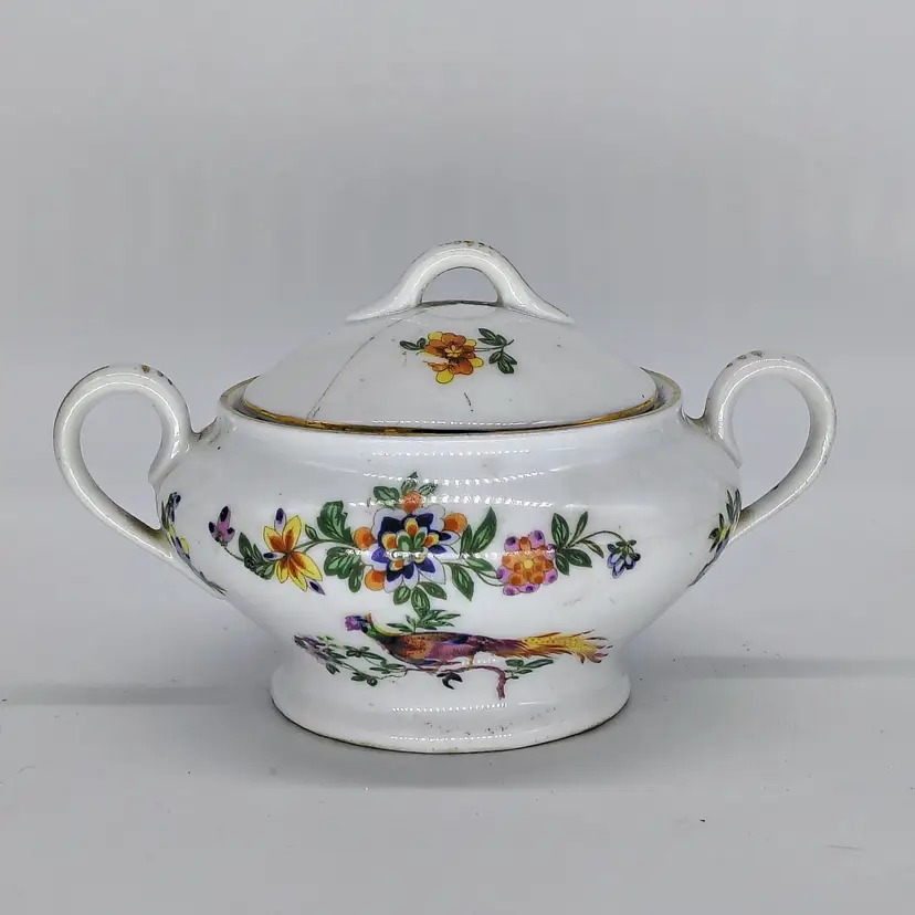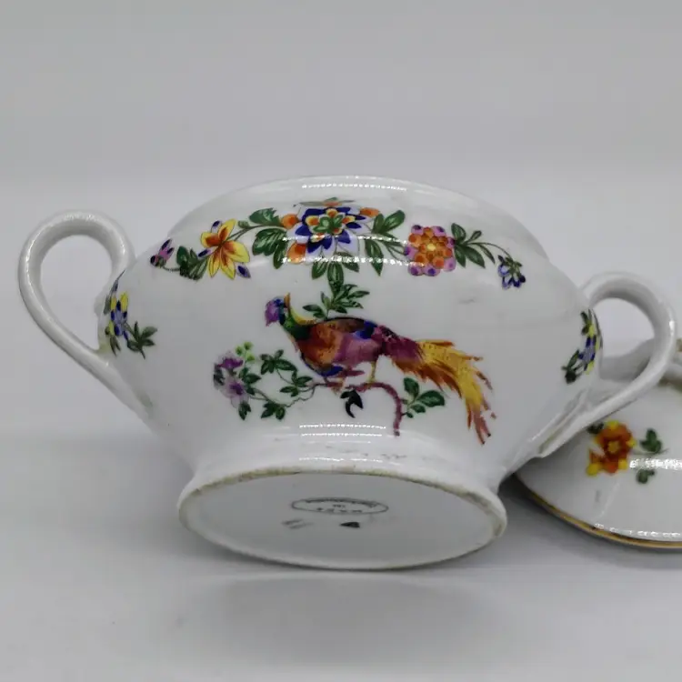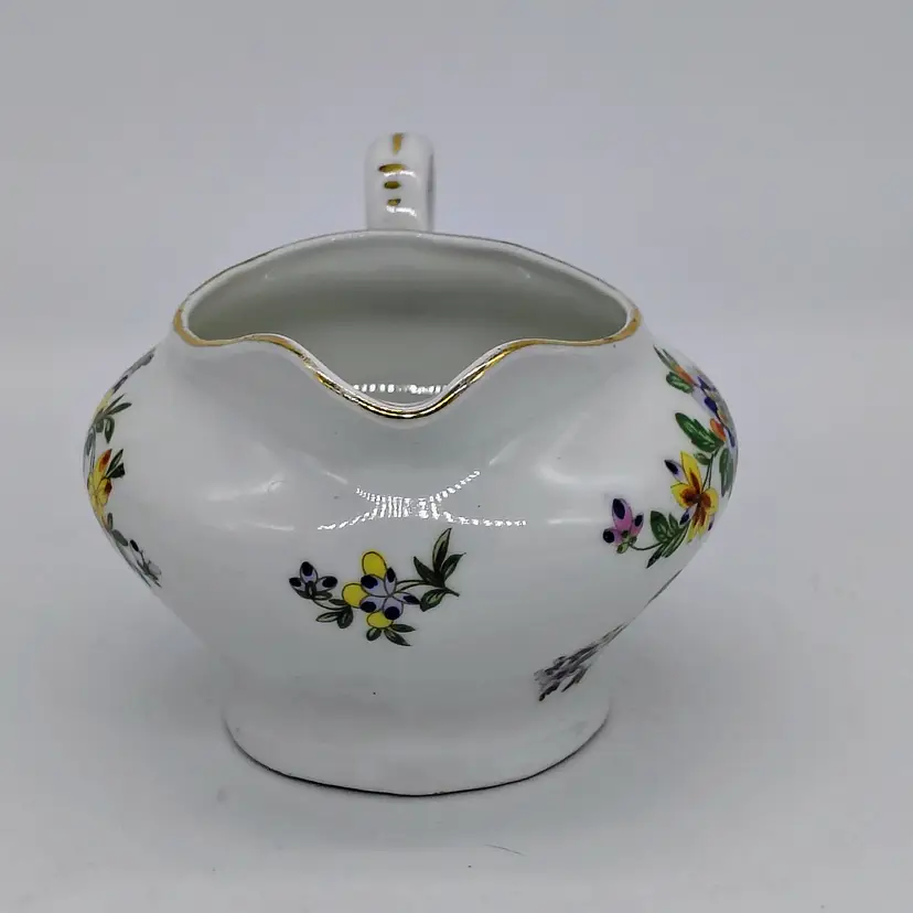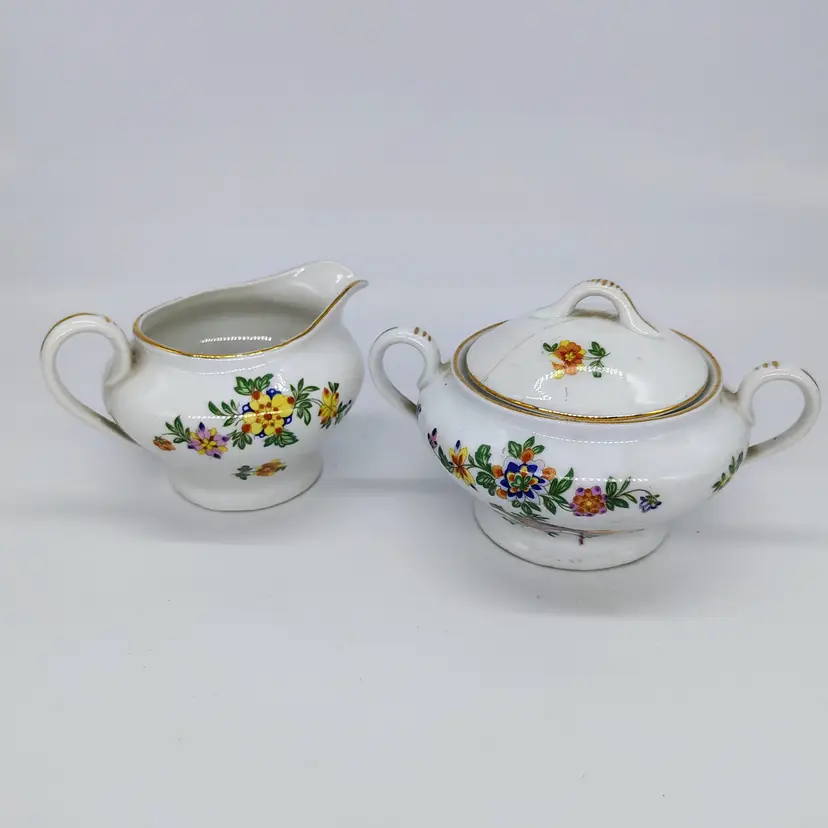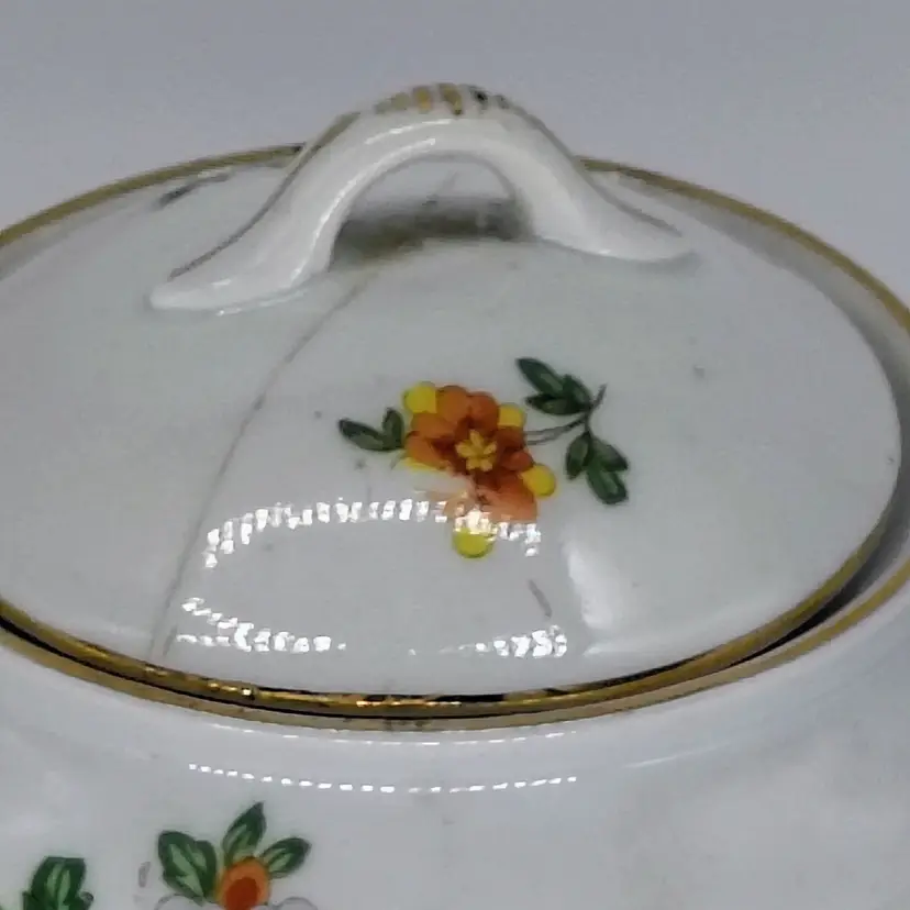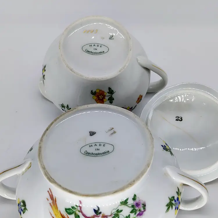 This set is marked Made in Czechoslovakia with a serial number. This piece is delicate and old. There is a hairline crack across the top of the sugar boat lid. The structure remains intact. No further chips or cracks.