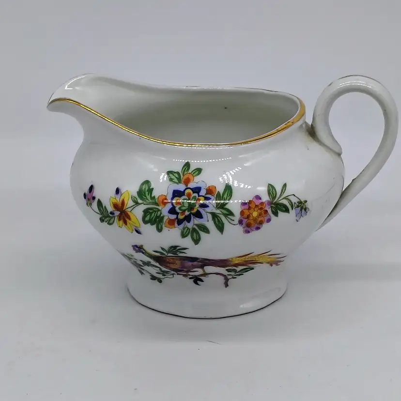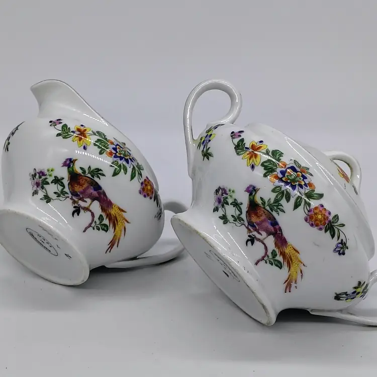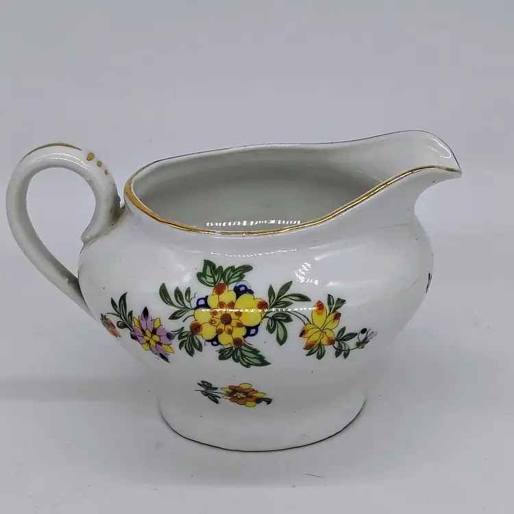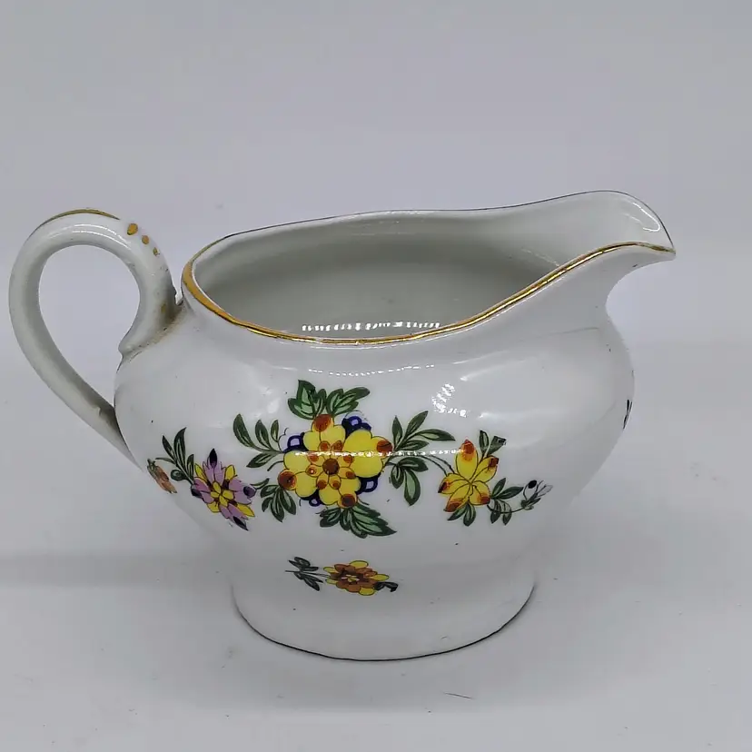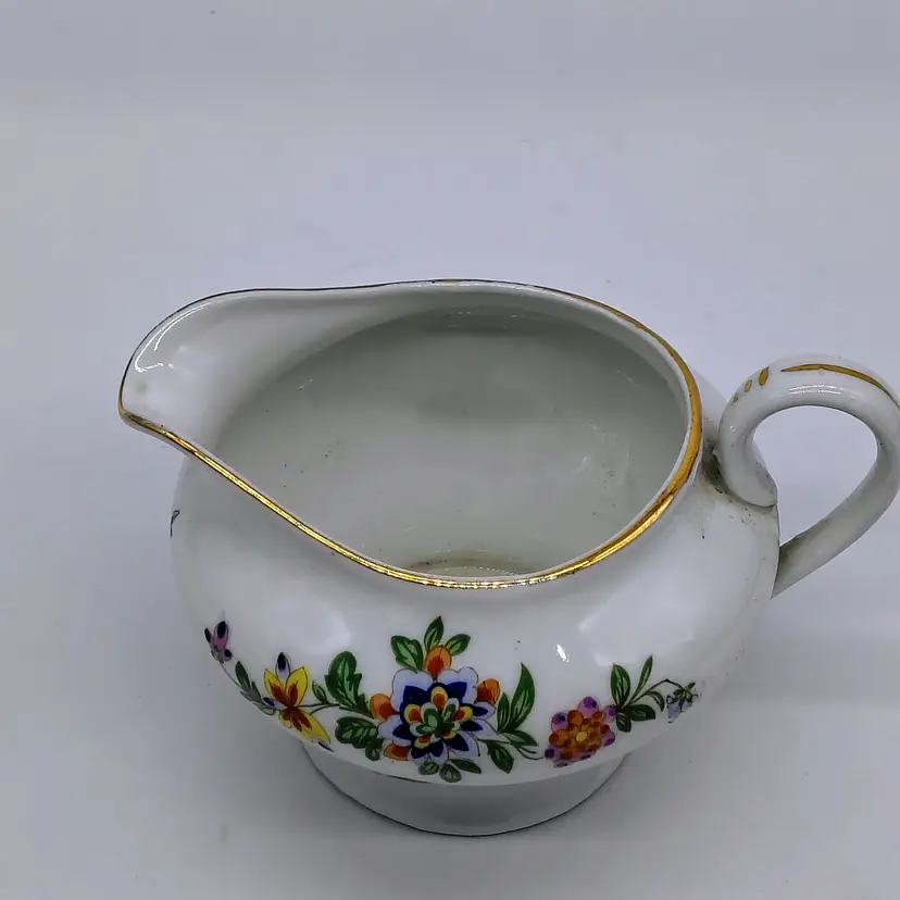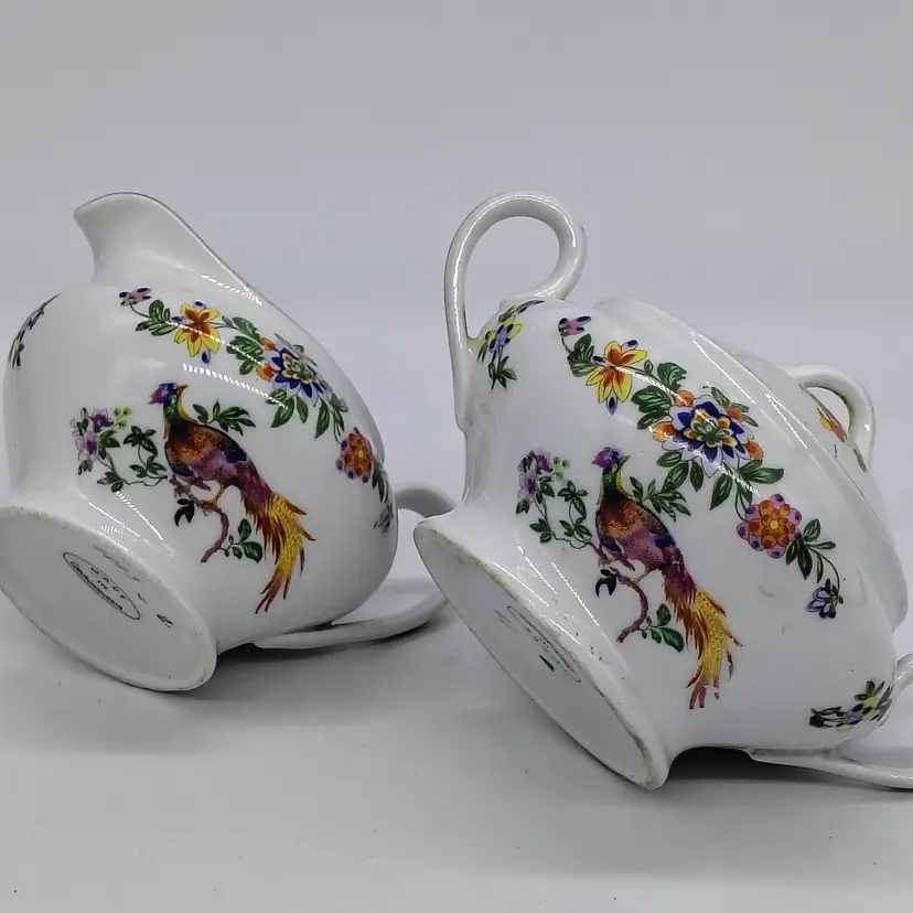 This set is marked Made in Czechoslovakia with a serial number. This piece is delicate and old. There is a hairline crack across the top of the sugar boat lid. The structure remains intact. No further chips or cracks.