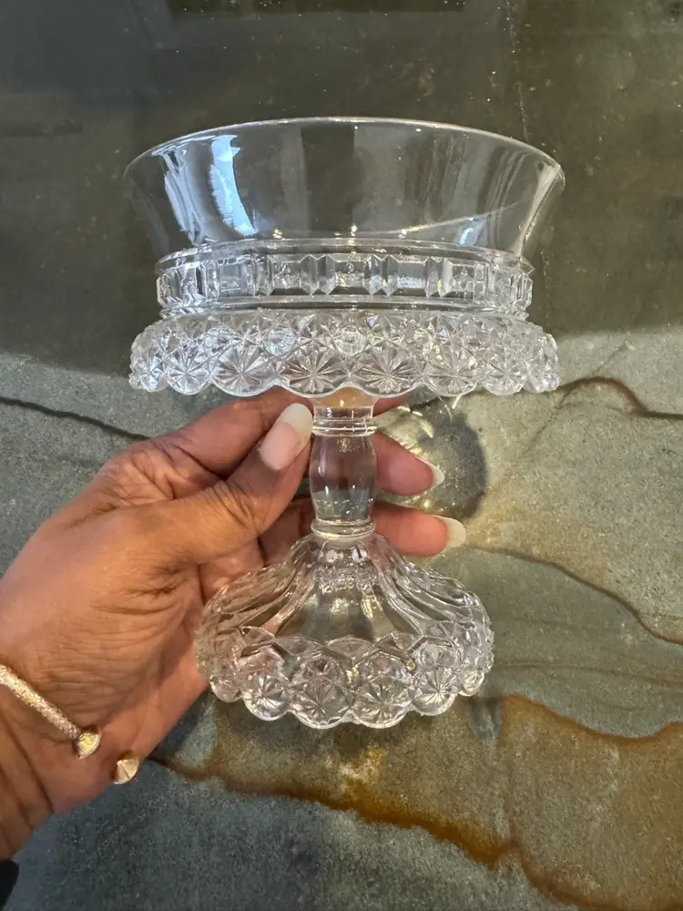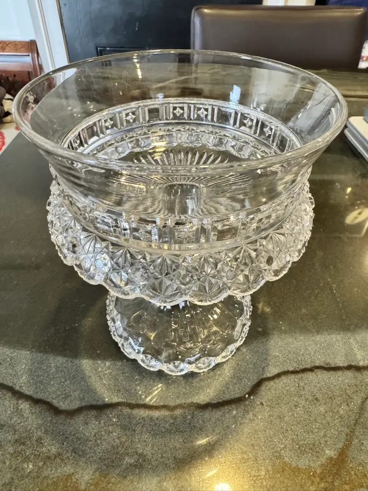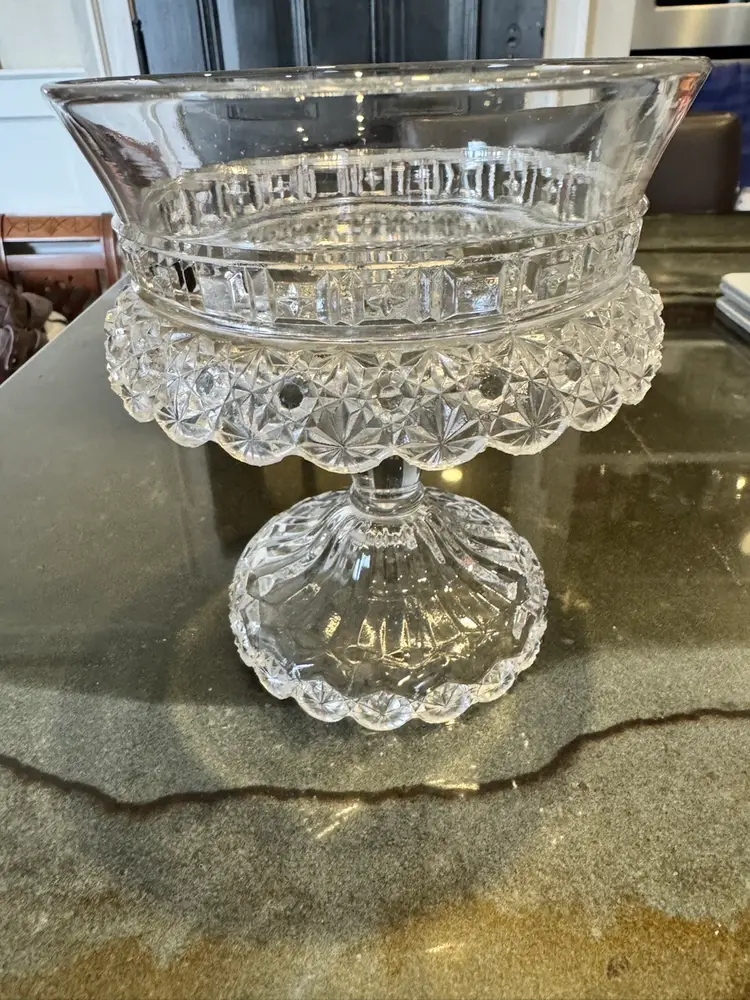 Beautiful antique compote pedestal bowl by Dalzell, Gilmore & Leighton dating back to the 1880’s. Starred block pattern adds a touch of elegance and class. Perfect for displaying fruit, stylish candy dish. EUC. 12.5cm x 15cm