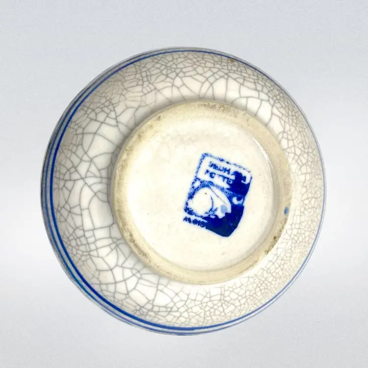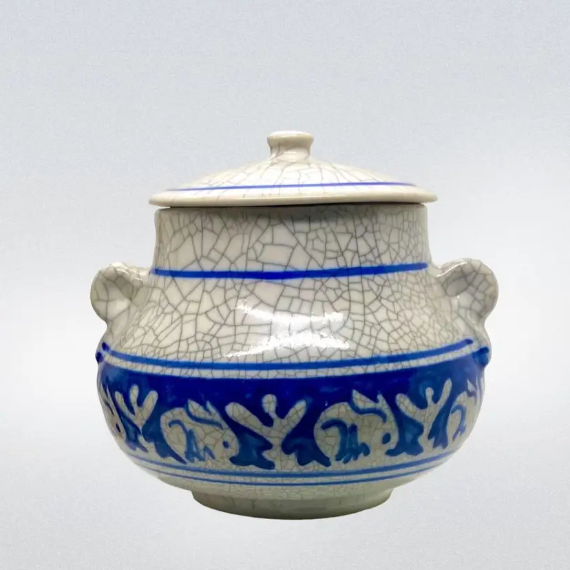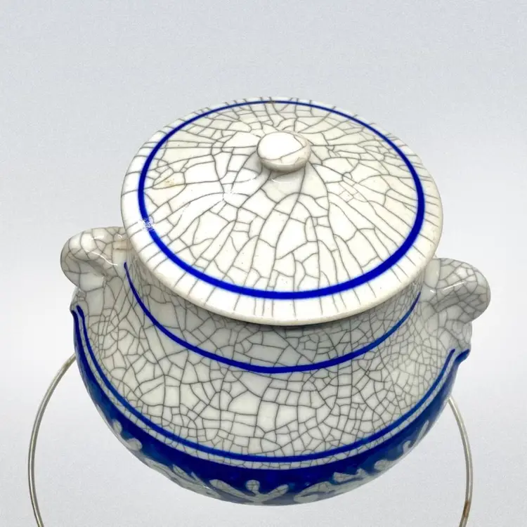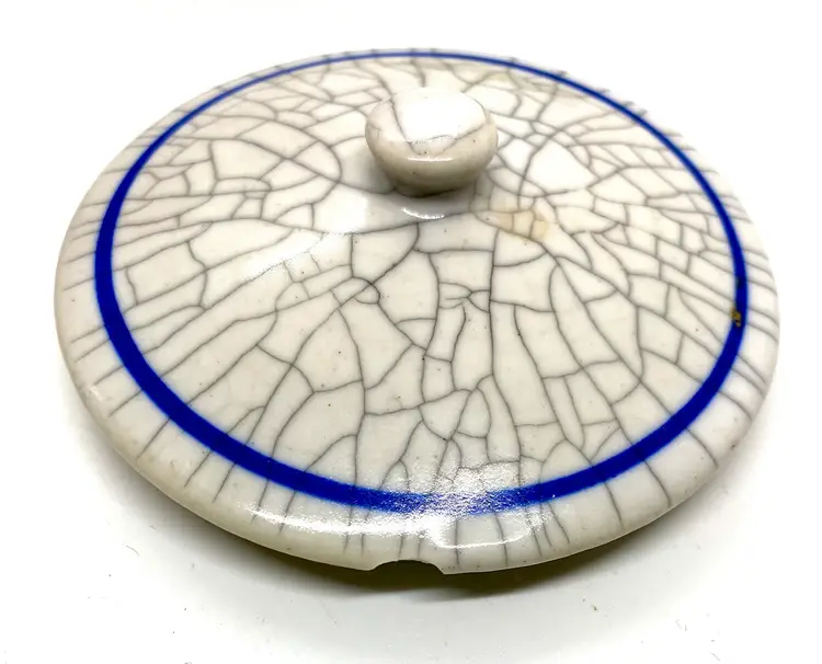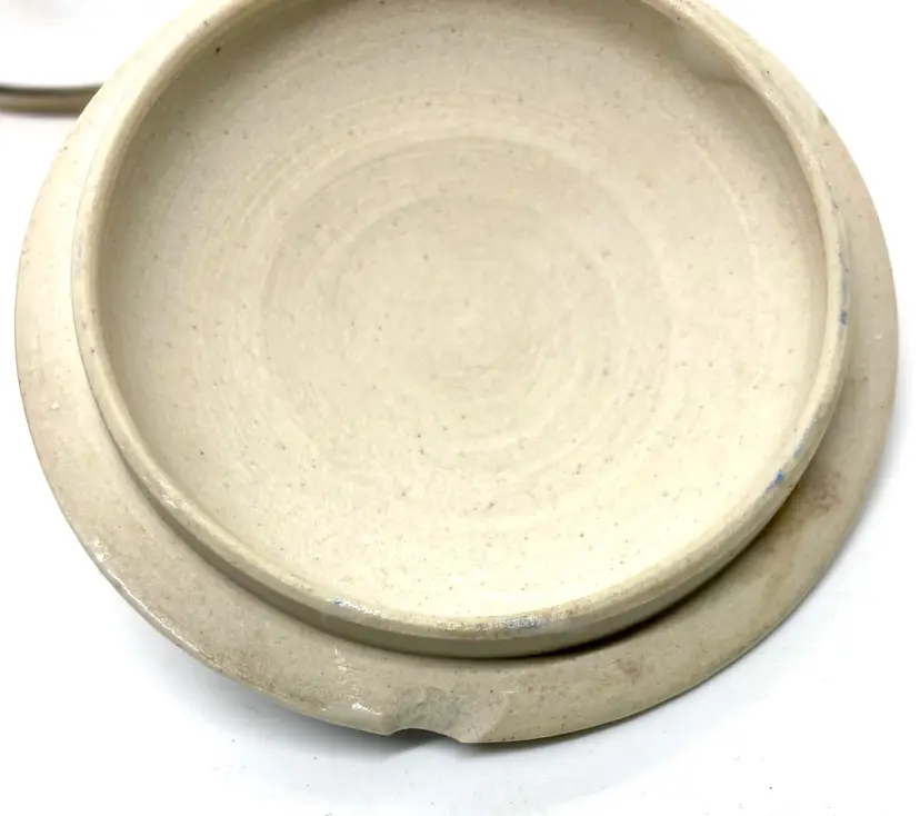 This is antique sugar bowl from Dedham Potters dating from the early 1900’s. It has defects. There is a chip in the cover and a crack at the rim of the bowl. It has been used and is still functional. If it will be used for display only, it will look perfect if you put the lid chip in back. It is stamped with the blue Dedham Pottery ink stamp on the bottom. It measures approximately 3.75” high by 4” wide.