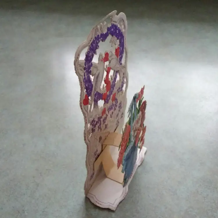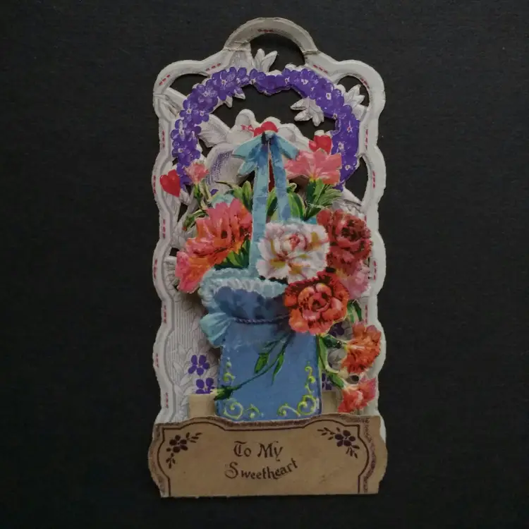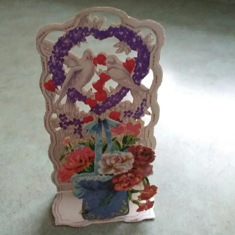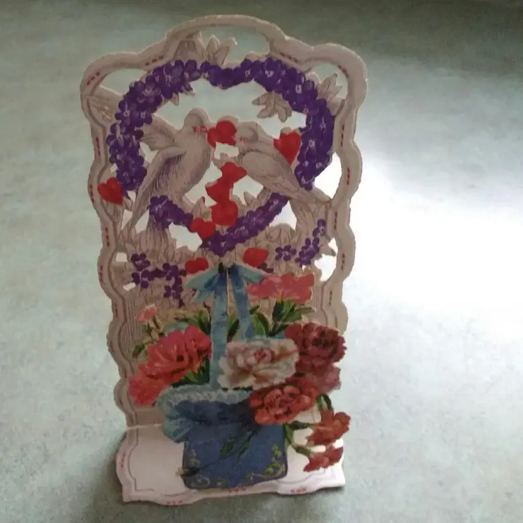 Celebrate timeless romance with this antique die-cut Valentine card featuring charming doves and vibrant flowers. The intricate design and rich colors make it a delightful piece of ephemera, perfect for collectors or as a nostalgic gift. Add a touch of vintage charm to your collection with this beautifully crafted card.