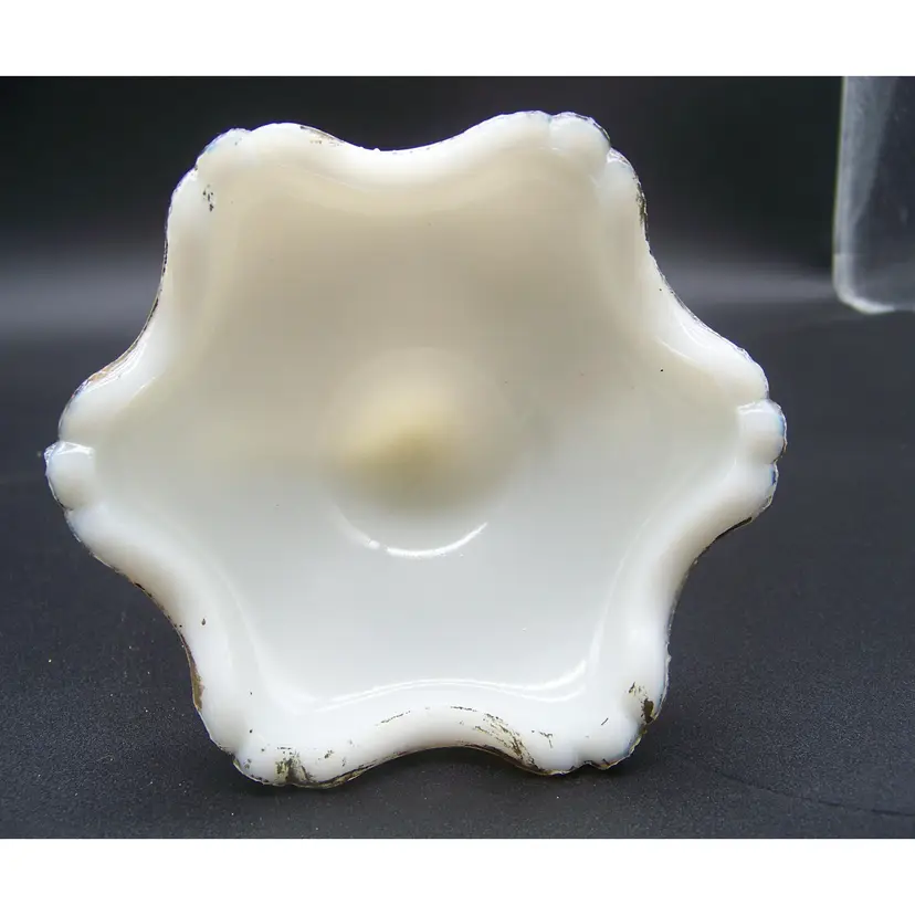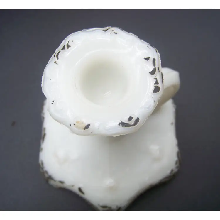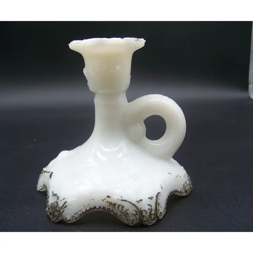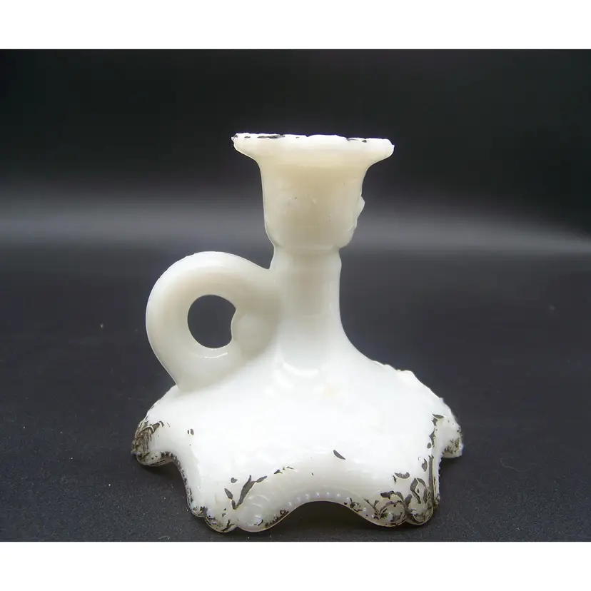 Antique Dithridge milk glass candleholder with painted trim that is worn. Manufactured between 1903-1906. Lovely piece with a raised floral design and a painted trim around the base and rim. The candleholder is 4" tall and the base is 4.5" diameter. No chips or cracks but I do feel a slight roughness as I run my hands over the rim and base. Purchased at an auction held in home in historic Fan district of Richmond, VA