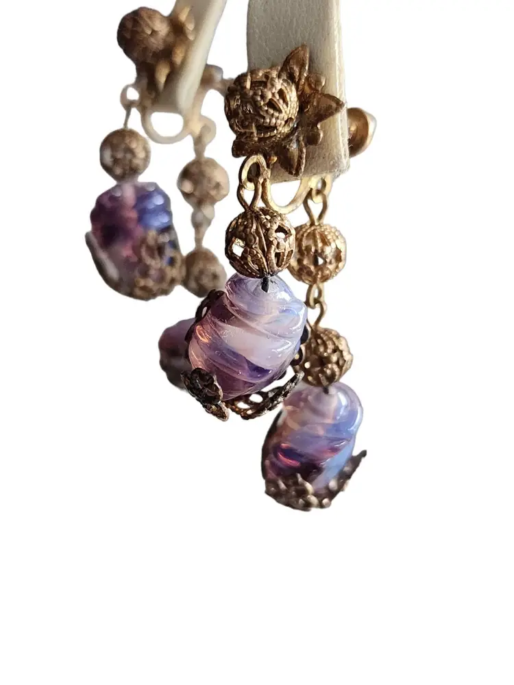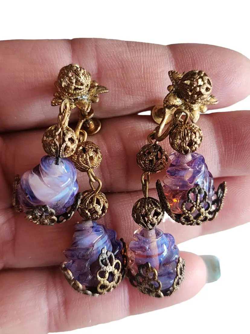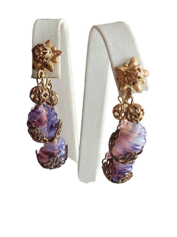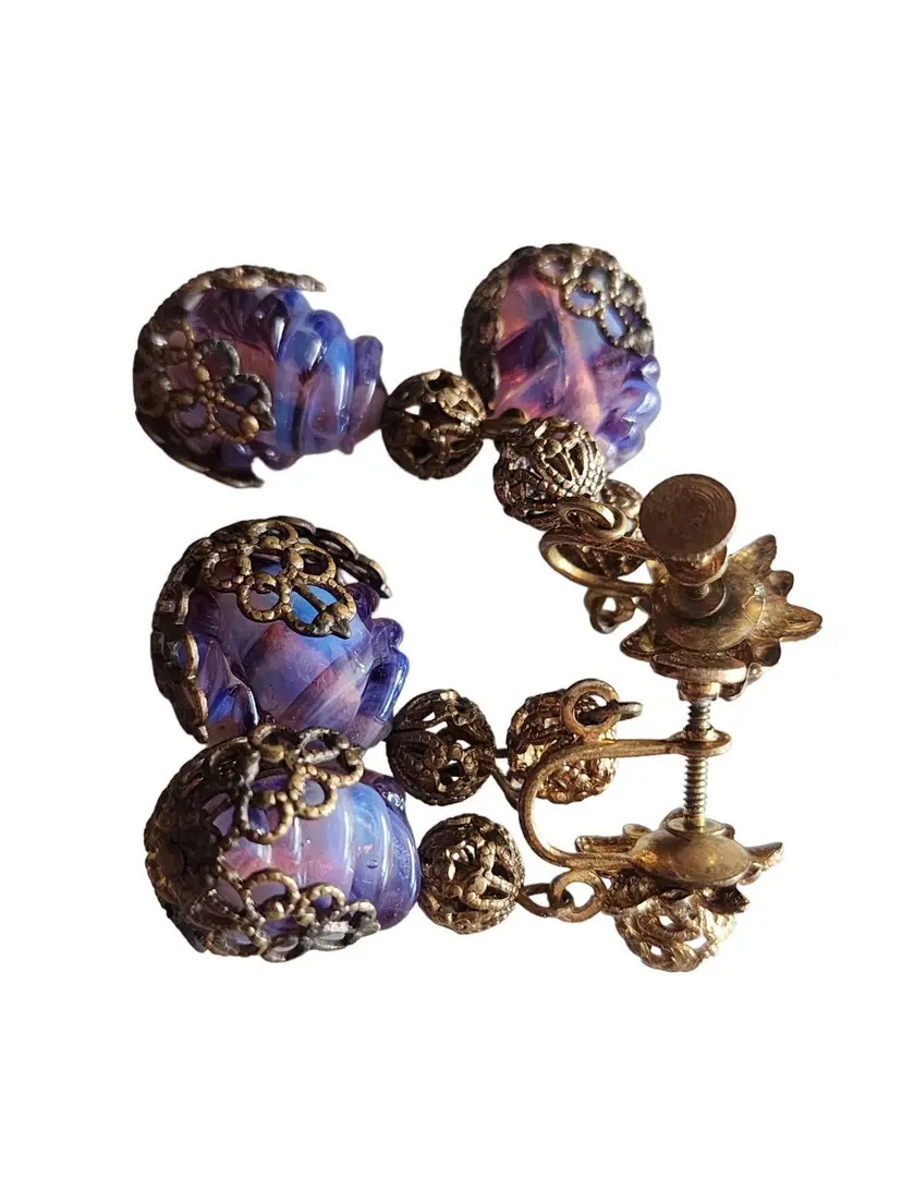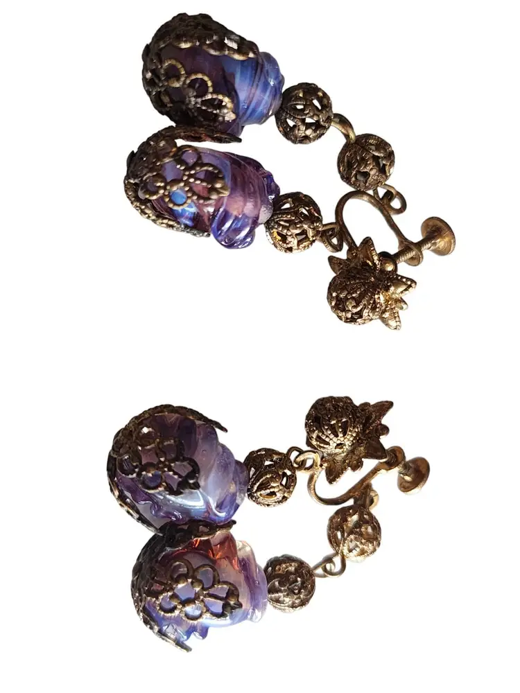 Size: 2" Color: Gold, Purple Condition: Very good condition Signed: None Details: These glass stones are fabulous and quite unusual. Possibly Czech.