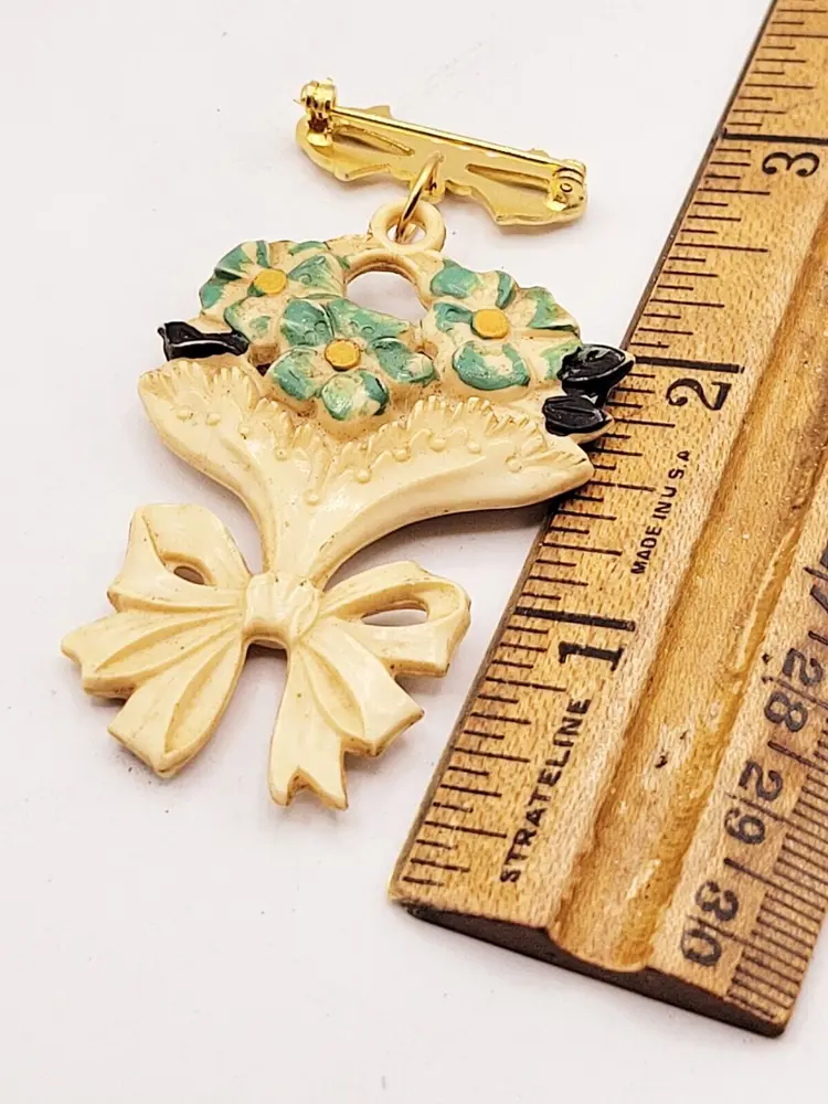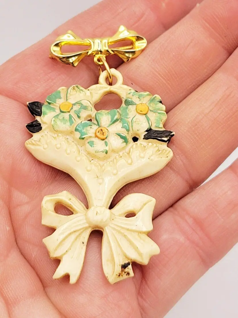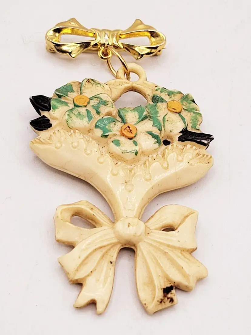 Antique Double Sided Celluloid Painted Flower Basket Dangle Brooch