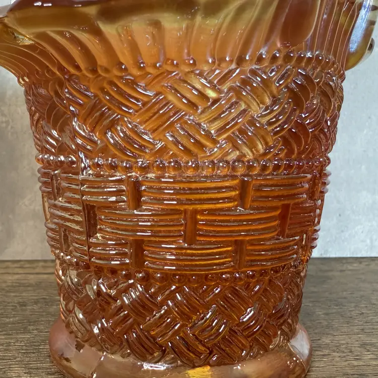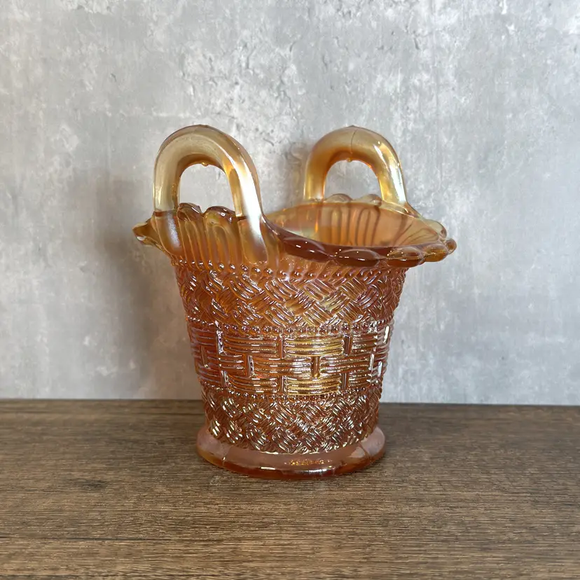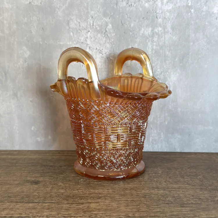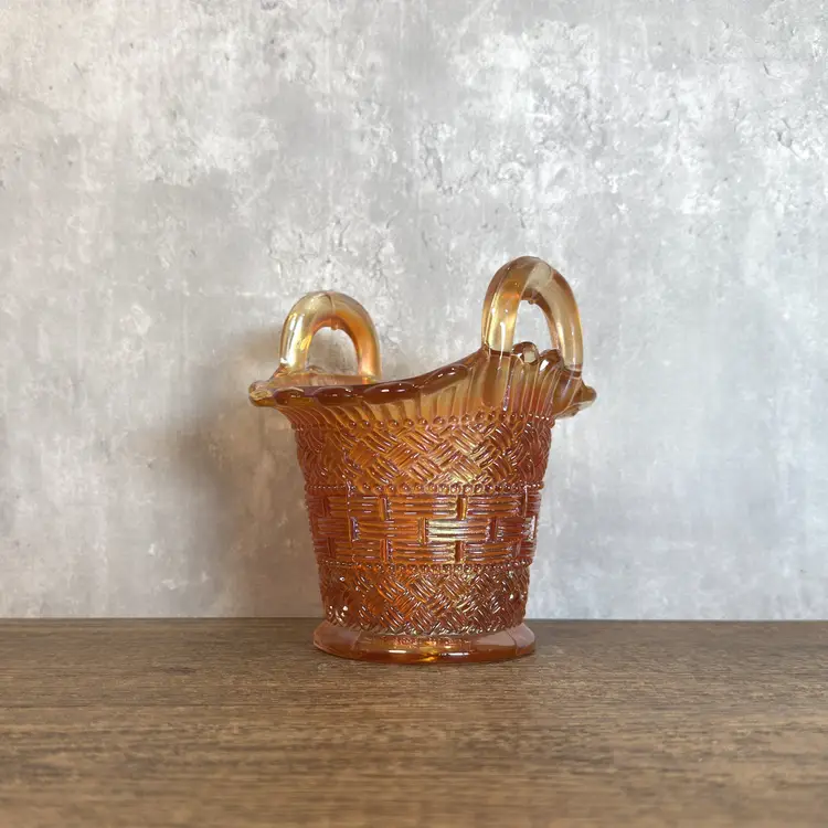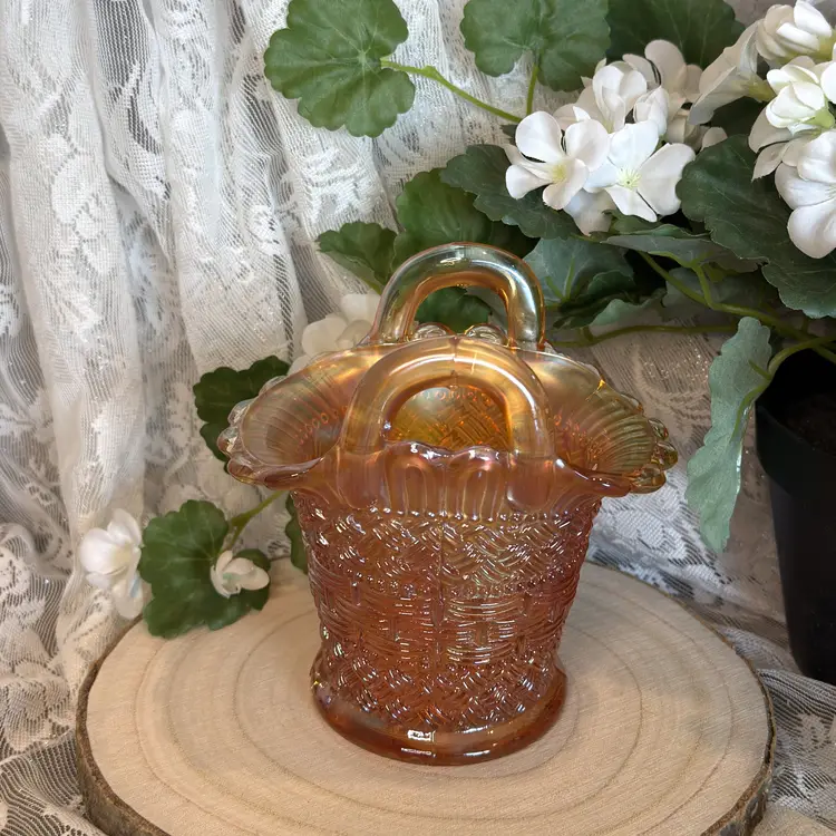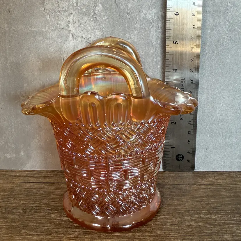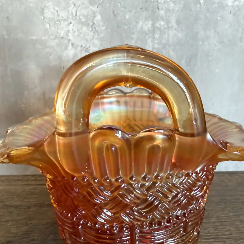 This charming antique basket is a beautiful example of Dugan Glass craftsmanship from the early 20th century. Featuring the Basketweave & Beads pattern, this pressed glass piece shimmers in classic marigold carnival glass with a rich, iridescent finish and a scalloped ruffle edge.