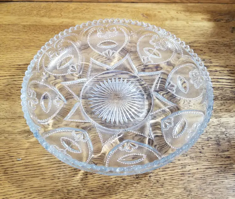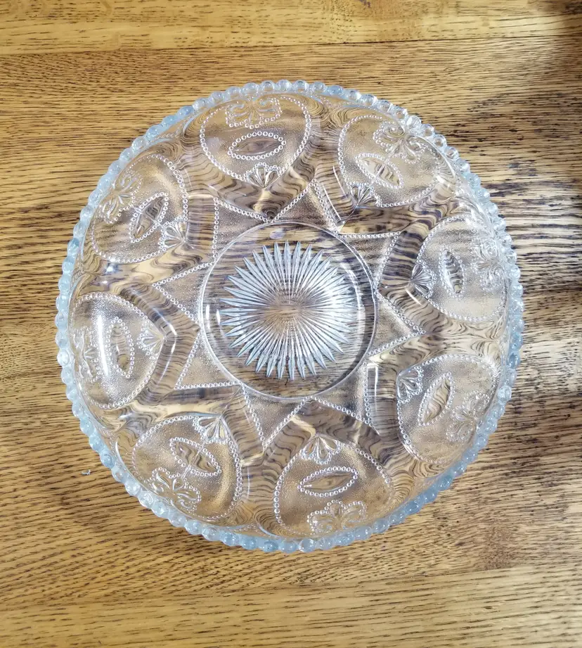The bowl measures approximately 9 inches wide and 2 inches tall and is made of clear pressed glass with excellent clarity. The beaded rim and richly patterned sides make this a standout example of early American glassmaking. Very good vintage condition. No chips or cracks noted. Typical light surface wear consistent with age. Please review all photos for details, as they are part of the description.