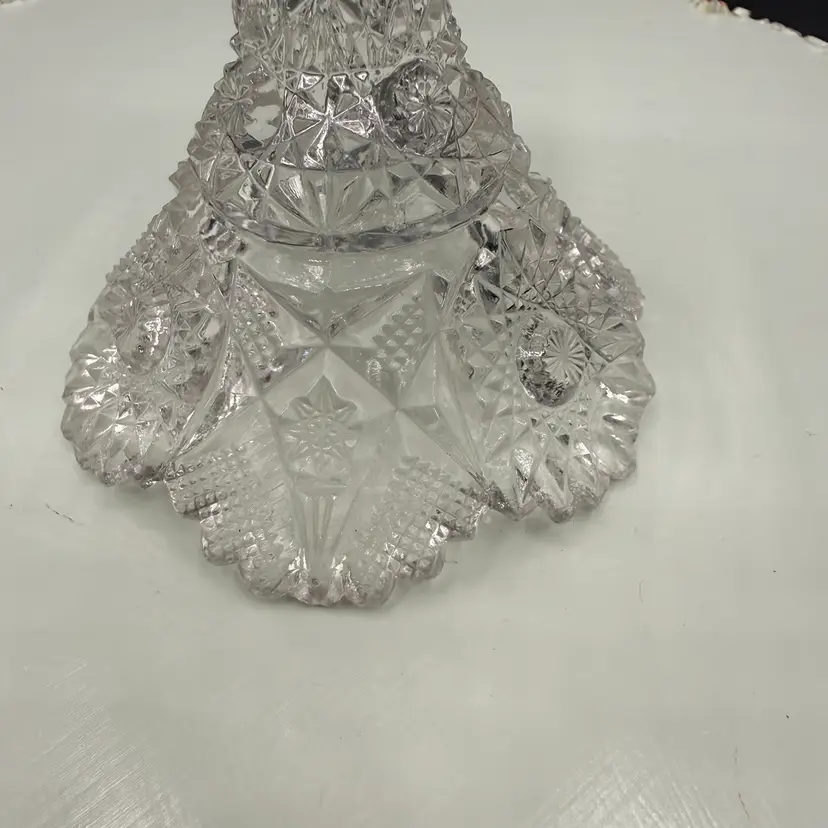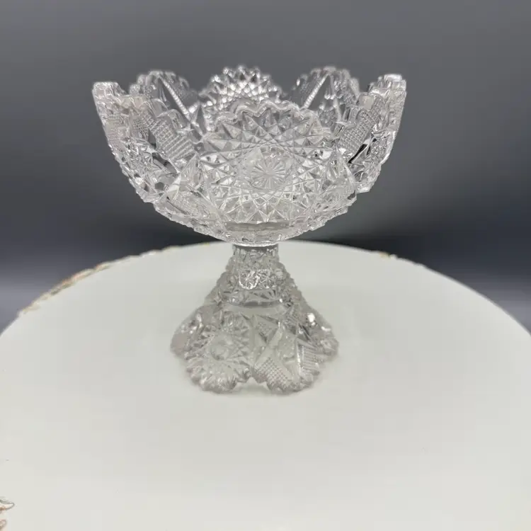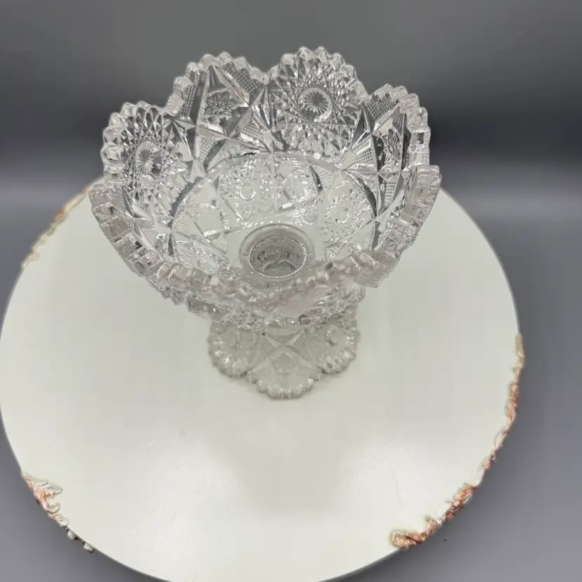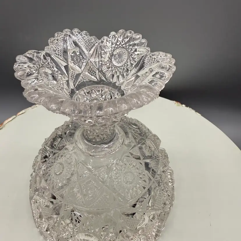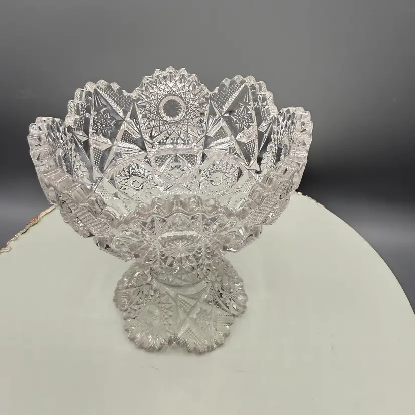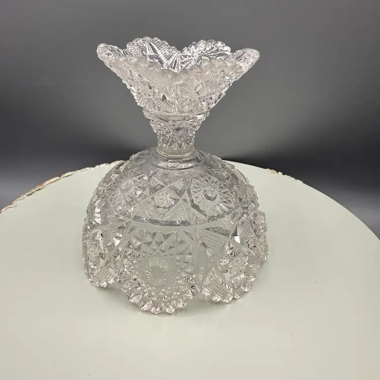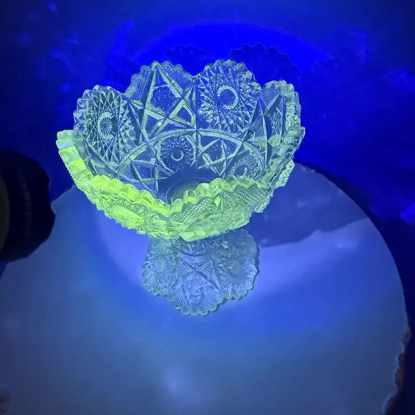 Contains manganese and glows under blacklight. A genuine piece of American history, over 100 years old. a piece produced in 1914 or 1917. Features the detailed #666 "Deep Cut" (Sunburst & Arrows) design. Perfect as a candy dish, fruit bowl, centerpiece, or part of an EAPG collection.