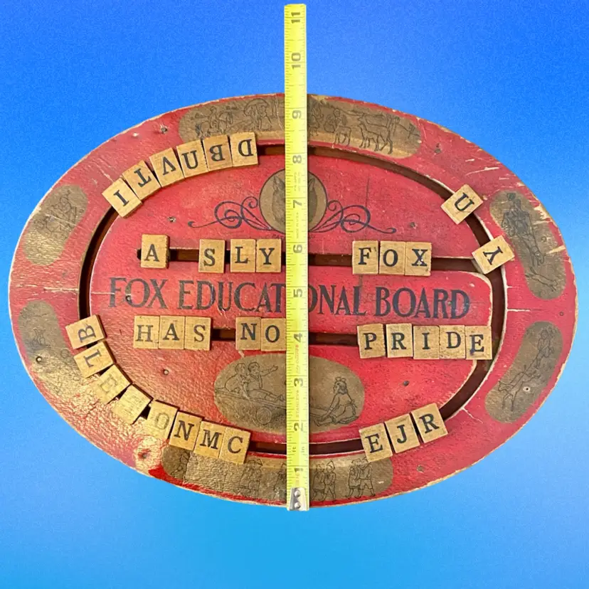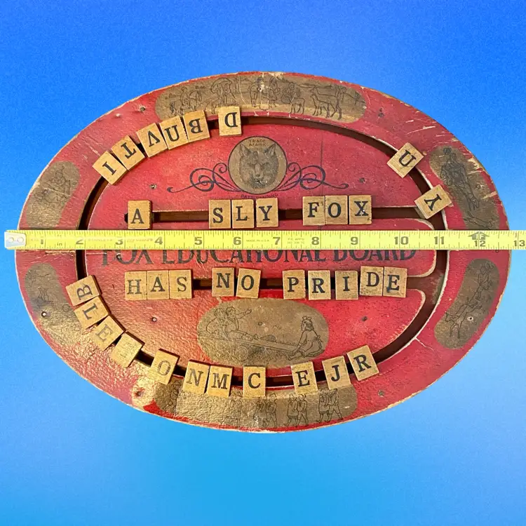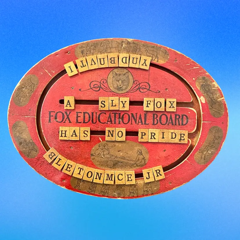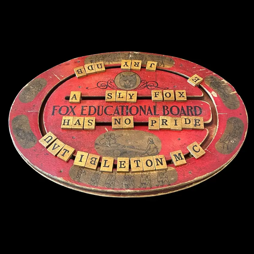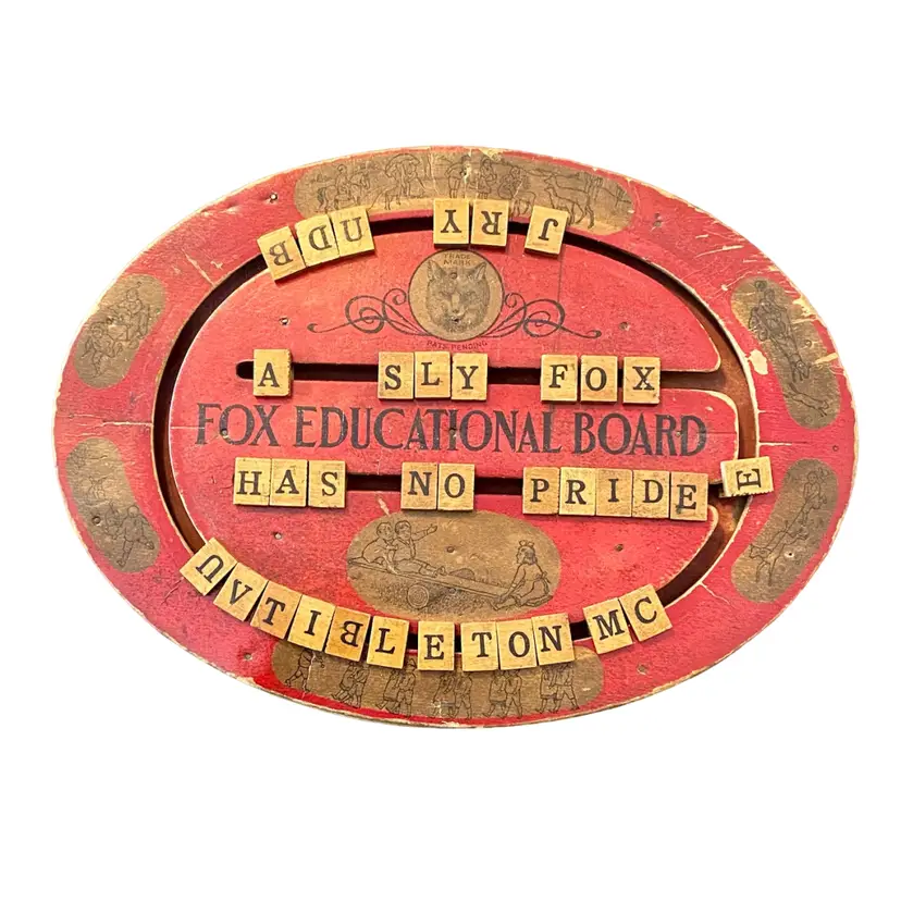 This is an antique red, oval handheld spelling board. There are moveable letter tiles to show how to use letters to spell out words. Decorated with children engaged in play. This spelling board was manufactured by Fox Toys. The Fox trademark is featured in the upper center with Pats. Pending beneath. Item measures 12.75” wide x 9.5” from top to bottom. Educational Boards or Tables first appeared in the US in 1840 as teaching devices for students to move blocks with letters on tracks to assemble words or even sentences. These educational manipulative toys, like blocks have been popular learning tool in both schools and homes and can still be found in secondhand stores and online. In the 1880's, separate boards were created for spelling and for numbers to create simple math problems. From 1912 to 1917 childhood friends John H. Fox and Horatio G. Cress patented educational boards that combined letters on one side and numbers on the other side. Popularly called speller/number boards, letter/counting boards, and alphabet boards, they were made of fiberboard, metal, combinations of slate and wood, and later plywood, heavy cardboard, or plastic. This early speller is in good overall antique condition with evidence of wear consistent with use and age.