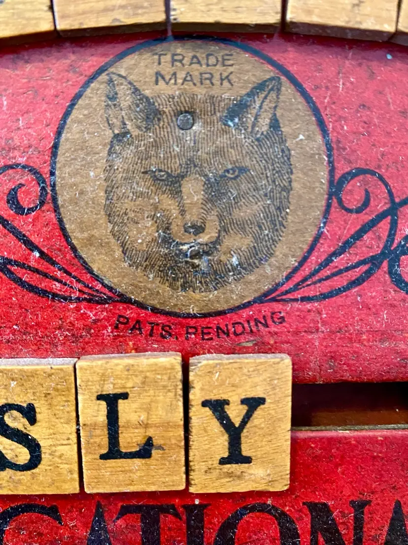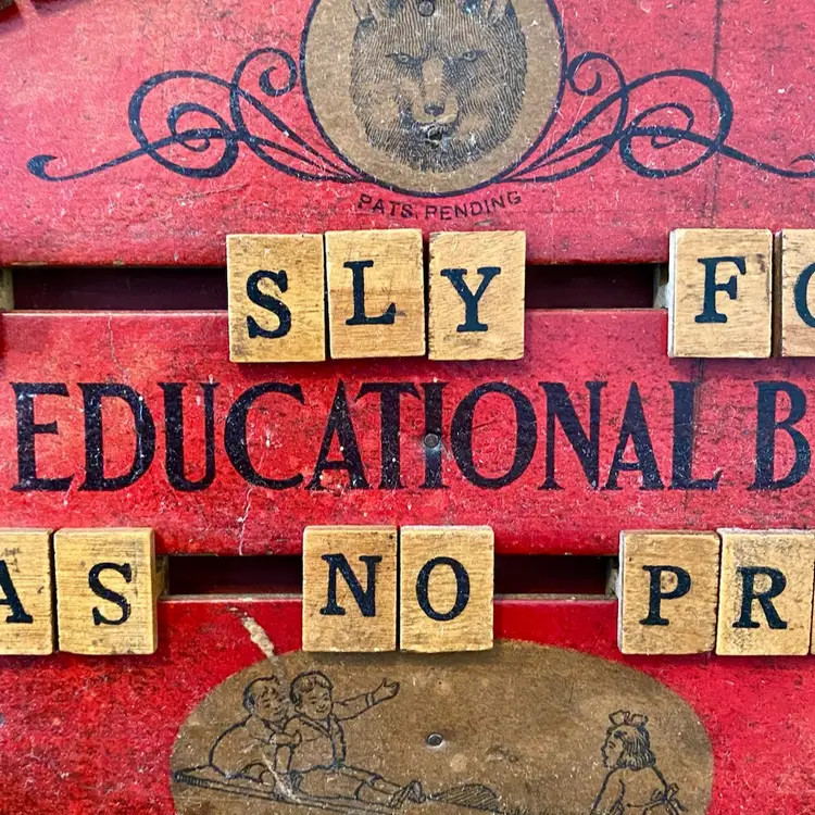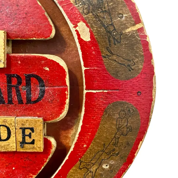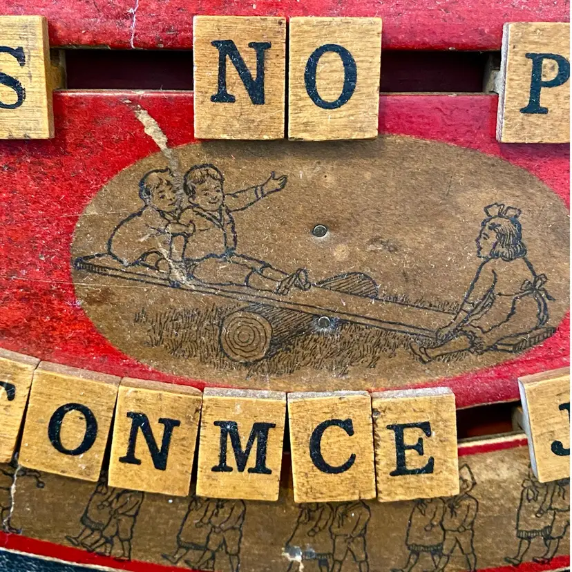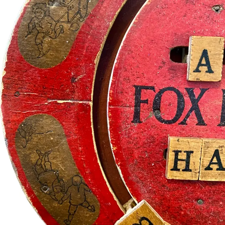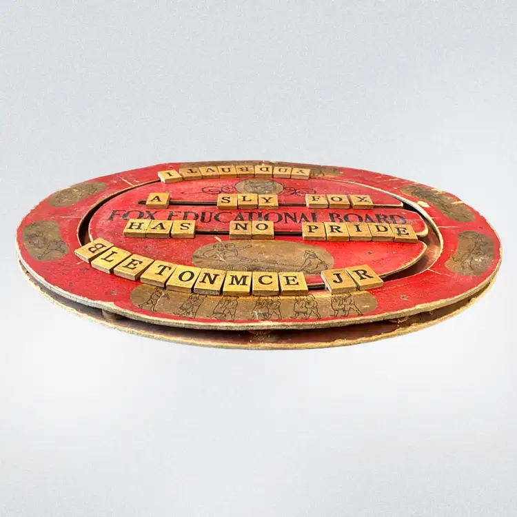 This is an antique red, oval handheld spelling board. There are moveable letter tiles to show how to use letters to spell out words. Decorated with children engaged in play. This spelling board was manufactured by Fox Toys. The Fox trademark is featured in the upper center with Pats. Pending beneath. Item measures 12.75” wide x 9.5” from top to bottom. Educational Boards or Tables first appeared in the US in 1840 as teaching devices for students to move blocks with letters on tracks to assemble words or even sentences. These educational manipulative toys, like blocks have been popular learning tool in both schools and homes and can still be found in secondhand stores and online. In the 1880's, separate boards were created for spelling and for numbers to create simple math problems. From 1912 to 1917 childhood friends John H. Fox and Horatio G. Cress patented educational boards that combined letters on one side and numbers on the other side. Popularly called speller/number boards, letter/counting boards, and alphabet boards, they were made of fiberboard, metal, combinations of slate and wood, and later plywood, heavy cardboard, or plastic. This early speller is in good overall antique condition with evidence of wear consistent with use and age.