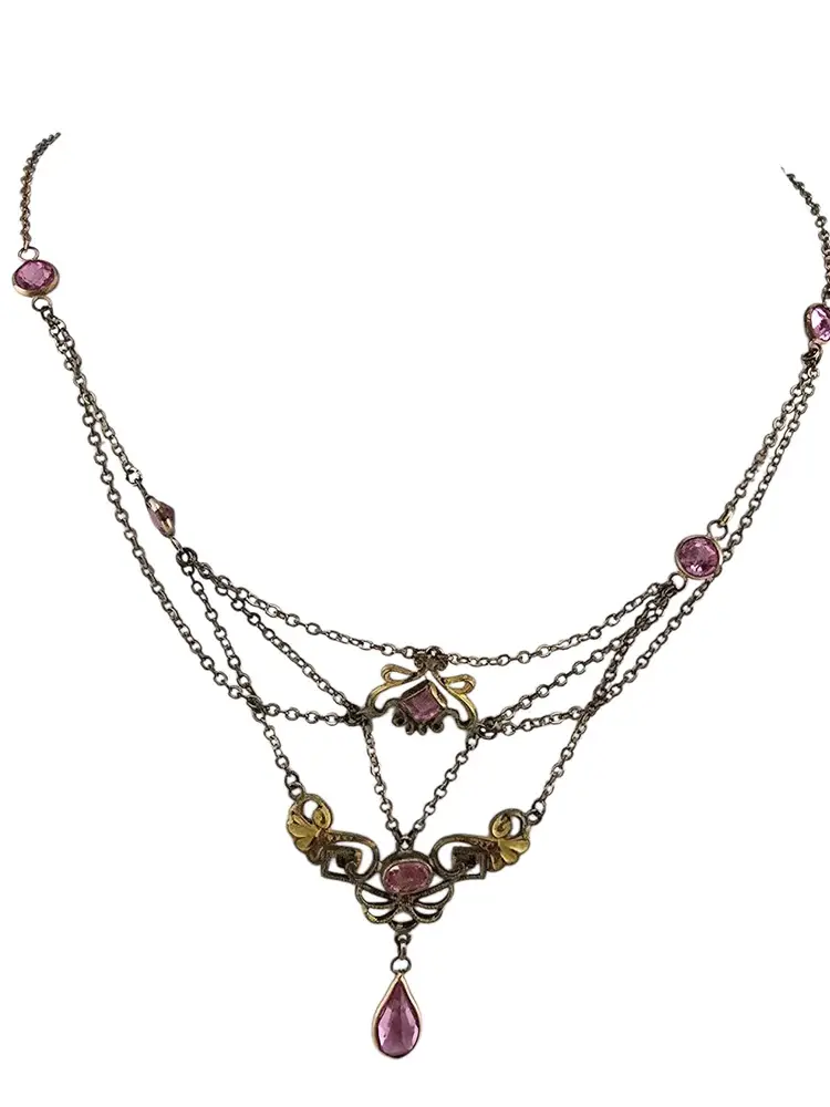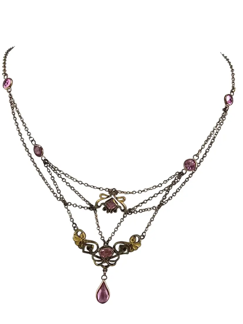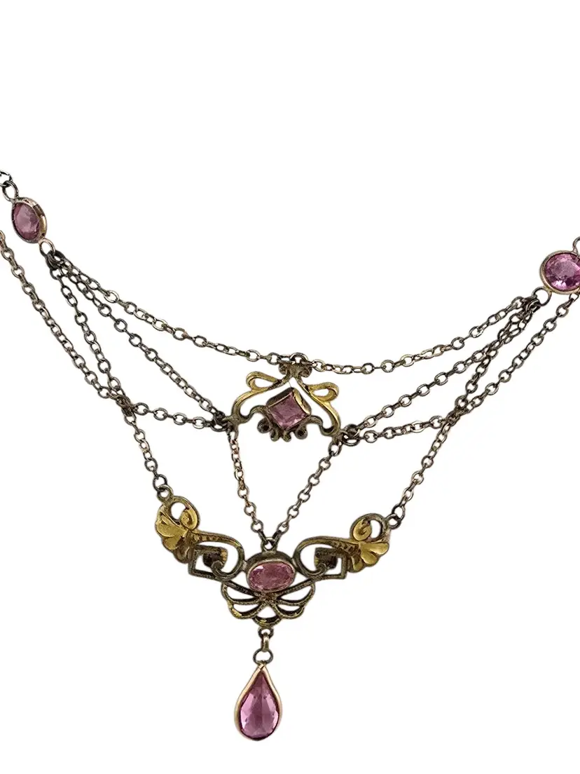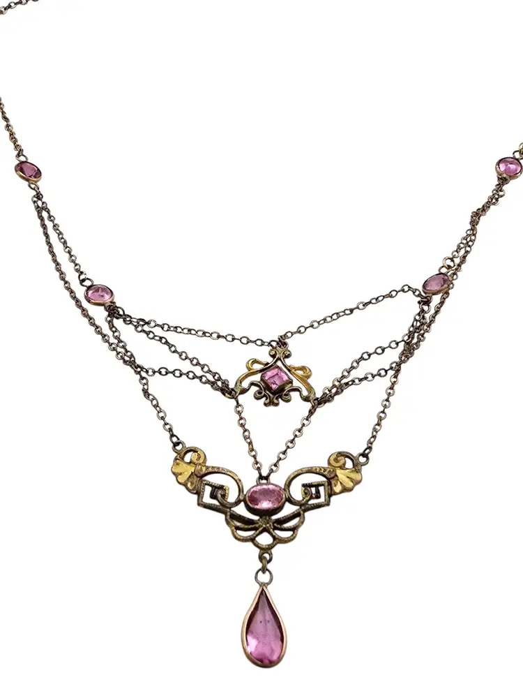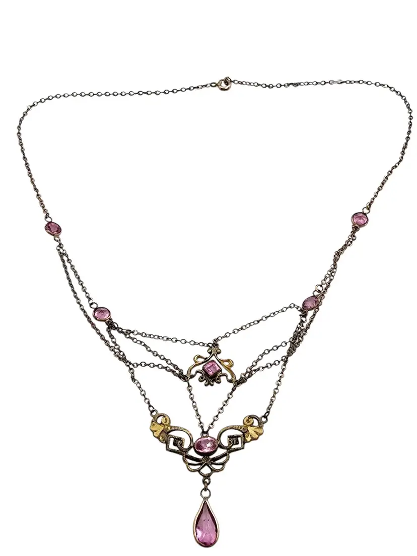 Antique Edwardian Glass Lavalier Festoon Necklace w/ Pink Faceted Glass (A8680)
