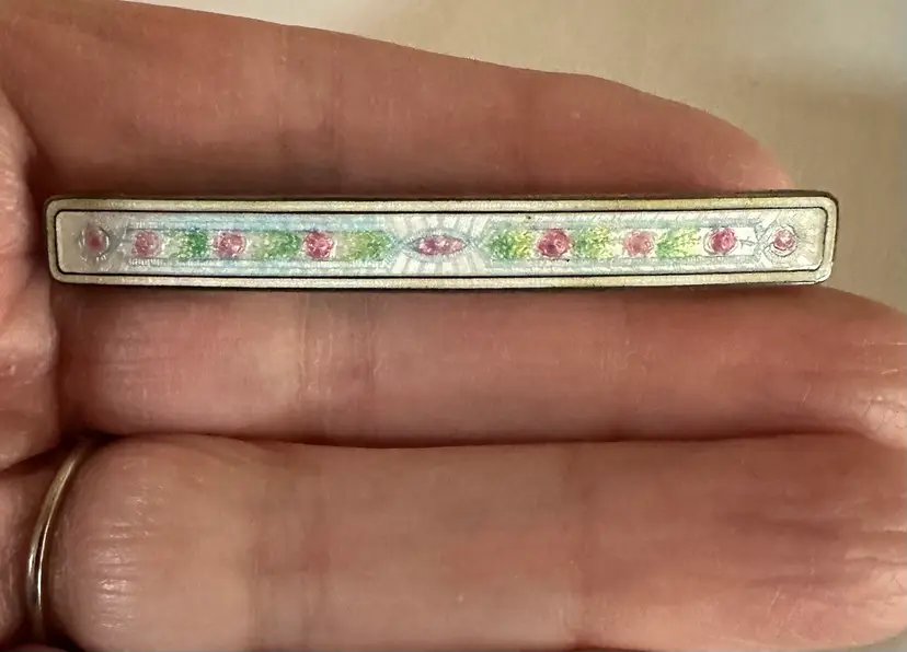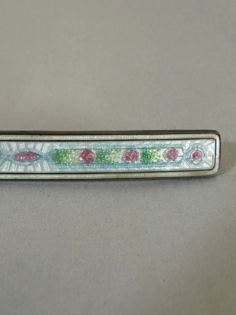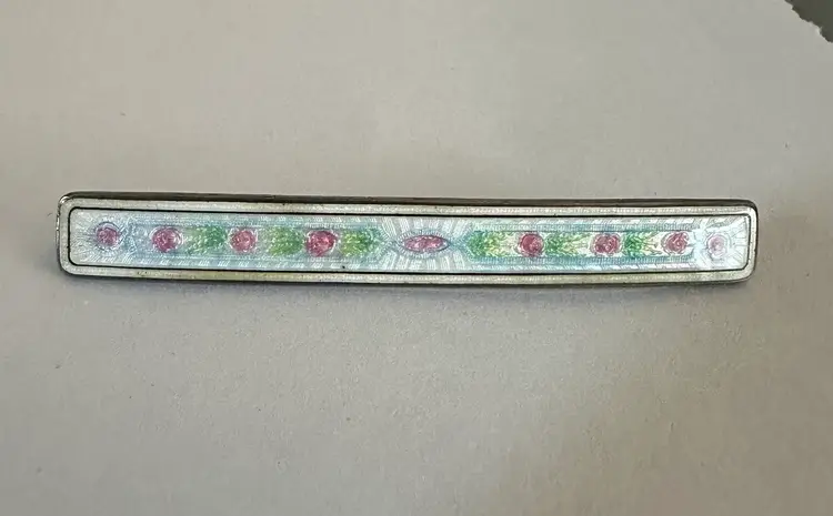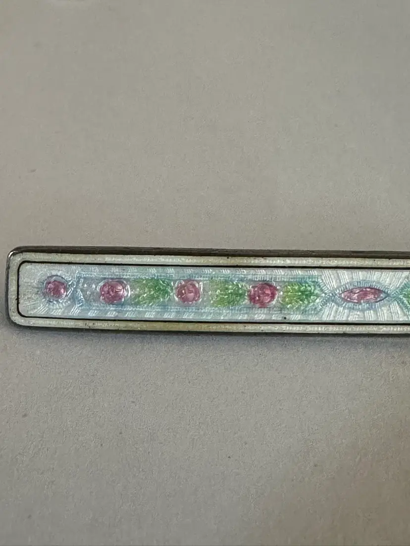 Very sweet antique Edwardian Barpin. It is sterling silver and enamel. It measures 2.25” x .25”. Very good condition.
