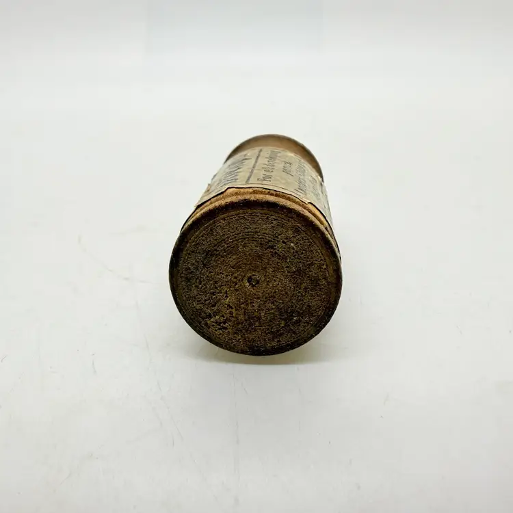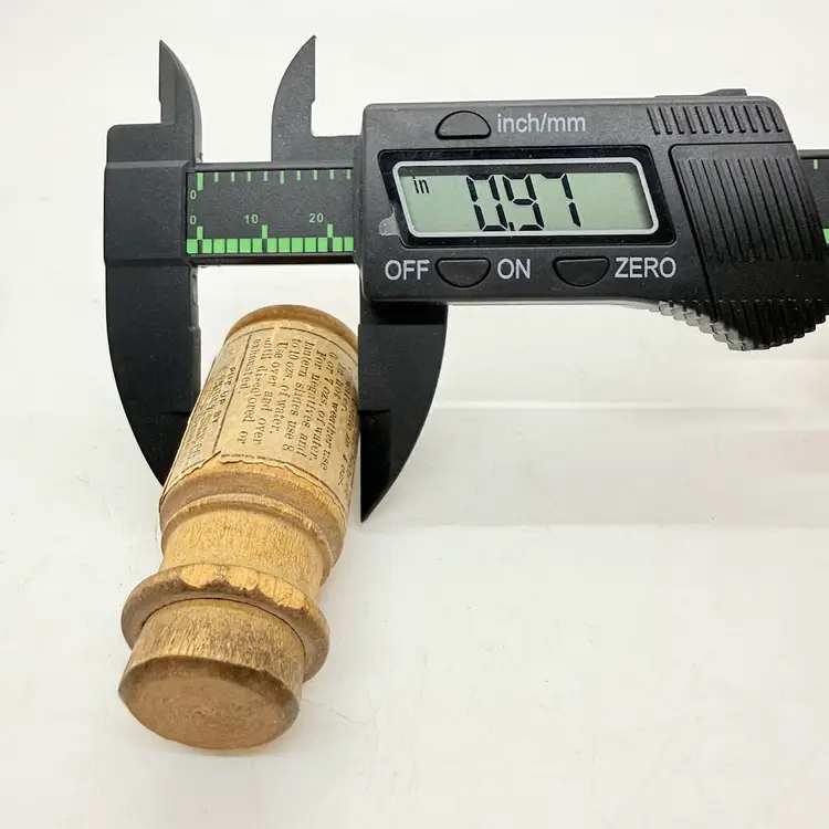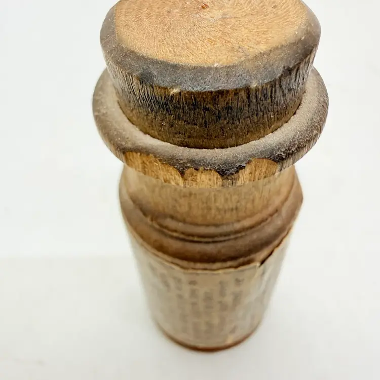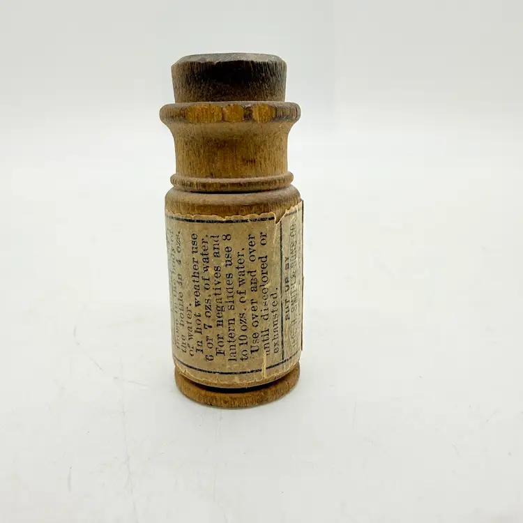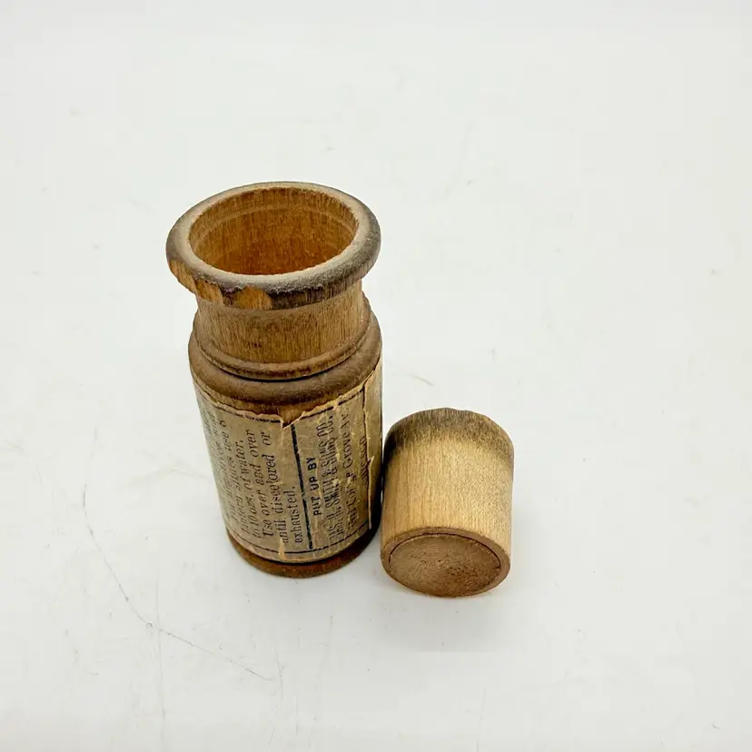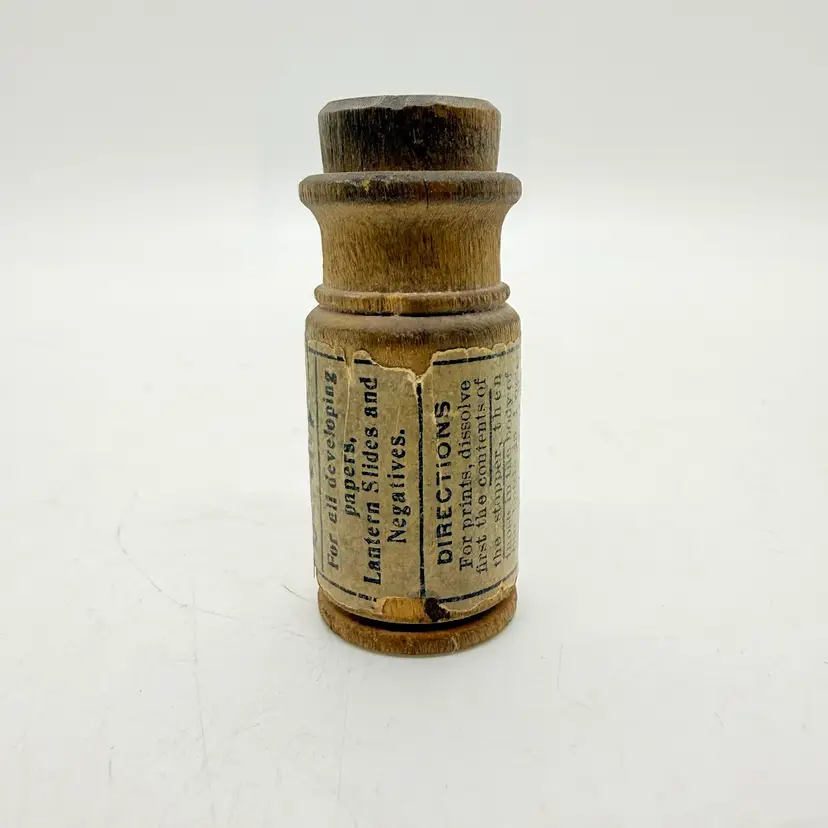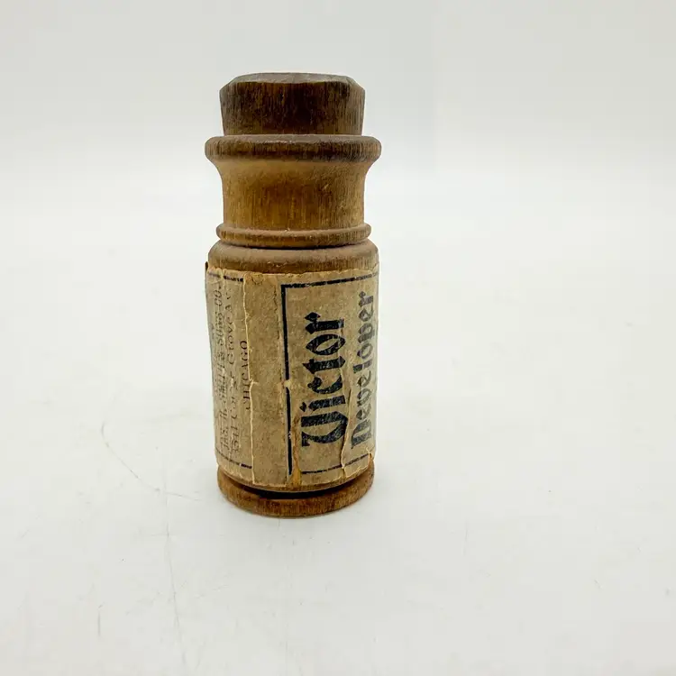 Antique Empty Wooden Powder /Pill Bottle has a with Stopper. Has a paper label for Victor Developer with Instructions from James H. Smith & Sons Corp. Chicago. Signs of age wear and use. Some chipping to the wood around the top and bottom lip. Wear and tearing to the paper label. Please see pictures, being sold as is.