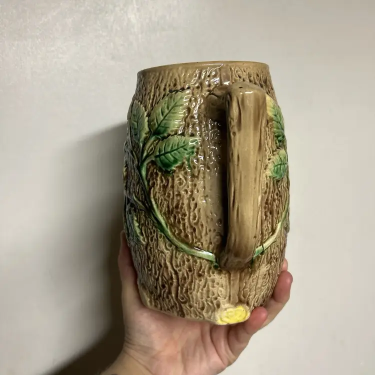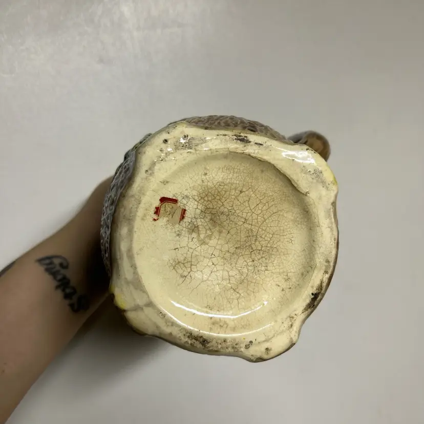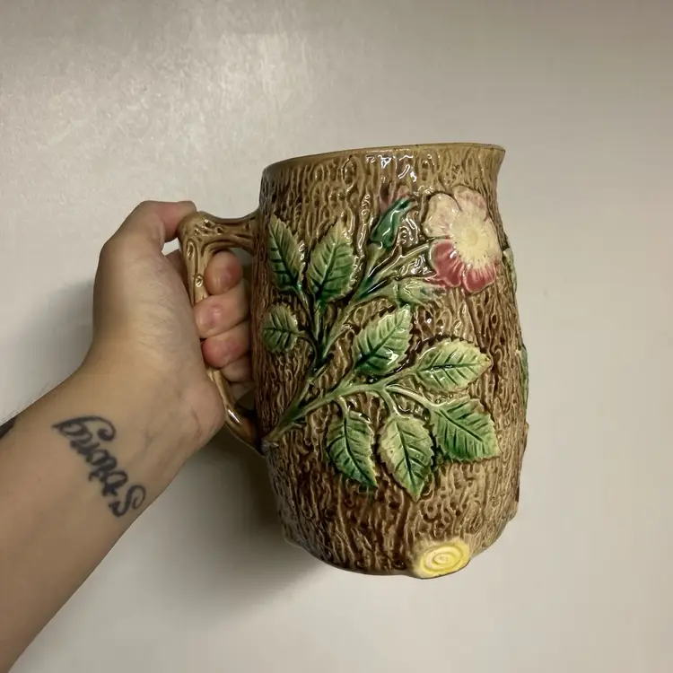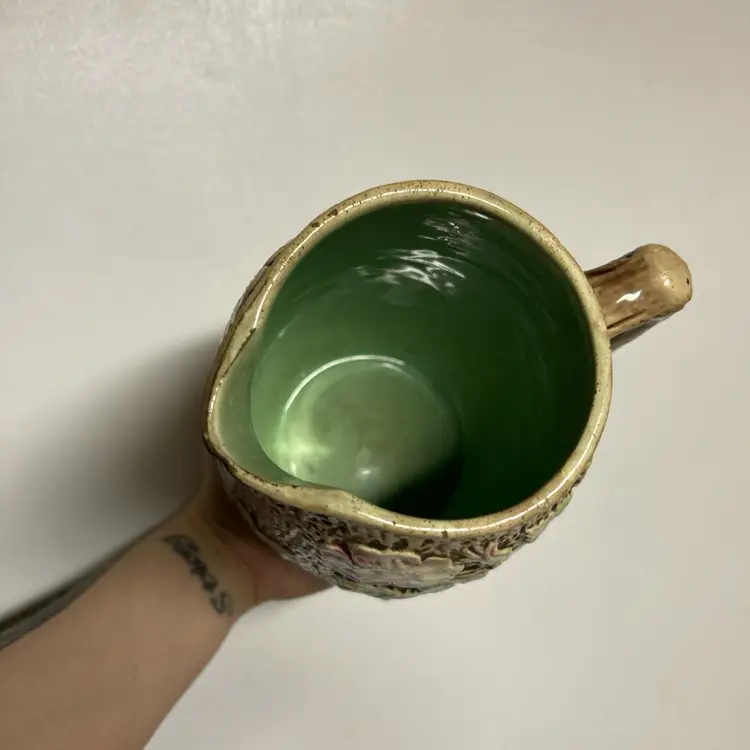There is wear on the tip of the pitcher as you can see because of age. Just a beautiful antique pitcher that would look stunning as a vase. Height is between 7-7 1/2.