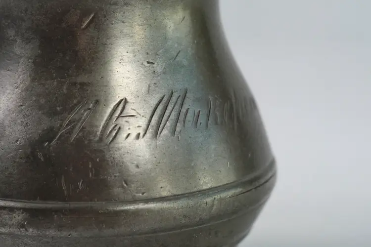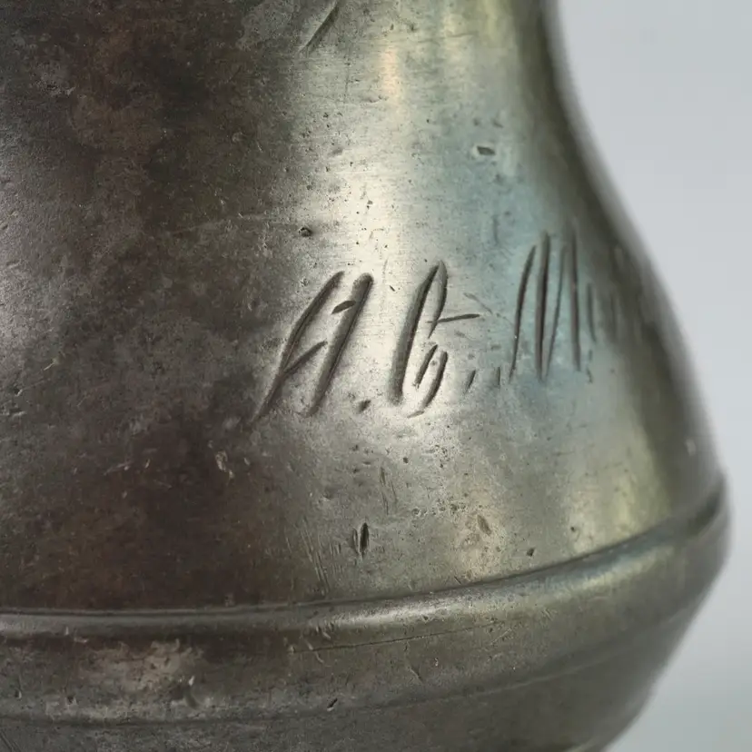 A 19th century handmade English pewter gill Measure. Marked with a crown, SA and VR mark in a square. Also marked 7. Inscribed on the side by previous owner H.G. (or H.C.?) Makepeace.