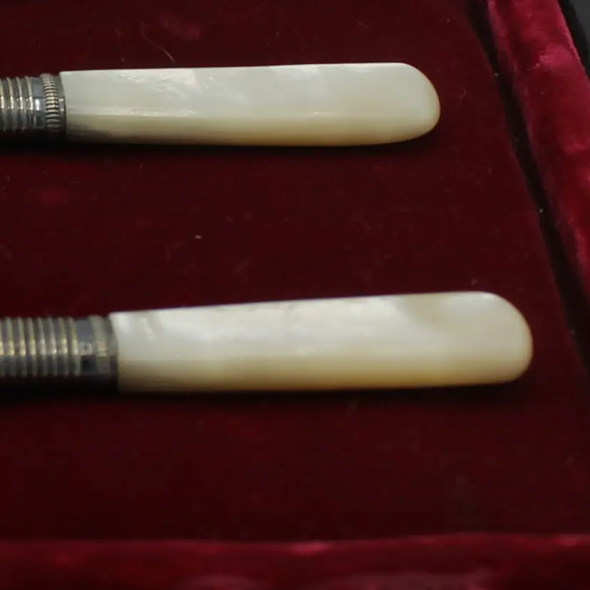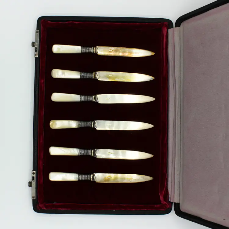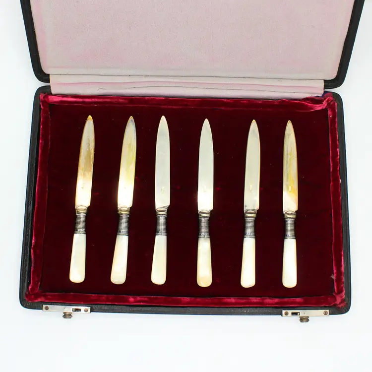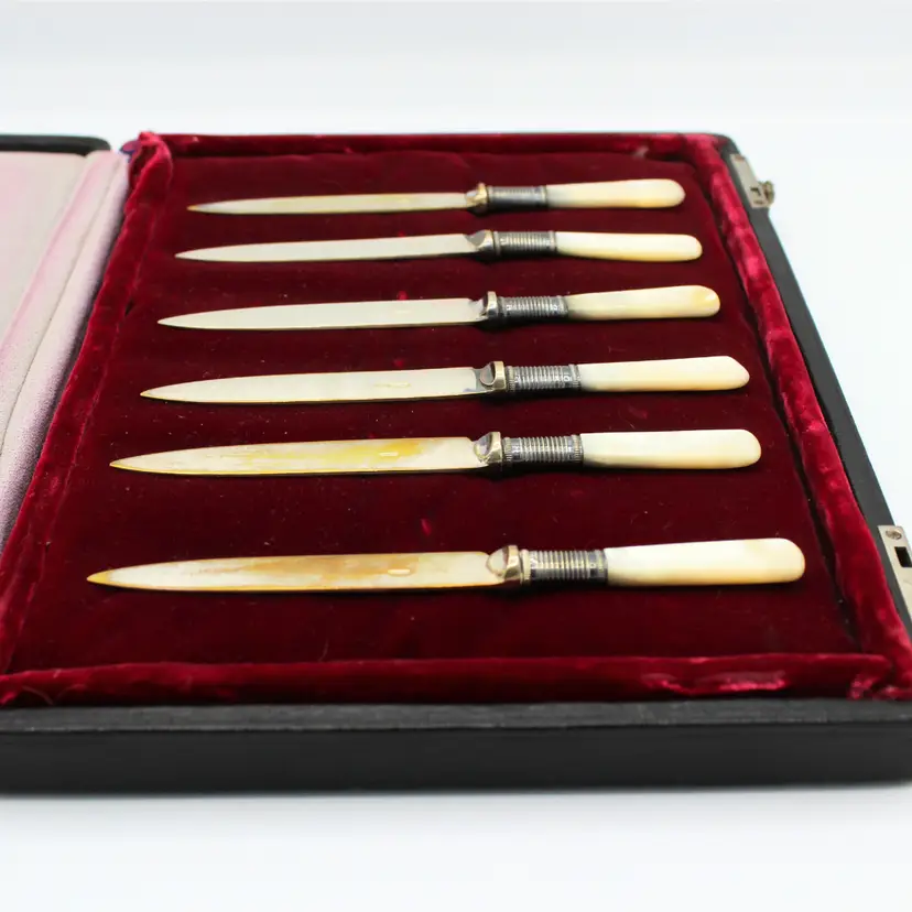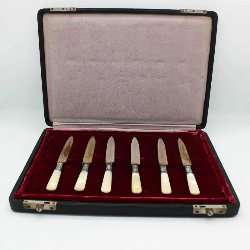 Antique Late 1800s Electroplated Nickel Silver Knife Set of 6 White Mother of Pearl Handles Blade marked EPNS Original Black Leather Slide Knob Lock Box with Red Velvet Lining