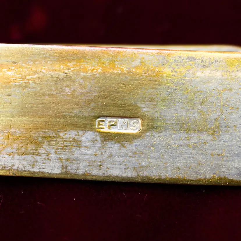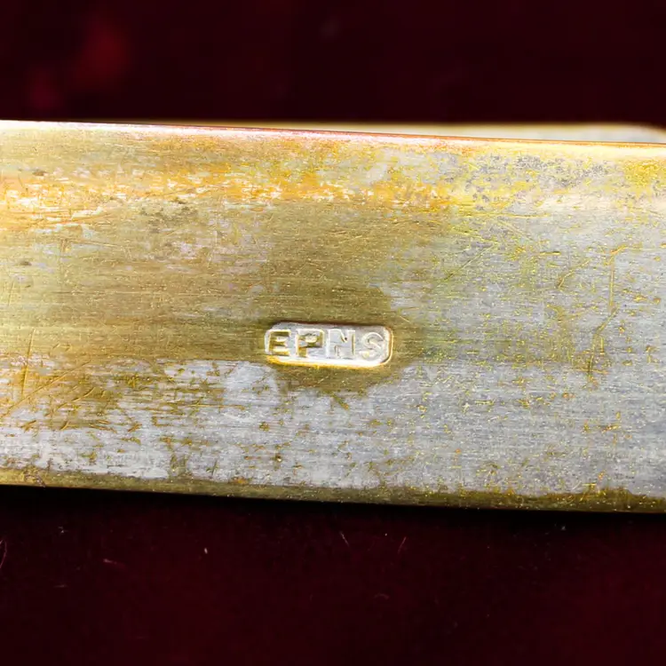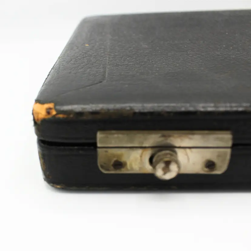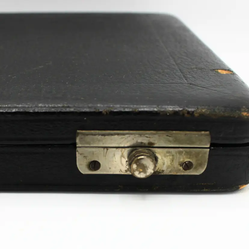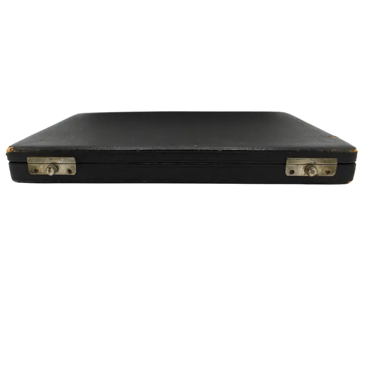 Antique Late 1800s Electroplated Nickel Silver Knife Set of 6 White Mother of Pearl Handles Blade marked EPNS Original Black Leather Slide Knob Lock Box with Red Velvet Lining