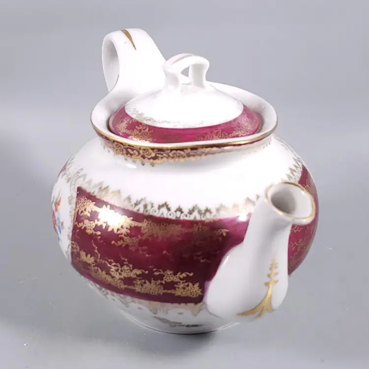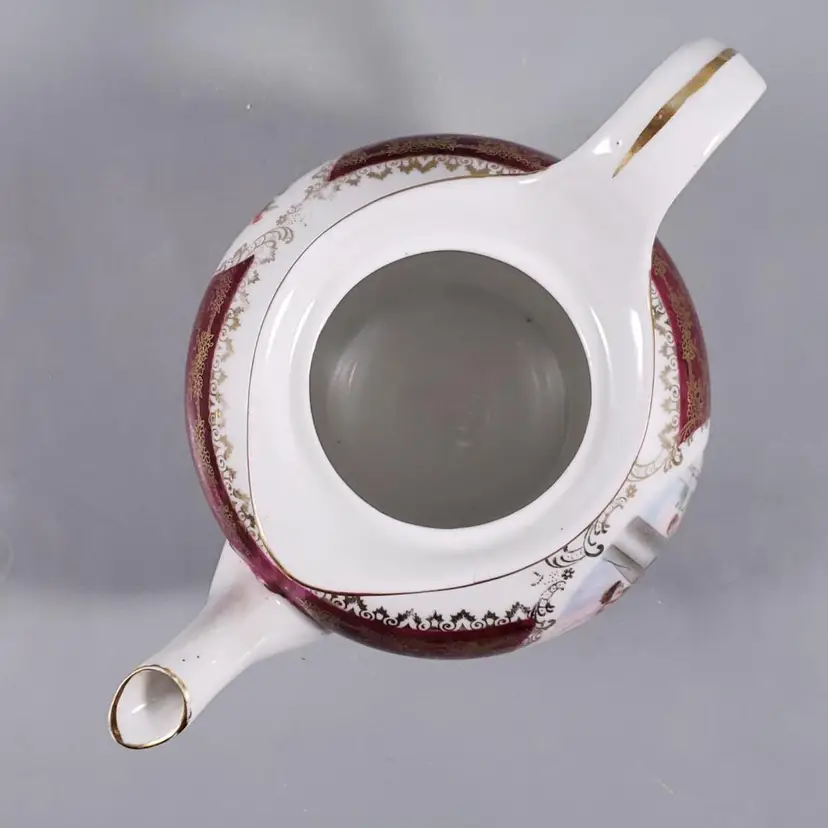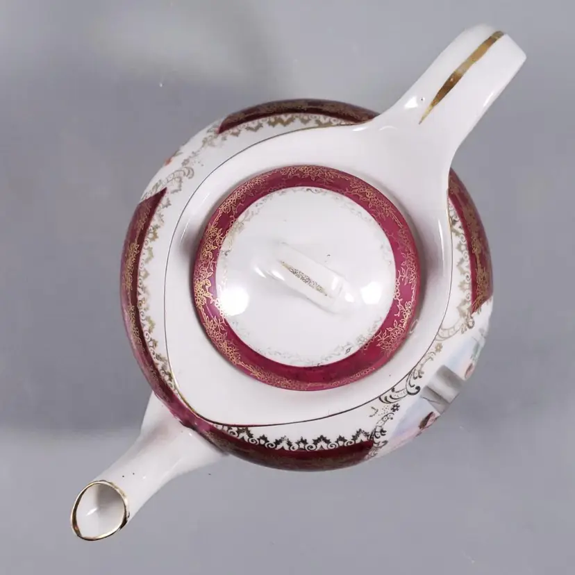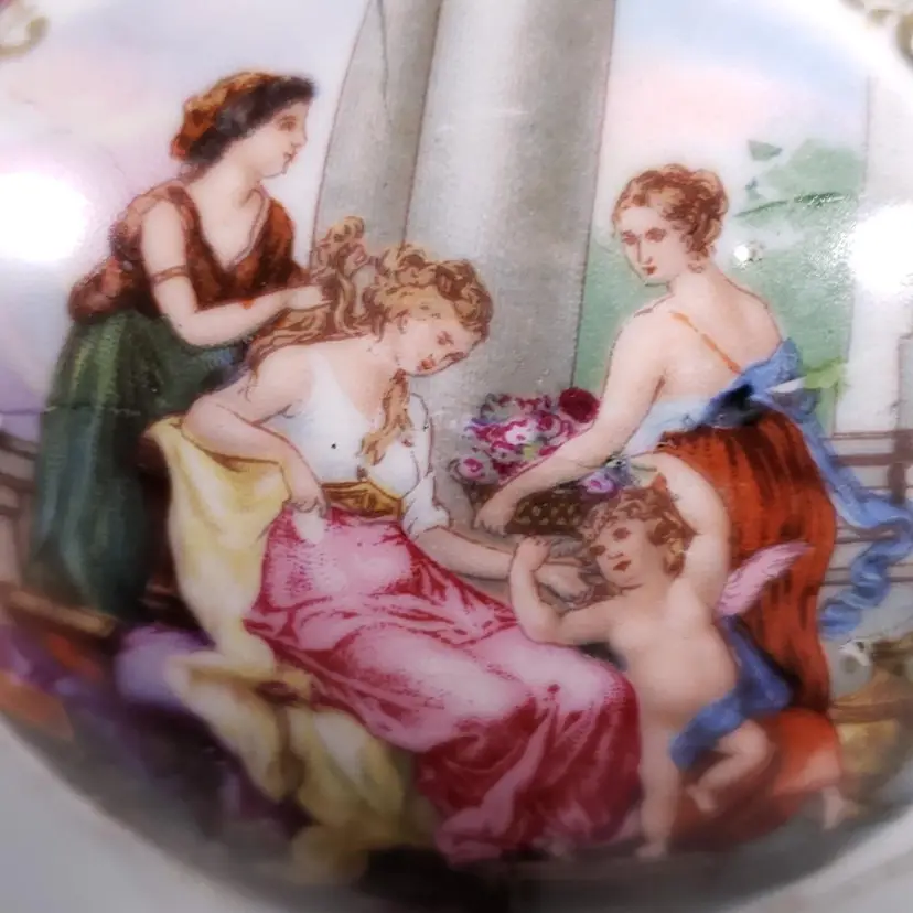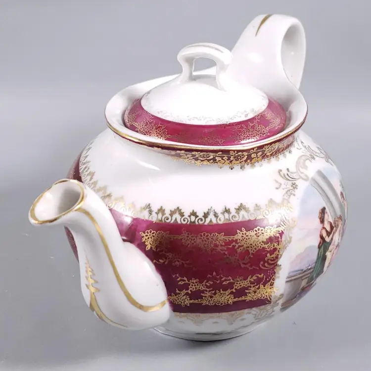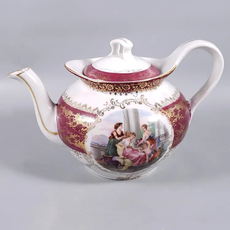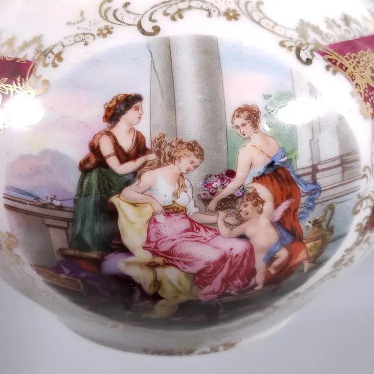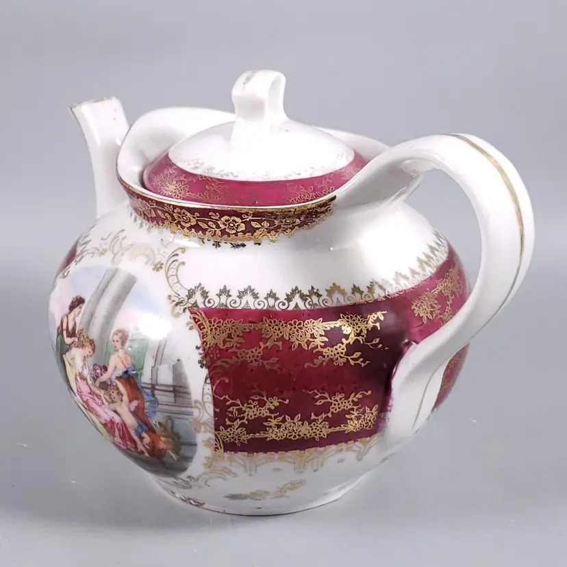 • Porcelain • Classical scene, transfer print decal with hand painted embellishments • Hand painted & stenciled gold accents • Hand painted, wine color • Unmarked •Minor age-related wear to gold accents • No chips, cracks, crazing, or other damage noted • Weight: 15 oz • Capacity: 24 oz (3 Cups) • 5" diameter • 8" wide • 4½" tall (including lid)