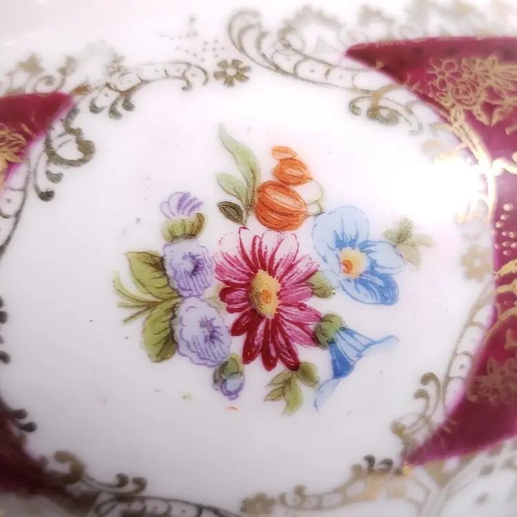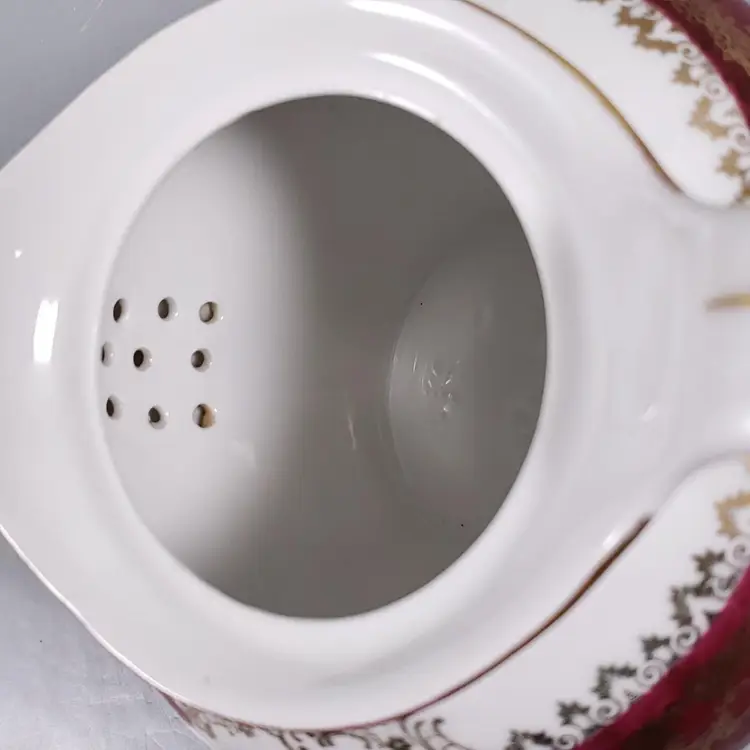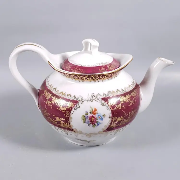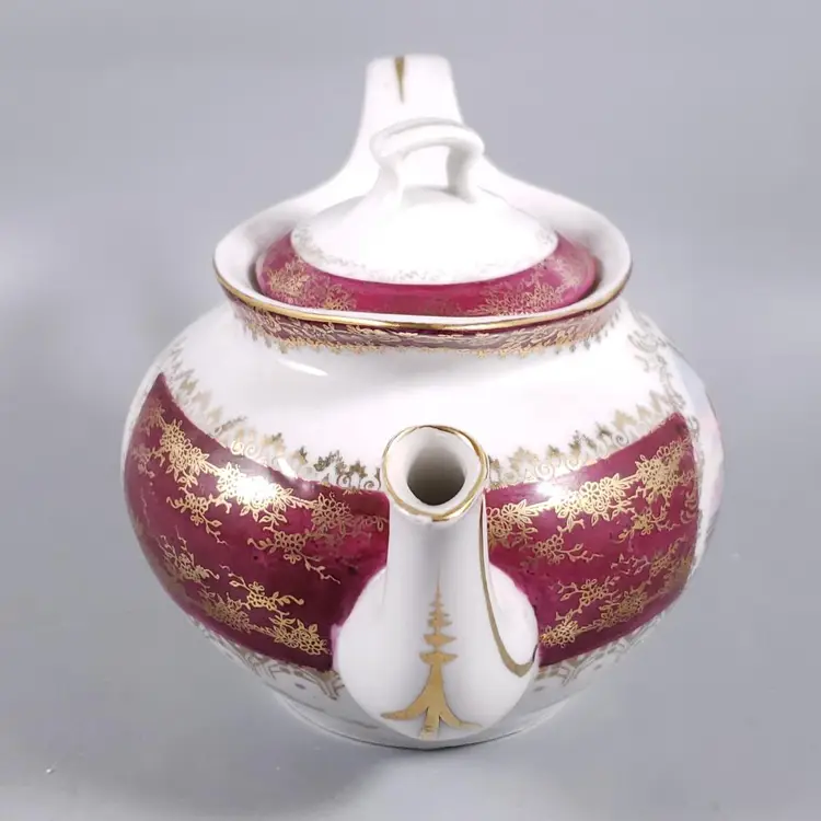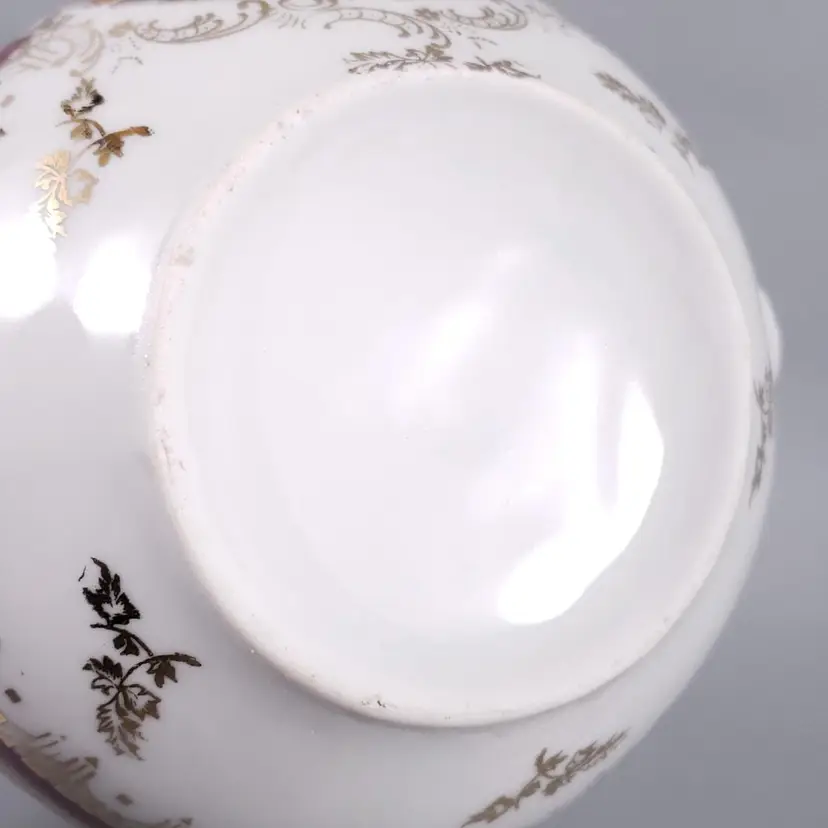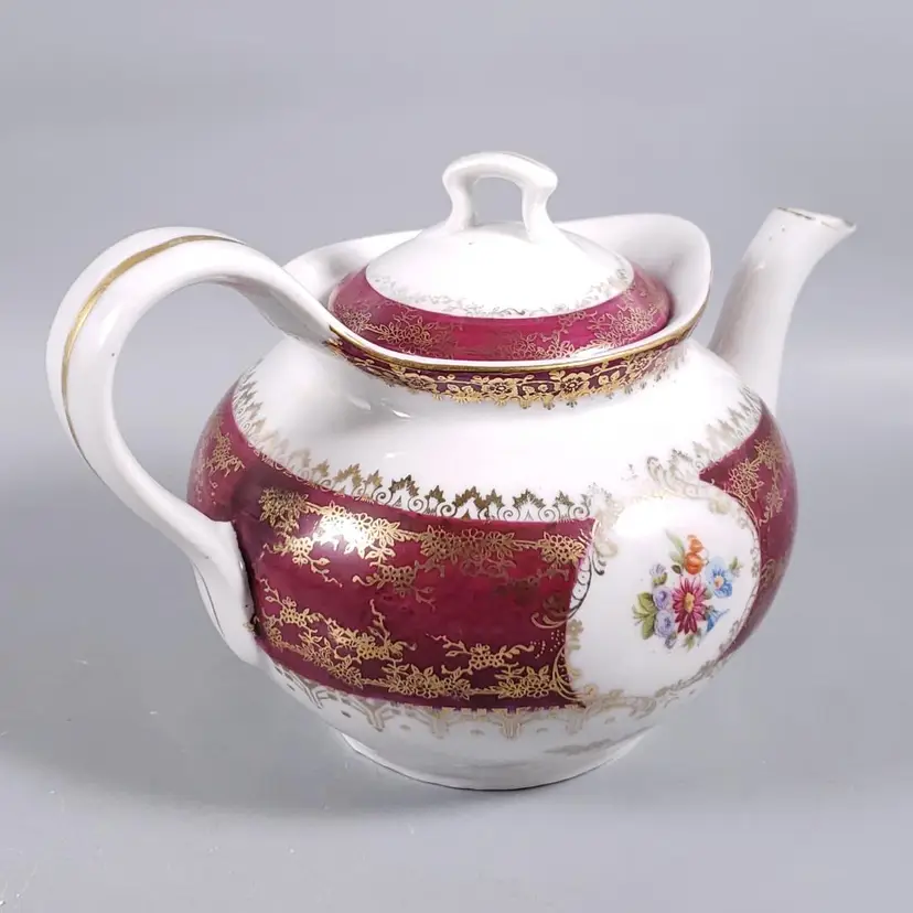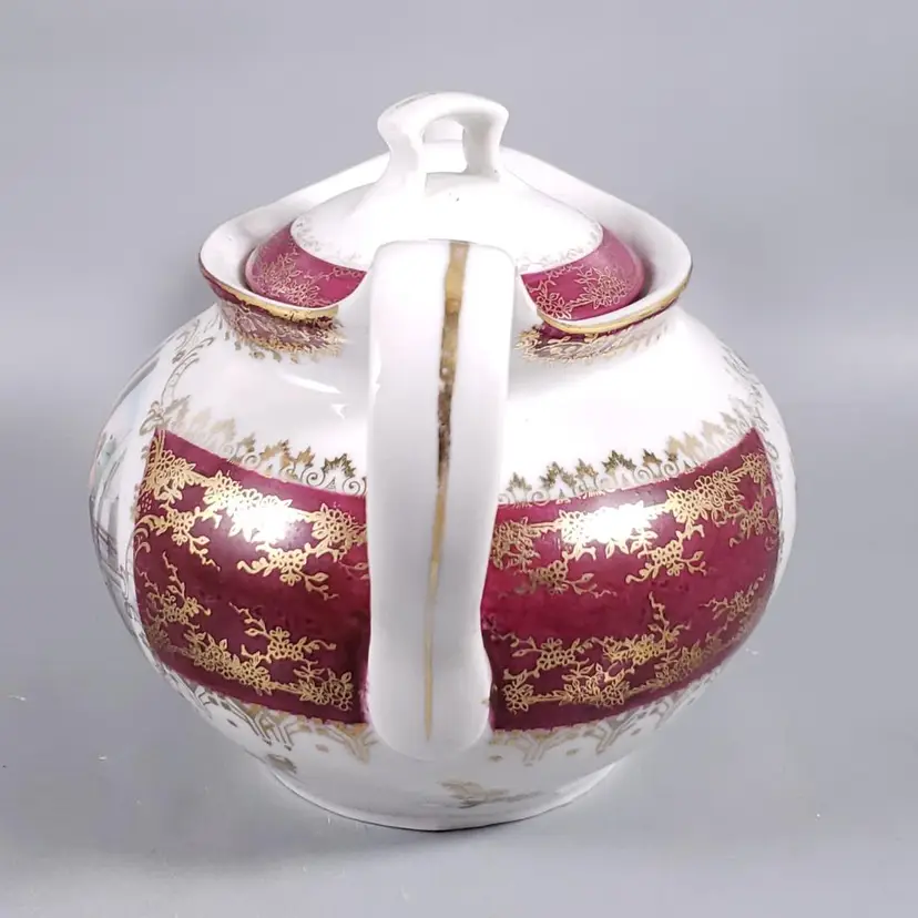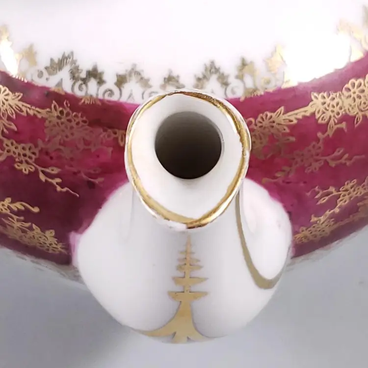 • Porcelain • Classical scene, transfer print decal with hand painted embellishments • Hand painted & stenciled gold accents • Hand painted, wine color • Unmarked •Minor age-related wear to gold accents • No chips, cracks, crazing, or other damage noted • Weight: 15 oz • Capacity: 24 oz (3 Cups) • 5" diameter • 8" wide • 4½" tall (including lid)