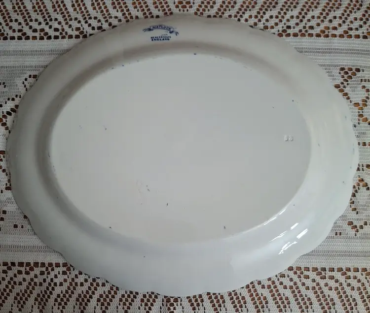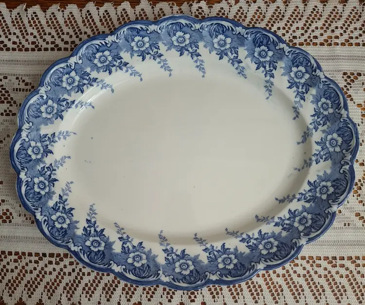 Antique F. Winkle & Co. Colonial Pottery "Matlock" Pattern Oval Platter: This stunning antique ceramic piece features a charming Blue Transferware color scheme with intricate floral and swag motifs. Measuring approximately 13 inches in width and 16 inches in length, the platter is adorned with an elegant pattern that showcases the artistry of the F. Winkle & Co. brand. The blue color, which is a popular type of transferware, includes a delightful array of flowers and foliage that gracefully sweeps across the surface. The item boasts a registration number of 334325, indicating it was produced around 1899. Remarkably, the platter remains in excellent condition with no visible chips, cracks, or repairs, a true testament to its quality and care over the years. This timeless piece would make a fabulous addition to any vintage kitchenware or pottery collection, serving both practical and decorative purposes. Please view the pictures and feel free to ask questions. Thank you for visiting my shop.