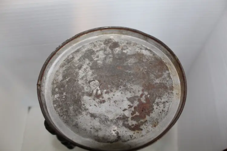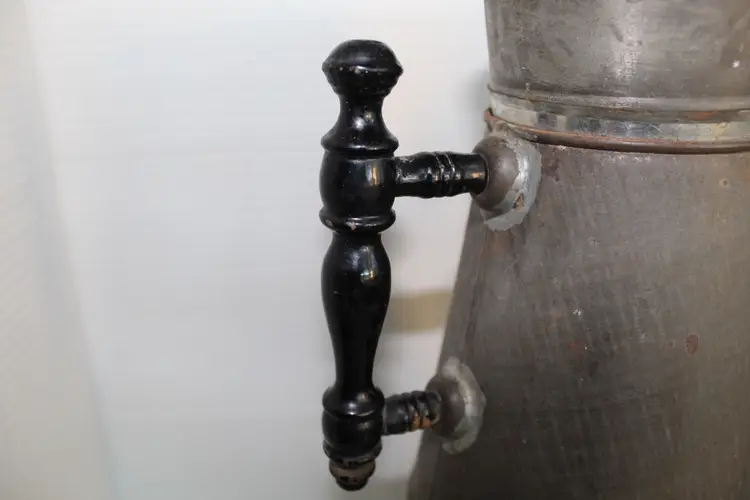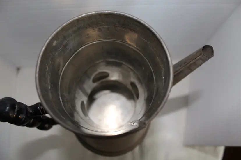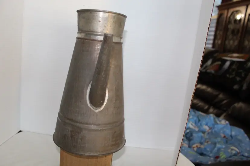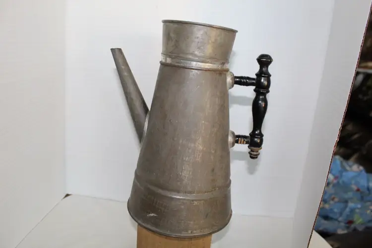This antique primitive coffee pot features a conical tinned-metal body, a straight tapered spout, and a classic black ebonized turned wood handle. This 19th-century piece exhibits a rich aged patina with visible surface oxidation and includes interior strainer holes at the spout base, though it currently lacks its original lid. It has a 1.4 qt water tank capacity. The pot is made of silver-colored metallic finish tin and stands at 10 inches tall with a diameter of 8.5 inches at the handle to spout. Although it does not come with a lid or basket, it is a unique and collectible piece for any kitchen or home decor. With its vintage charm and functionality, this coffee pot is sure to be a conversation starter among coffee enthusiasts or makes a great vase for flowers, especially in a country style kitchen.