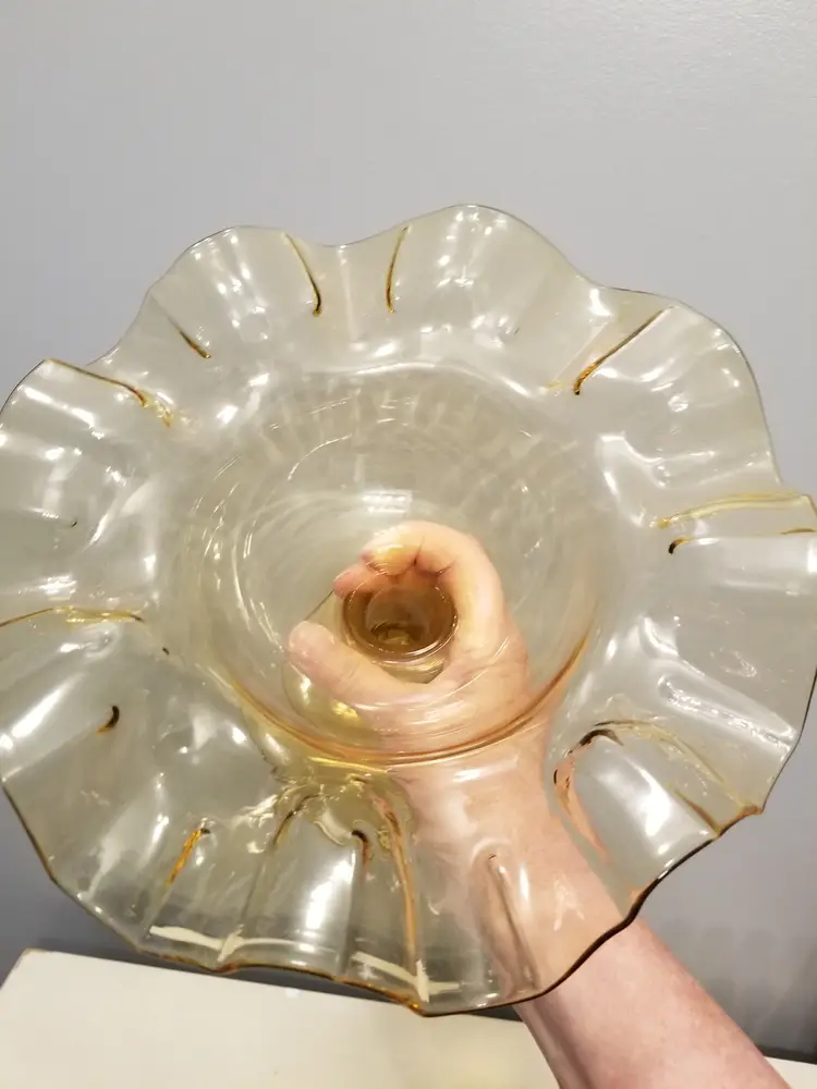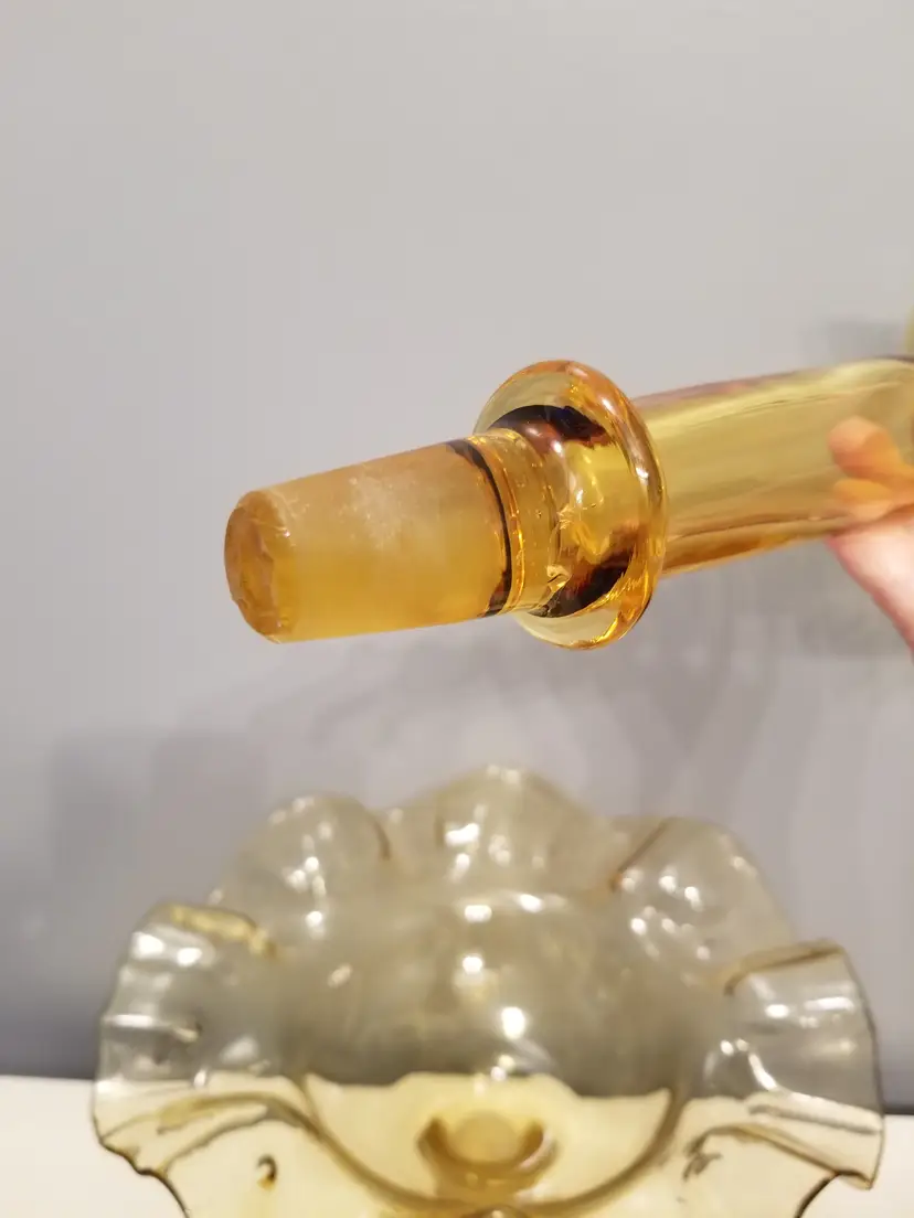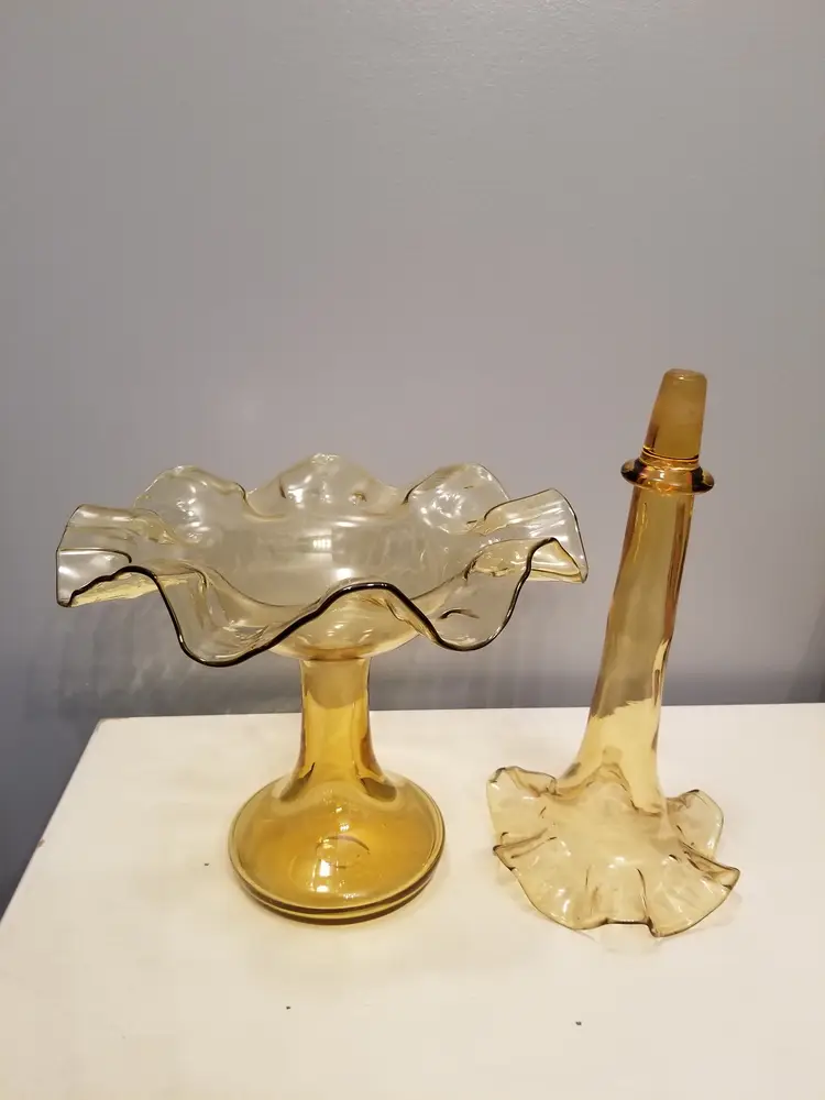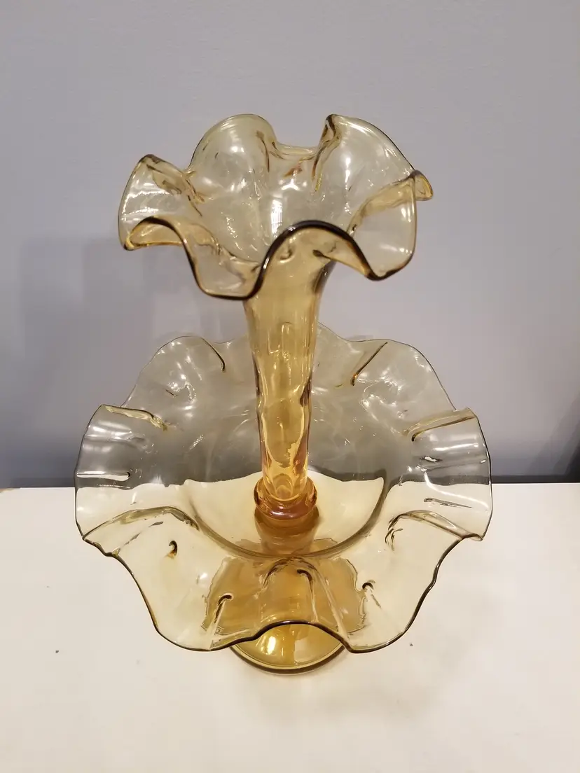 The Antique Fenton Amber Glass Epergne is an impressive piece of early 20th-century American Blown Glass, boasting exceptional craftsmanship and timeless elegance. Measuring 14 1/2 inches tall, it features ruffled edges that capture light and a central trumpet shape vase reminiscent of Victorian and Art Nouveau styles. This versatile amber-hued centerpiece can enhance both formal and casual spaces with its rich color and intricate design. Originating from the esteemed Fenton Art Glass Company, which was established in 1905, the epergne showcases the brand's commitment to quality and innovation. As a historic artifact, it serves as a conversation starter and a beautiful addition to any collection or decorative setting. The Fenton epergne is both functional for displaying floral arrangements and aesthetically pleasing, making it a valuable investment that can be cherished for generations to come. Please view the pictures and feel free to ask questions. Thank you for visiting my shop.