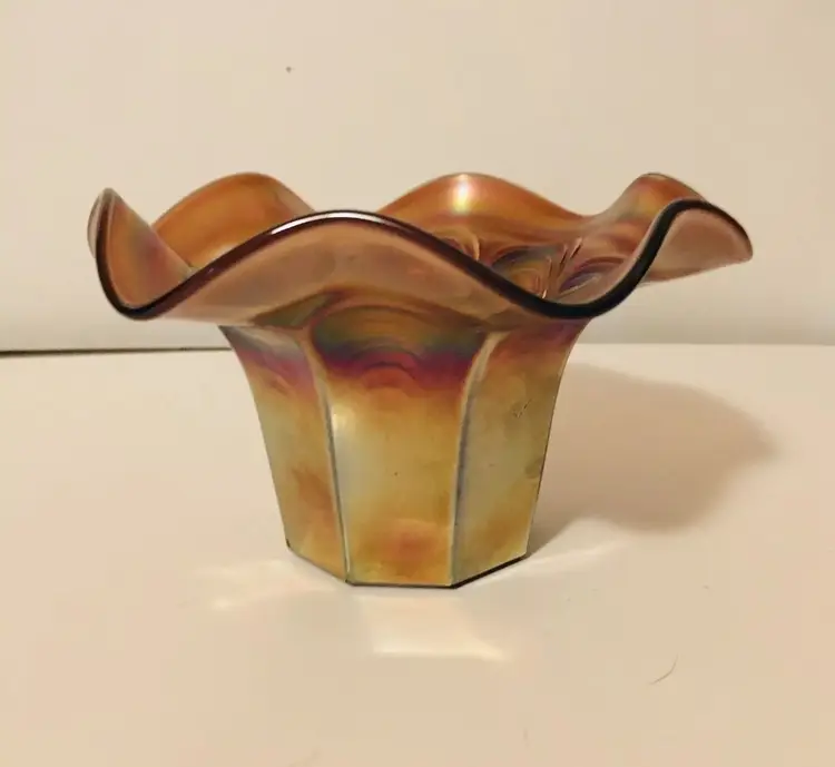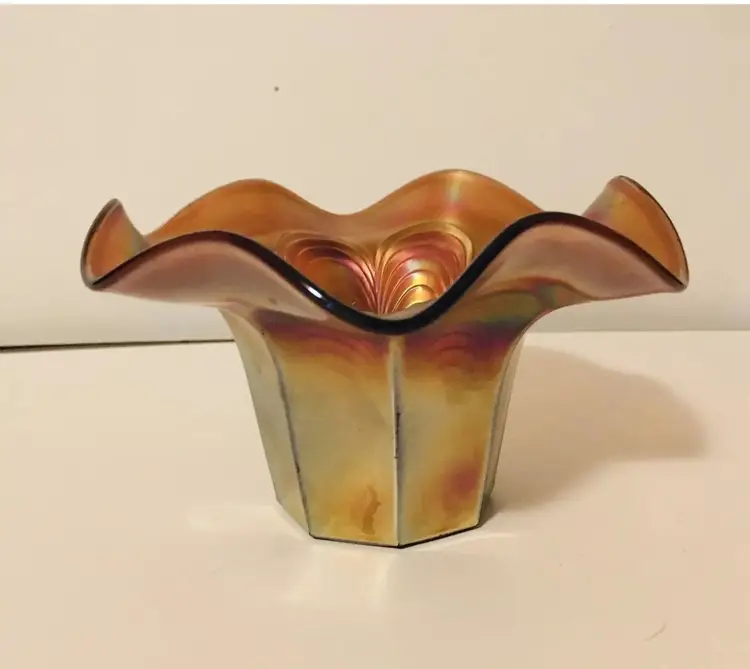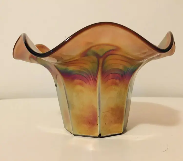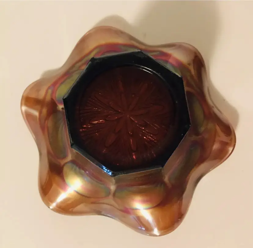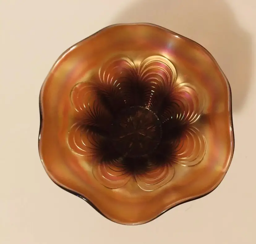 Pattern first produced in 1910. Definitely Pre 1940. Fenton carnival “hat” dish. Amethyst glass with marigold iridescence. Peacock tail pattern. Heavy iridescence really changes according to light.