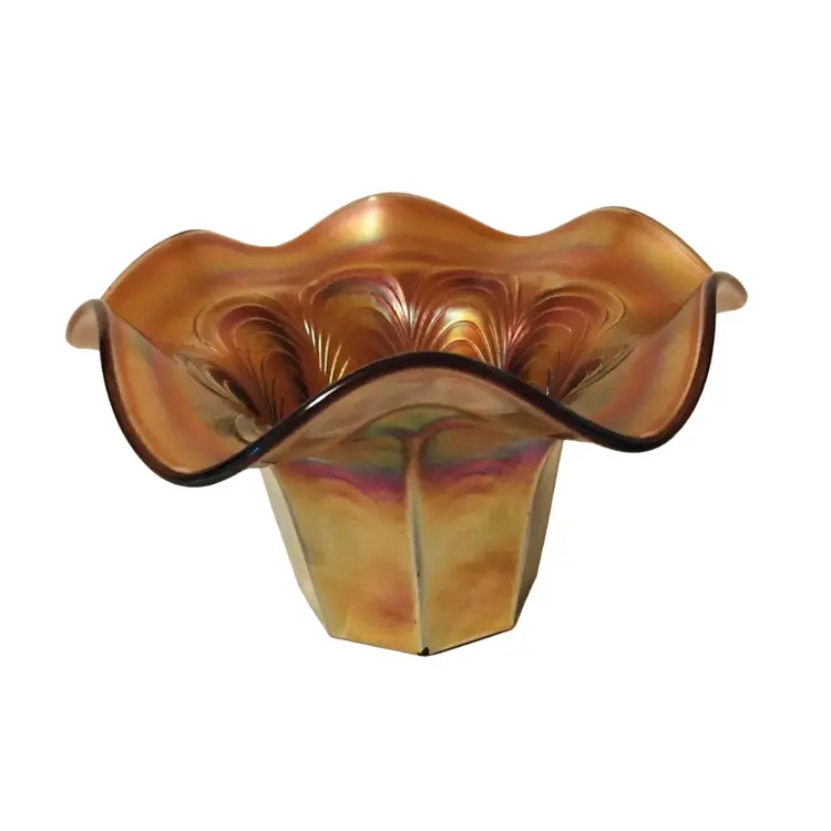 Antique Fenton Carnival Amethyst Glass Marigold Iridescent Peacock Tail Hat Dish.
