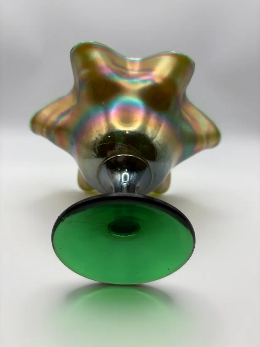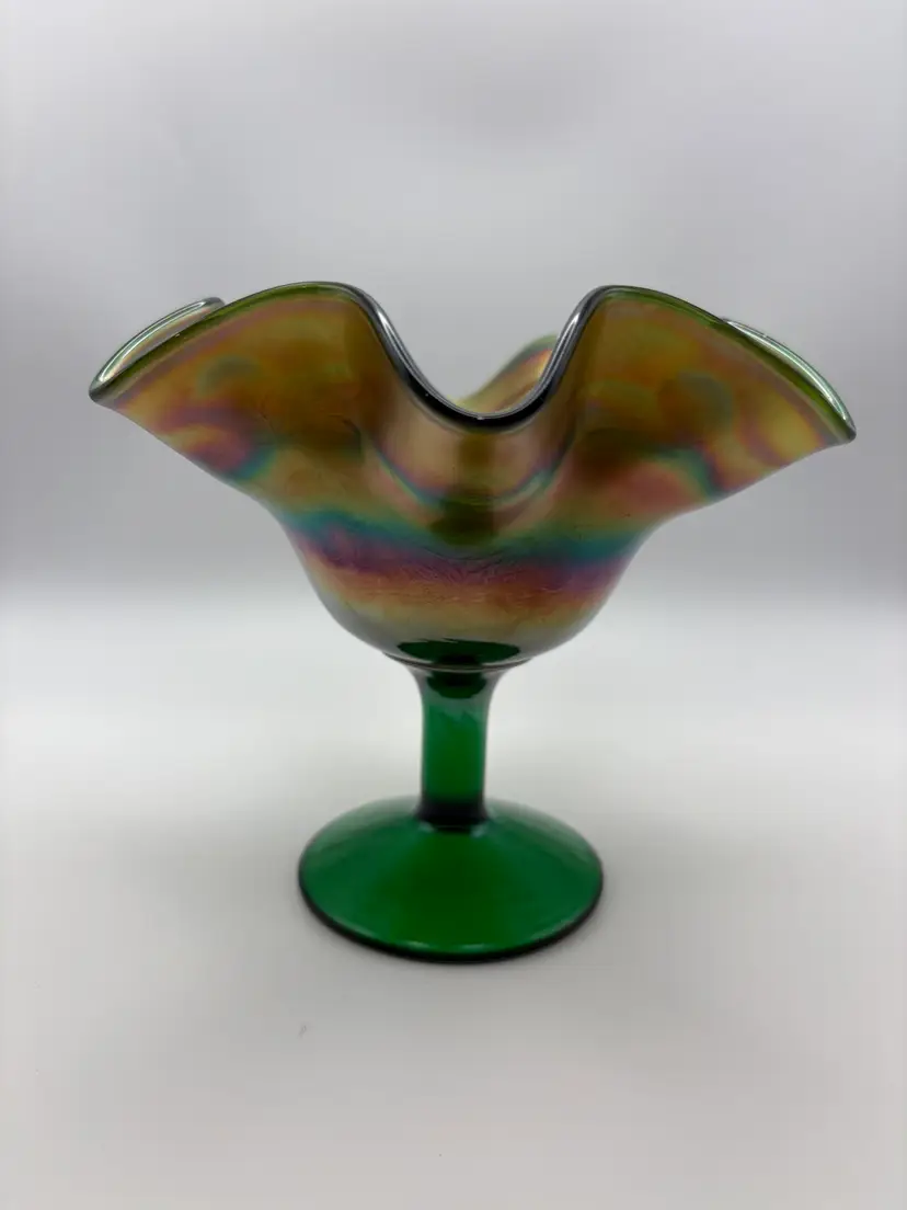 Beautiful antique Denton compote in carnival glass featuring what I believe is the blackberry spray pattern. 5.5” tall. No issues.
