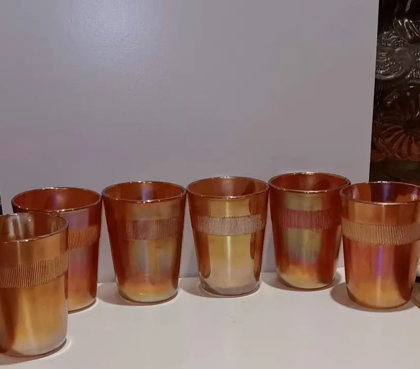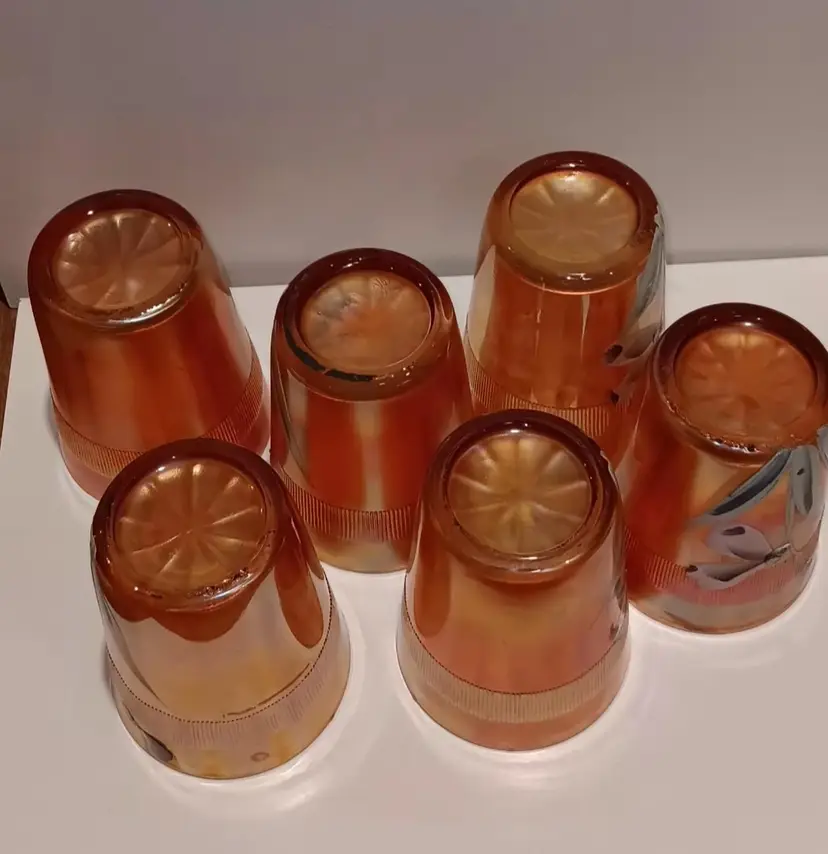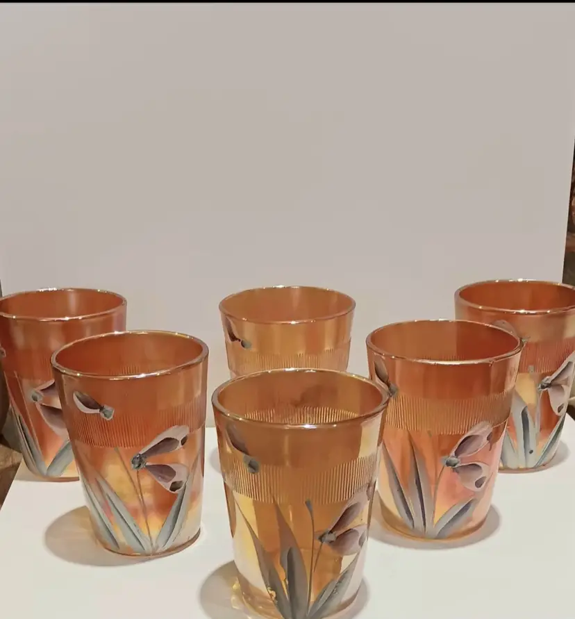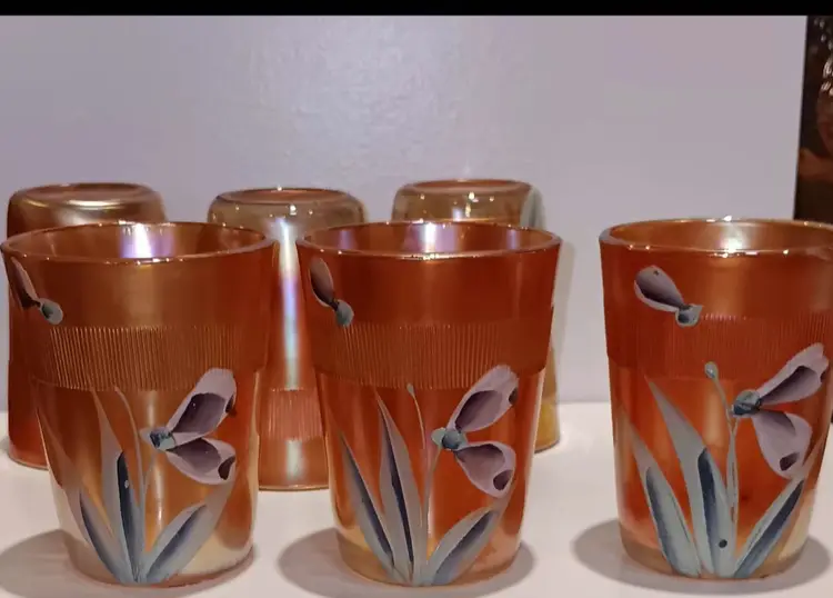 Gorgeous 1920s set of Fenton Marigold Tumblers. Hand painted Iris on each with a Prism band on top. No chips or cracks. Some roughness on the bottom see pics. These tumblers are over a 100 years old and in great condition. Definitely a must for any Fenton collector.