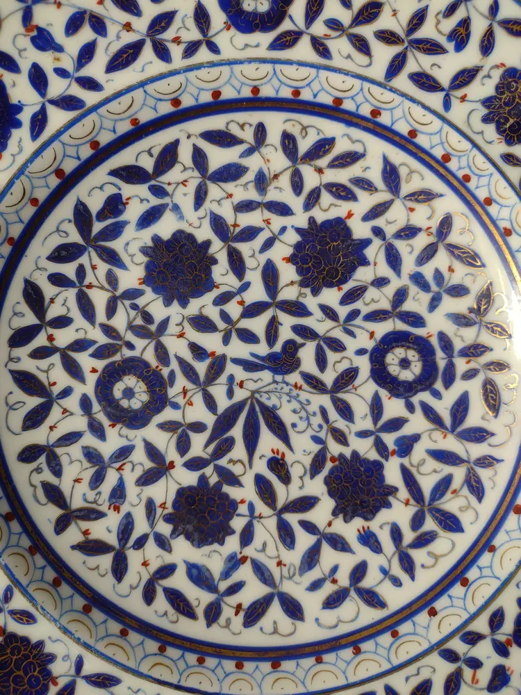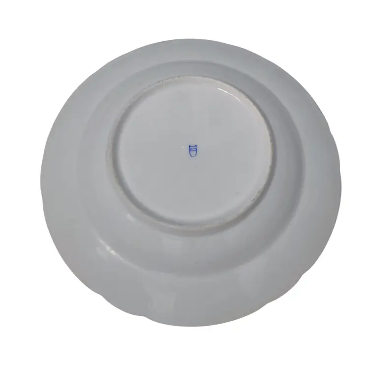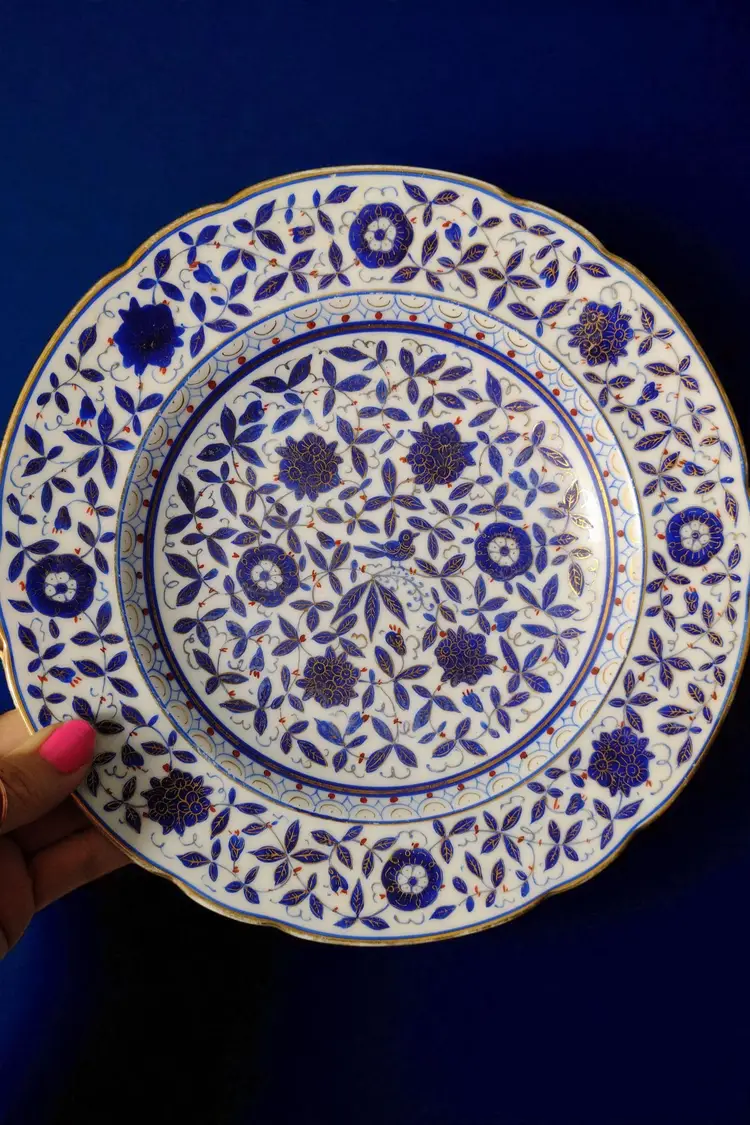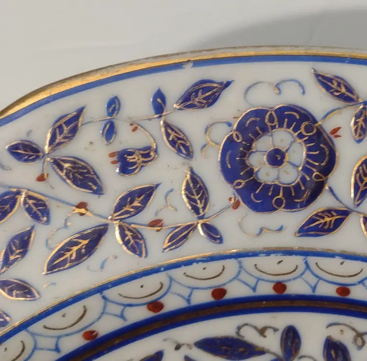 Item is pre-owned and in good condition with no cracks. There is one small flea bite chip on the rim as shown in last picture. There is also some slight wear to the gold on the rims. Smoke free environment. This is a very pretty bowl in a cobalt blue & white with gold trim throughout. There are florals & leaves throughout with a bird in the middle with scalloped trim. Bowl measures 9.5" wide x 1.5" tall.