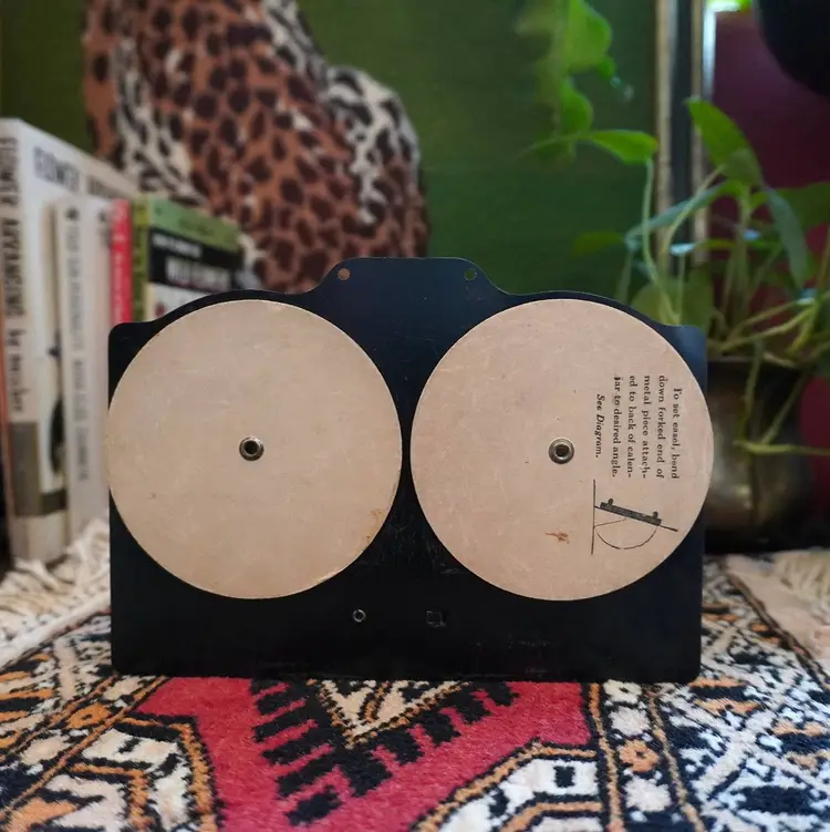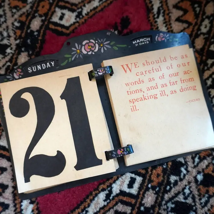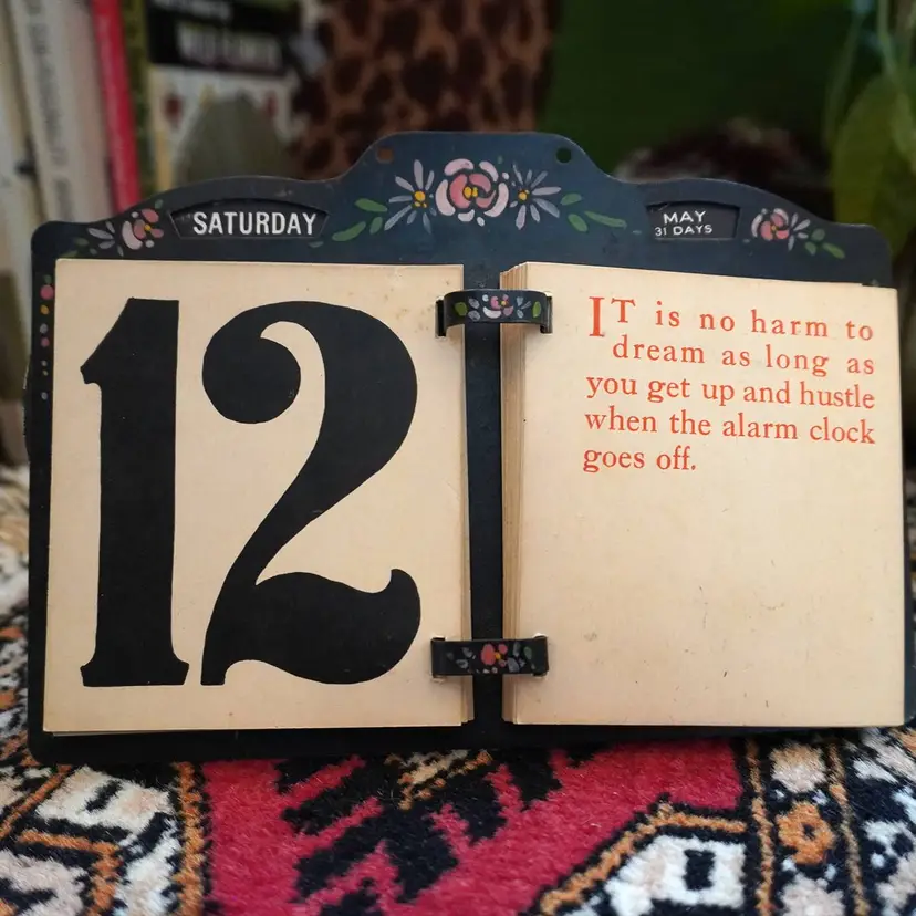 This unique vintage daily desk calendar features a array or inspirational messages for every day of the month. You can switch the day and month by rotating back wheels. Missing original easel to stand freely. Can easily be hung on wall or replace with a easel.