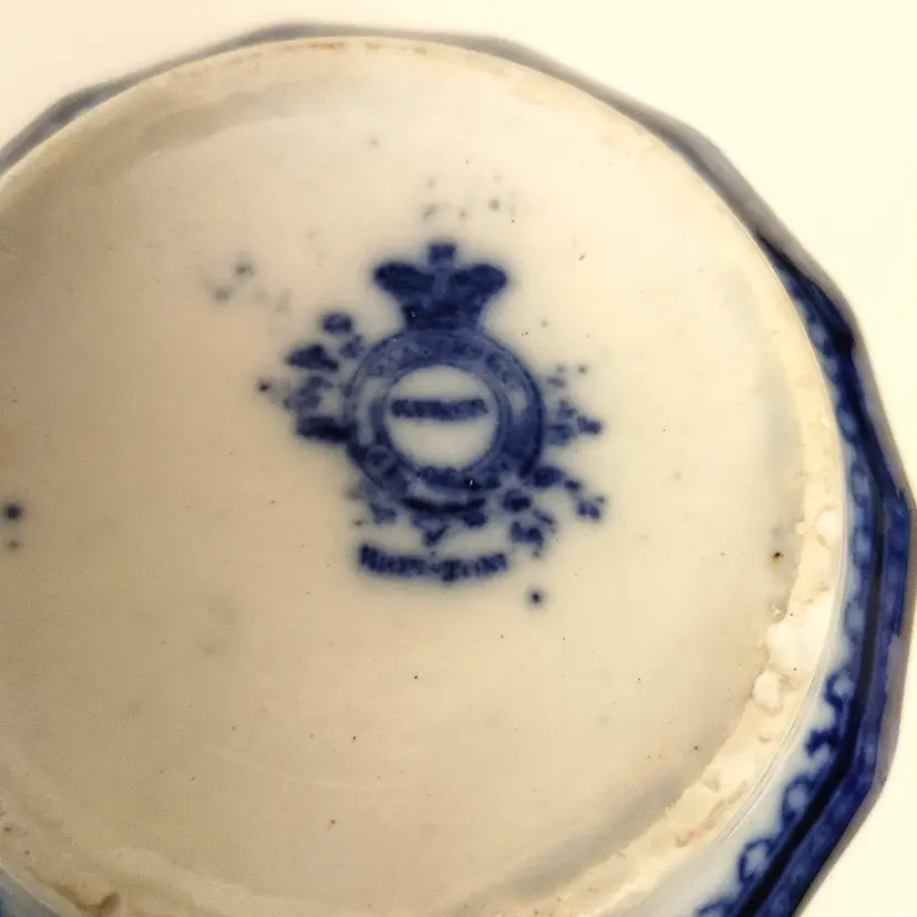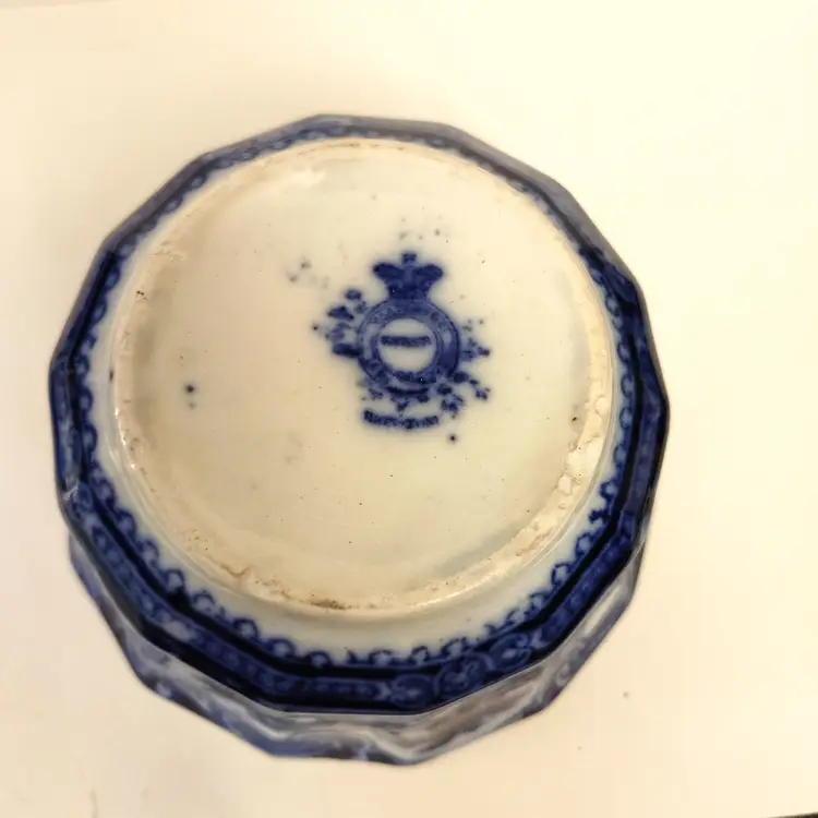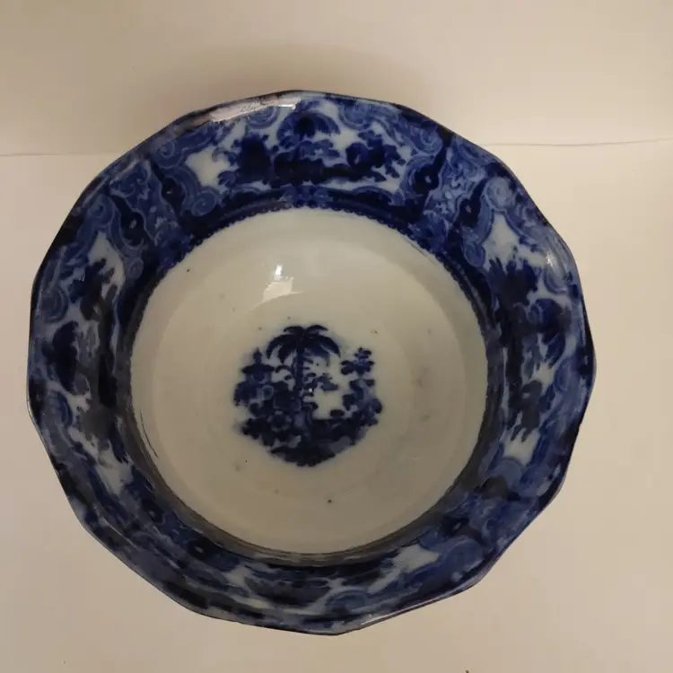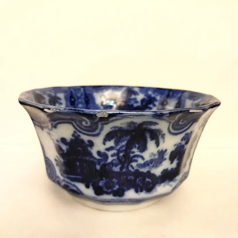 Antique Flow Blue Bowl. "Kyber" pattern. Chips in 1 side and bottom. Shown in pics. 1880-1900's. 6.25 diameter.
