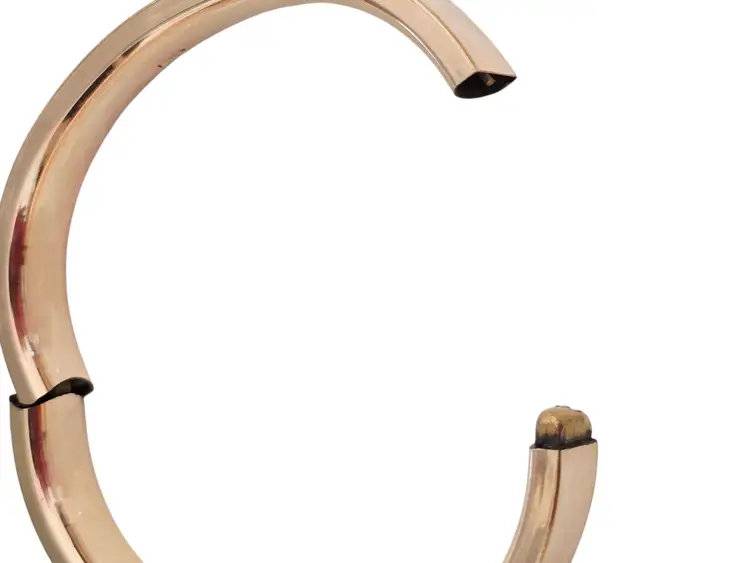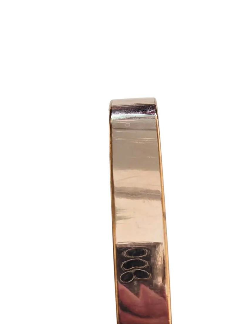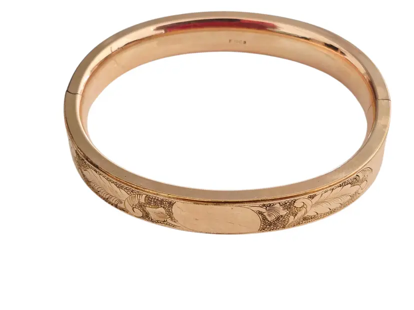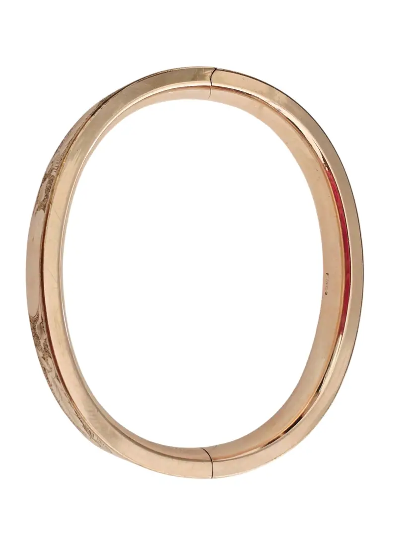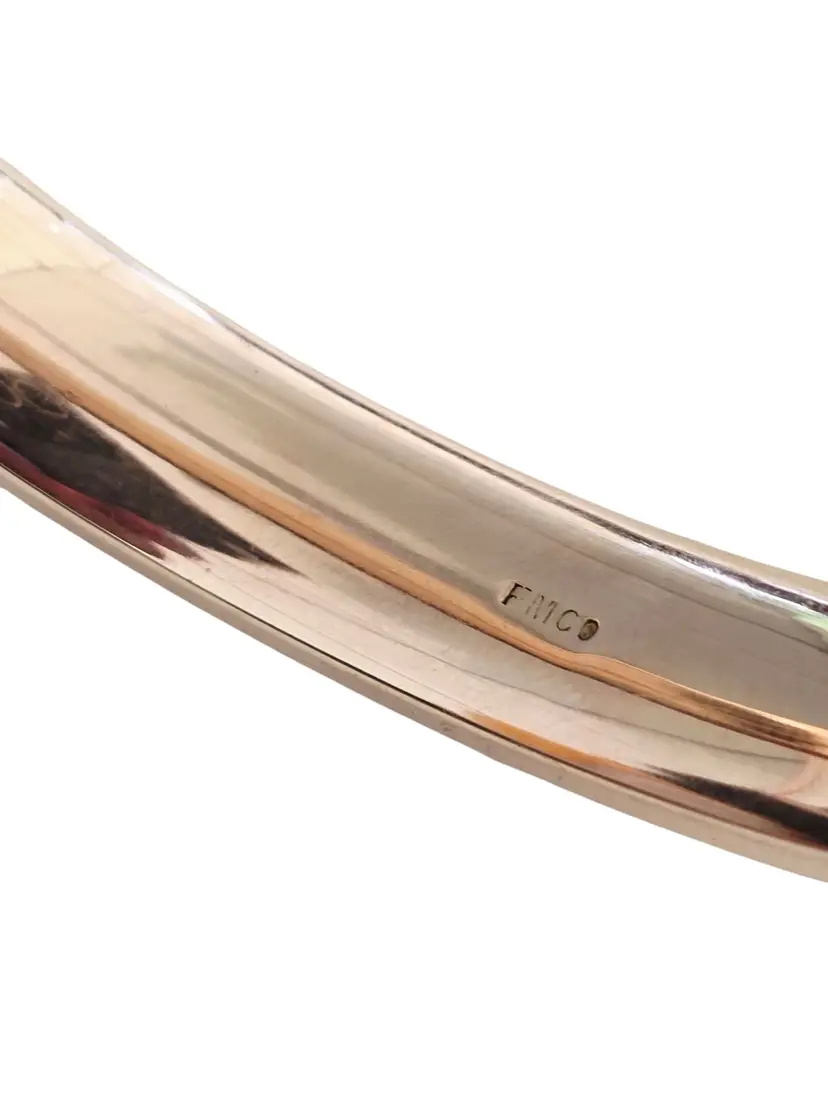 Size: Inner circumference approx. 2.75" and approx. .50" wide Color: Gold Condition: Very good Signed: FMCO Details: Missing bar inside but closes tightly