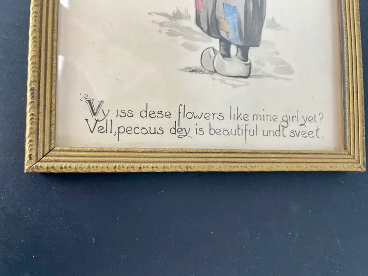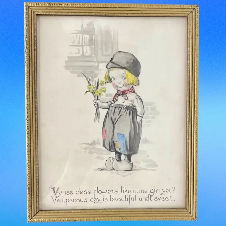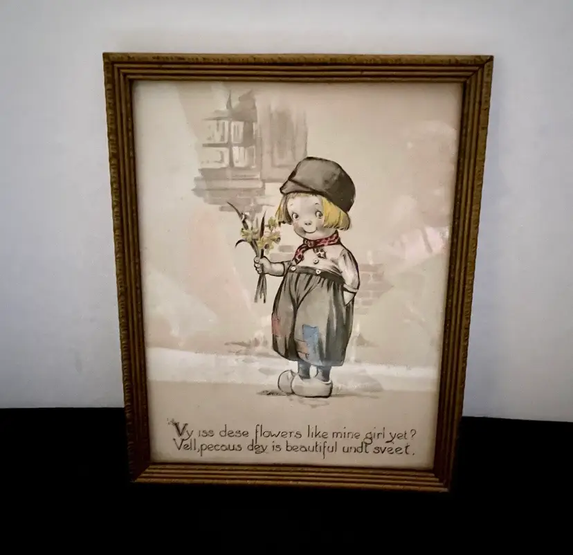 The product is an antique framed Victorian print from 1912 featuring a Dutch boy with flowers. This medium-sized portrait print measures 9.5 inches in height and 7.5 inches in width, showcasing a Dutch theme. The artwork is framed under glass, capturing the essence of early 20th-century artistry and design.