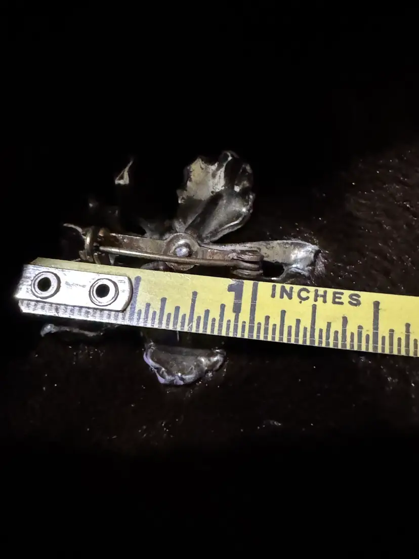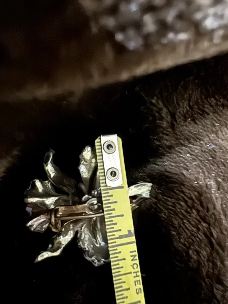 Antique French Art Nouveau orchid brooch pin made of pot metal and enamel. It features intricate floral details with purple, green, and yellow coloring.