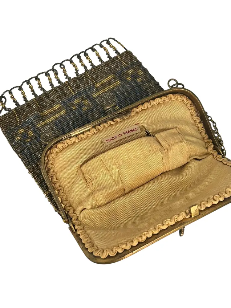 This rare and highly collectible accessory is in vintage condition, especially considering its age. The beadwork is largely intact with minimal loss, and the metal frame shows a beautiful natural patina. Please note there is a rip/tear on the inside of the bag, as shown in photos. Perfect for vintage enthusiasts, collectors of French fashion, or as a unique statement piece for special occasions!