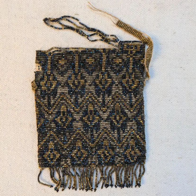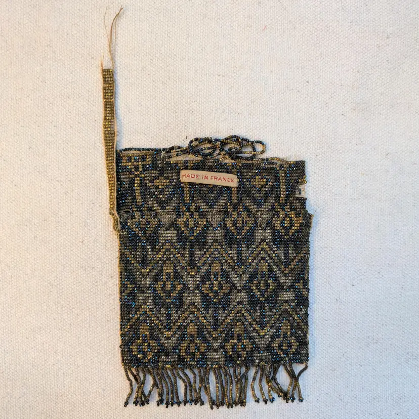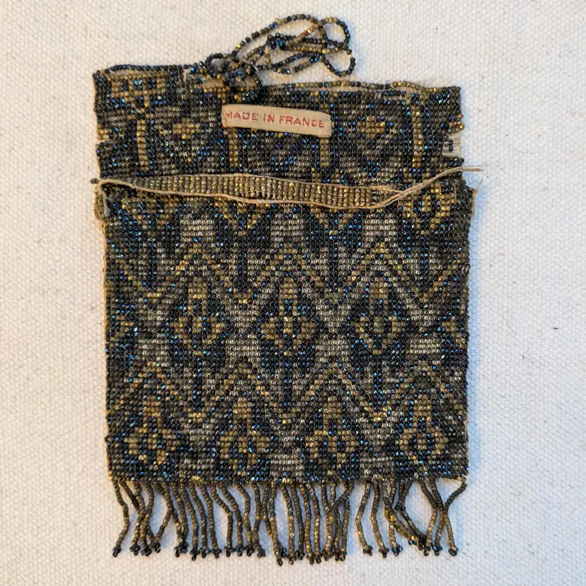 Gorgeous French antique beaded purse from the flapper era, featuring an intricate geometric pattern in grey, gold, and blue. The purse is adorned with delicate fringe and had beaded strap, which is mostly now missing. Has a Made in France tag on the inside. Other examples of similar bags I have seen have a lining, but this one has no sign of one.