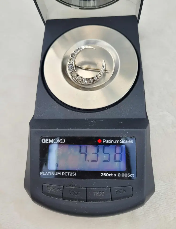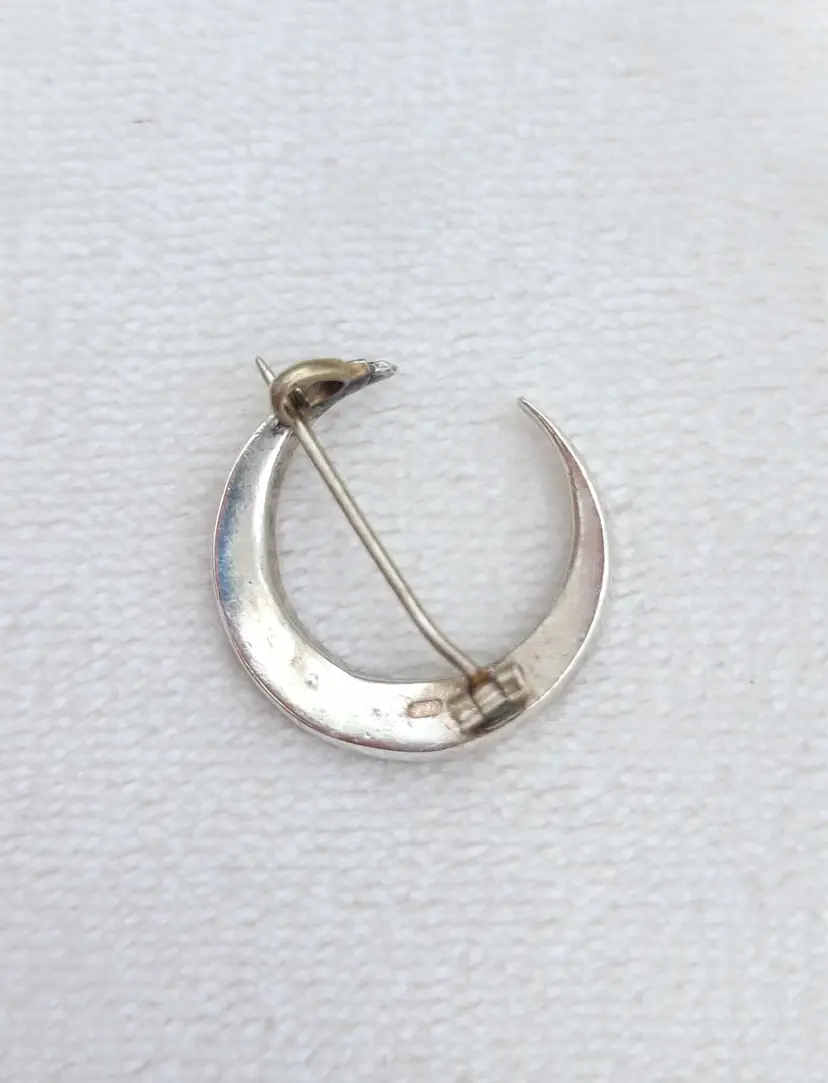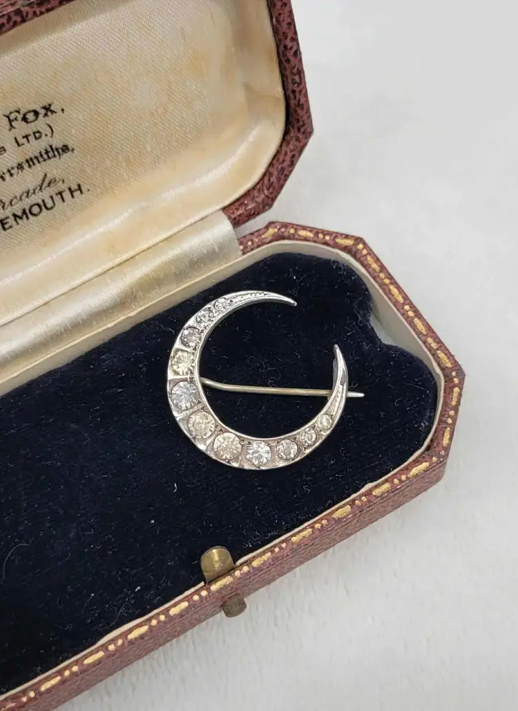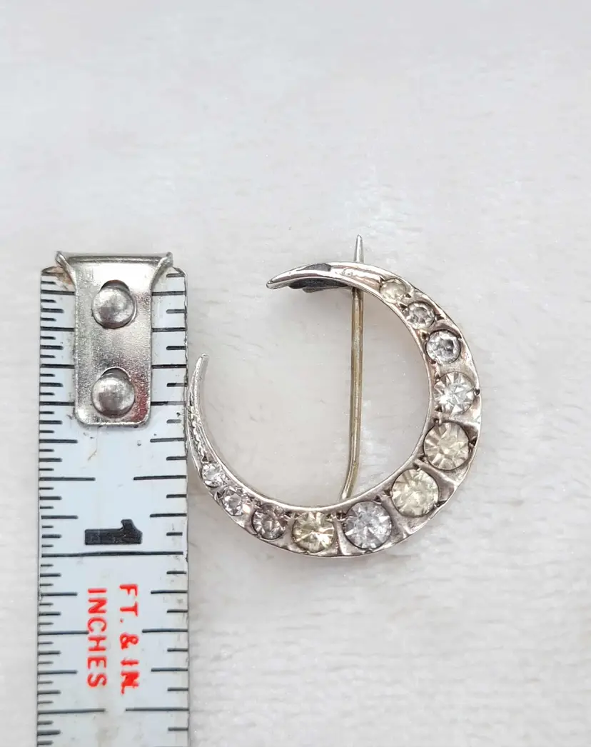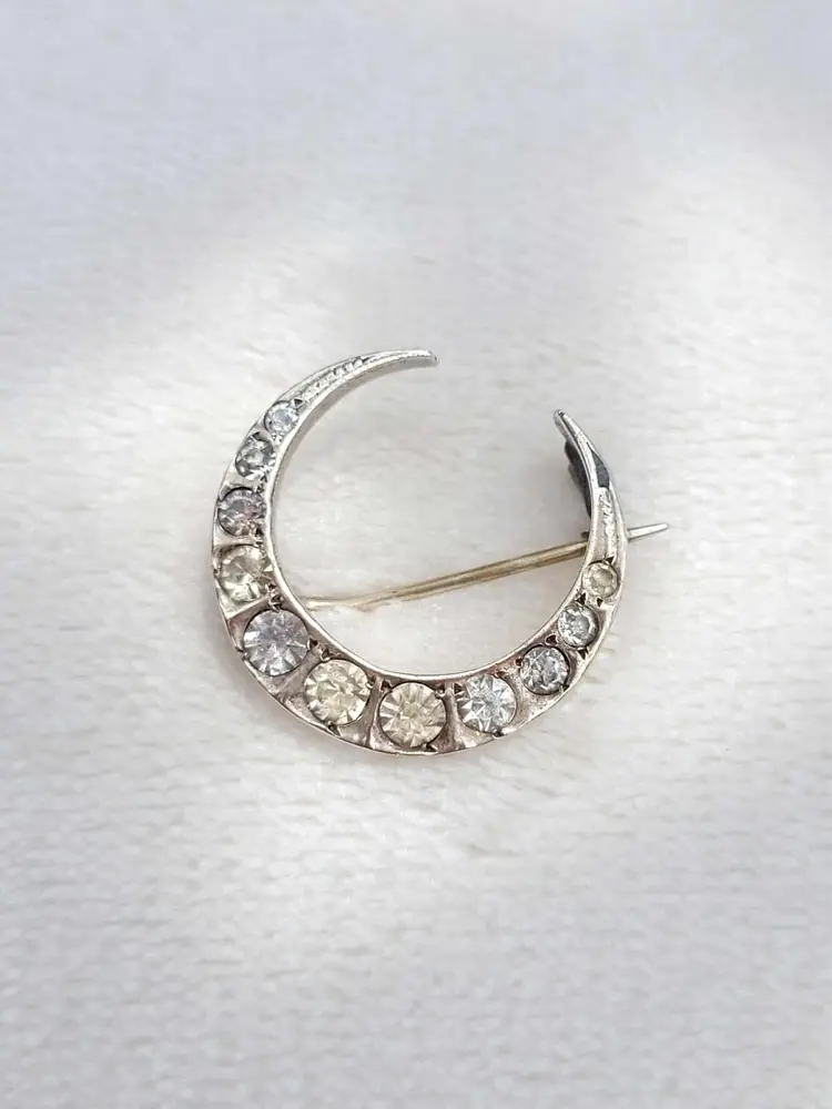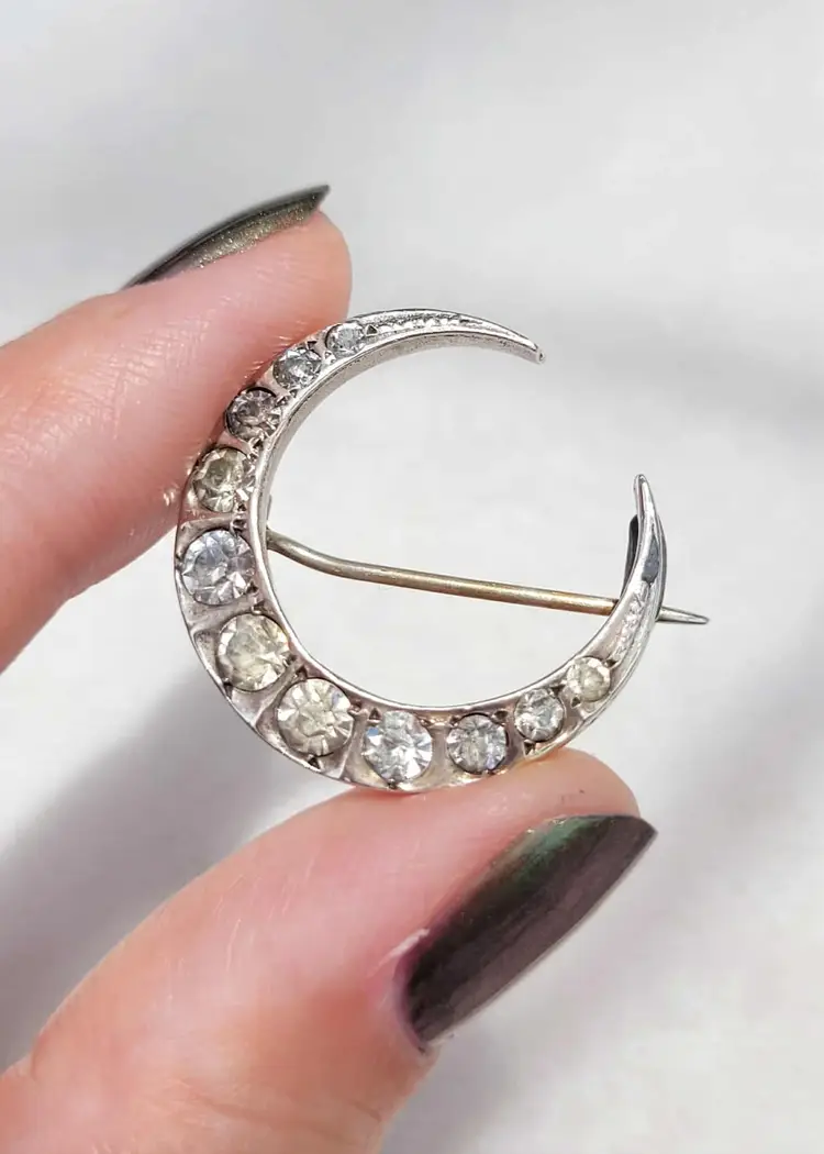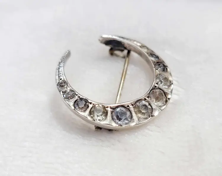 This is a gorgeous 900 silver crescent moon brooch from an English estate, with sparkling clear paste stones. This is most likely French in origin. It's in good condition, with some signs of age; please see pictures for details and measurements. The pin doesn't stay super tight in the c clasp when clasped. Does not include my display box.