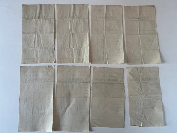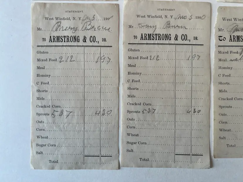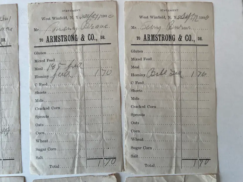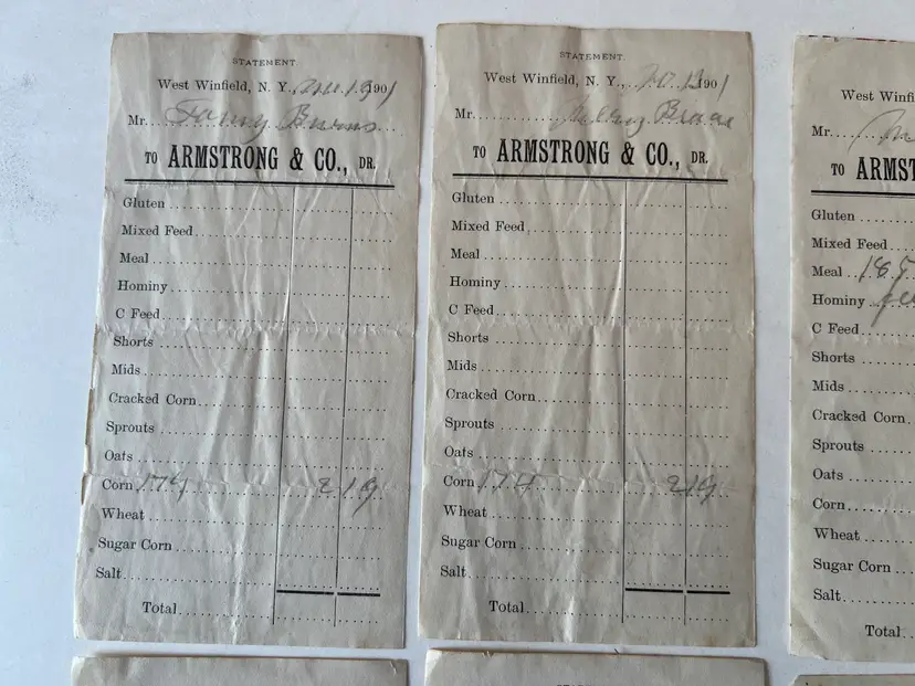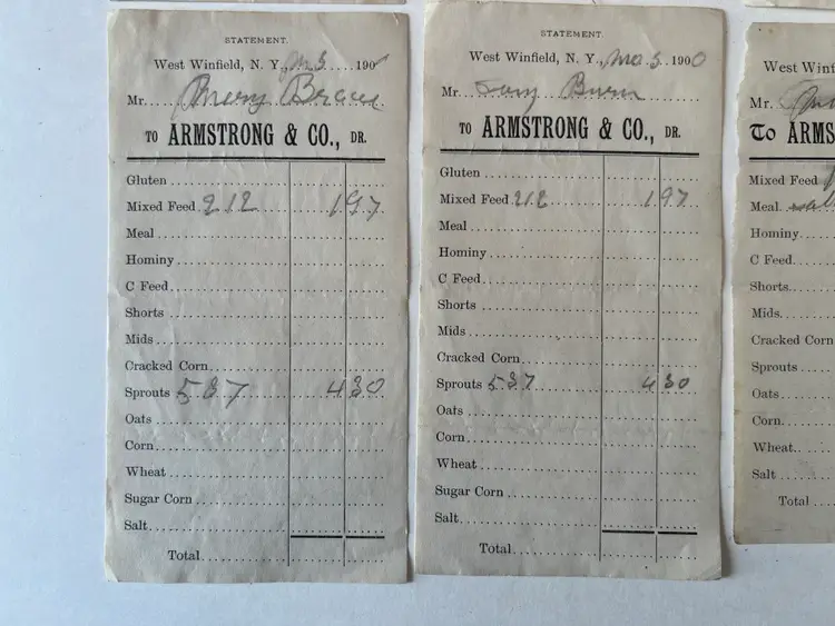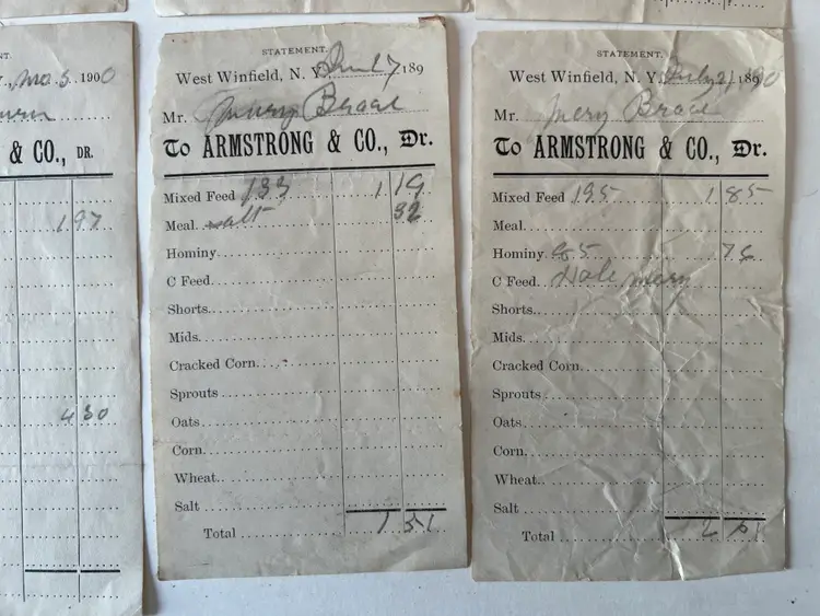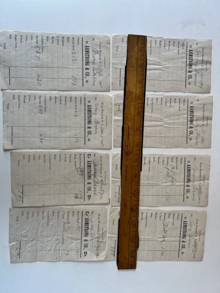 Collection of 8 Feed store receipts from 1899-1901 Armstrong & Company West Winfield NY Filled out by hand. See ruler for measurements