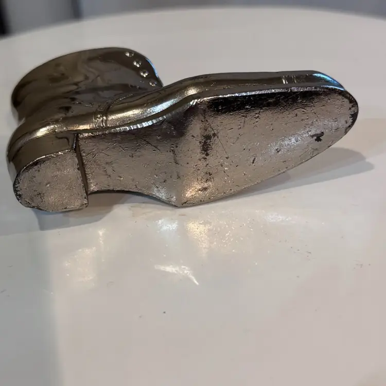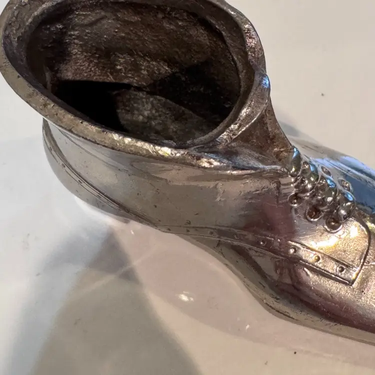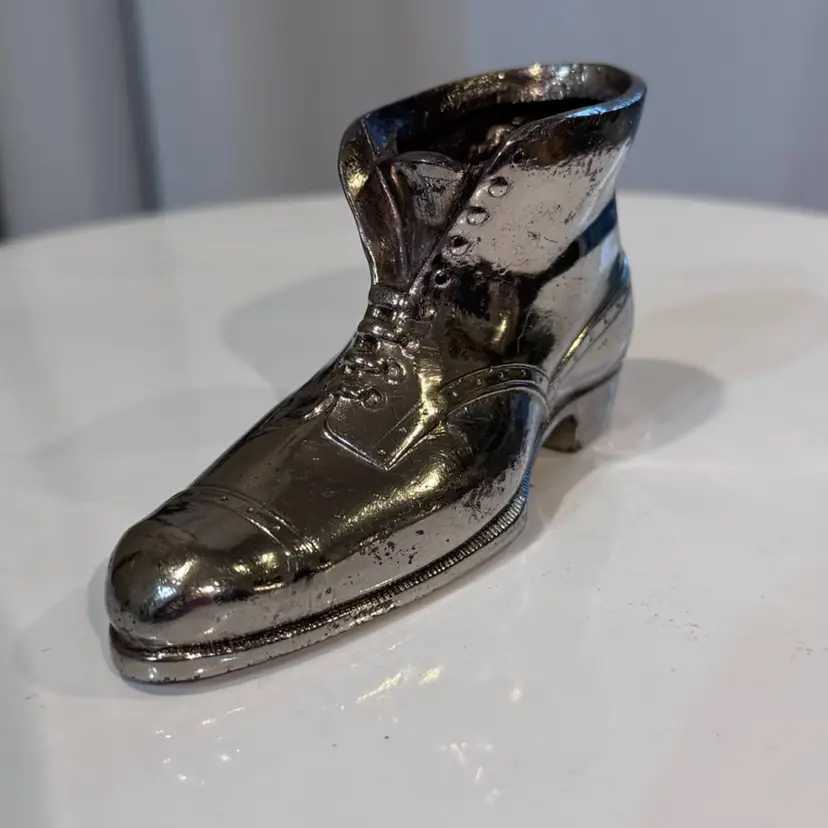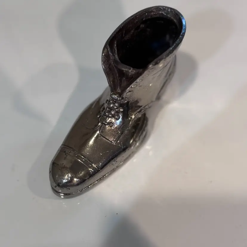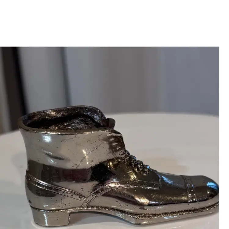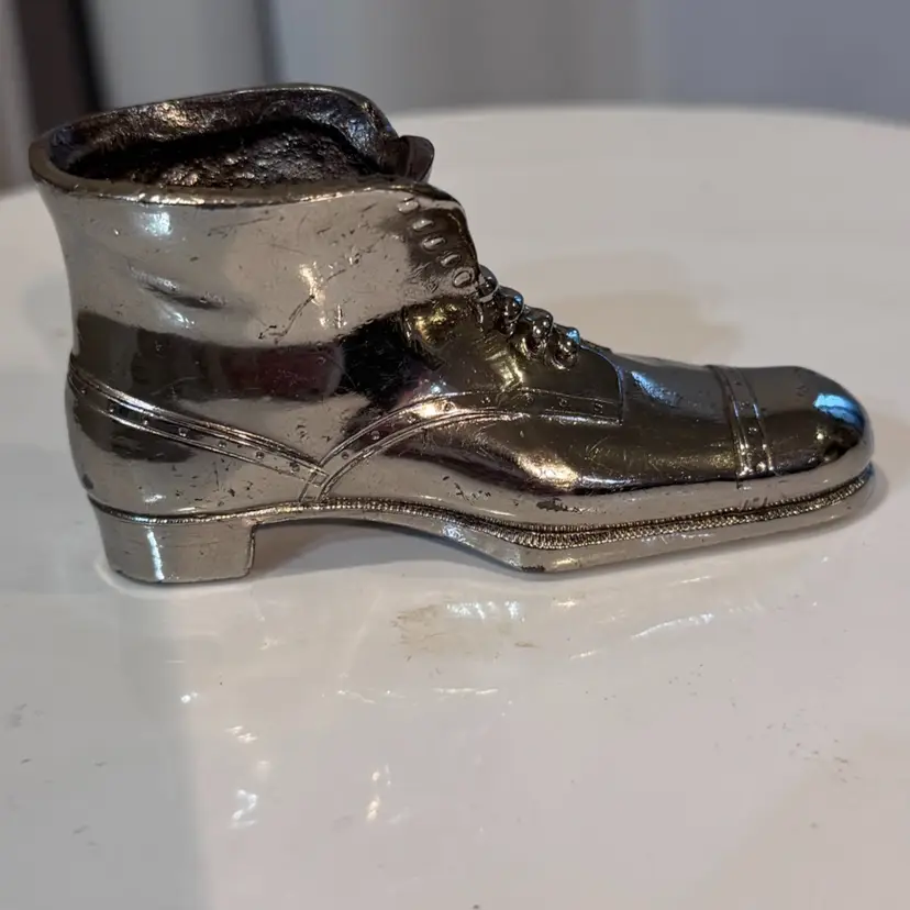 Early 1900s metal men’s shoe pin cushion. Missing pin cushion, but could be easily replaced. Measures 2 inches tall and 3 1/2 inches long.
