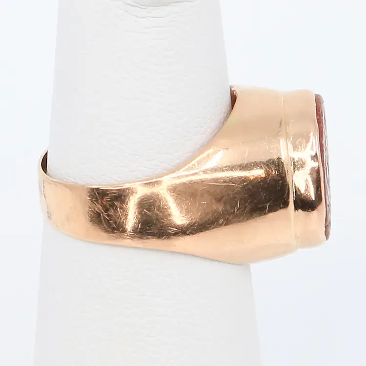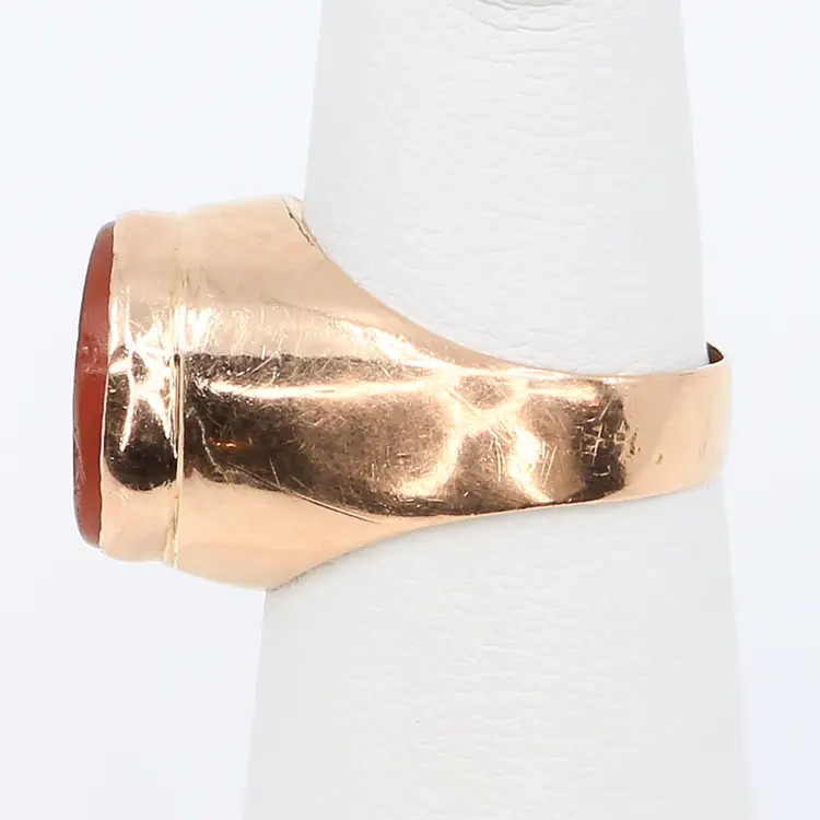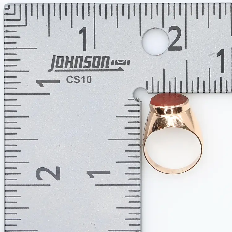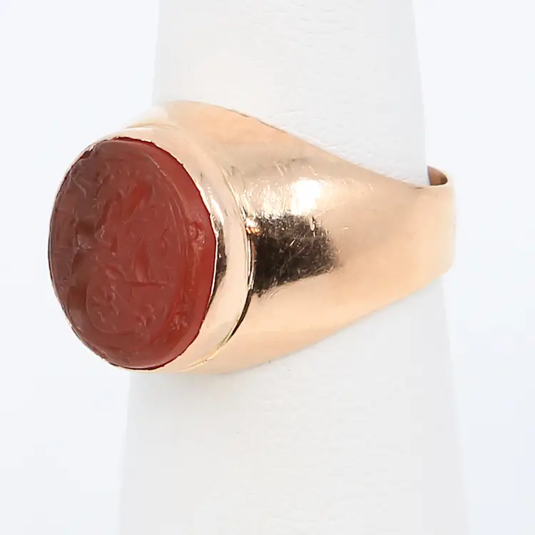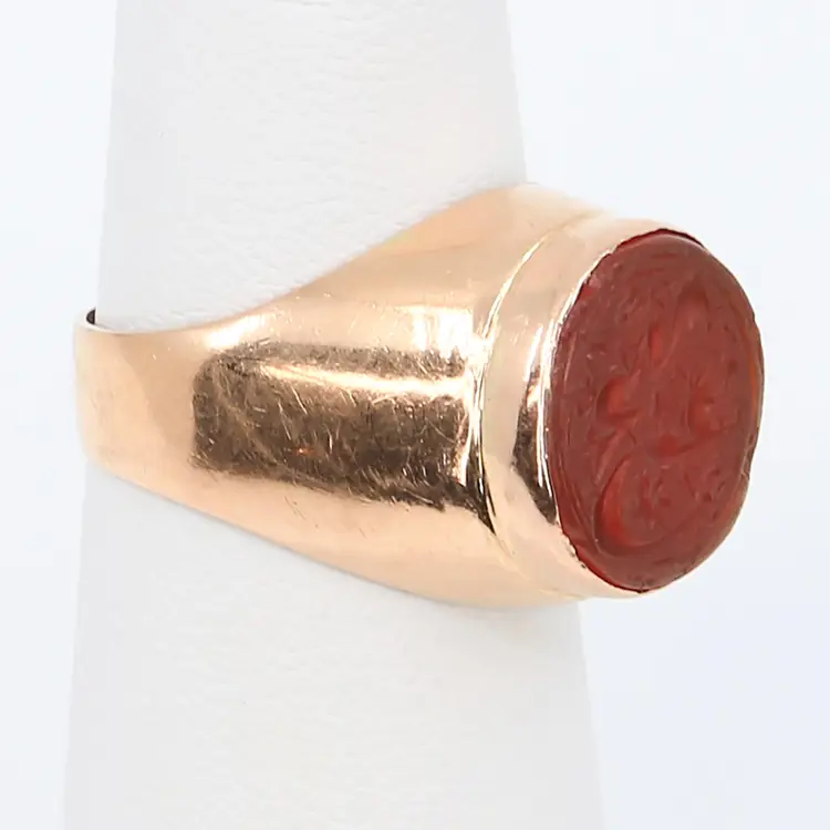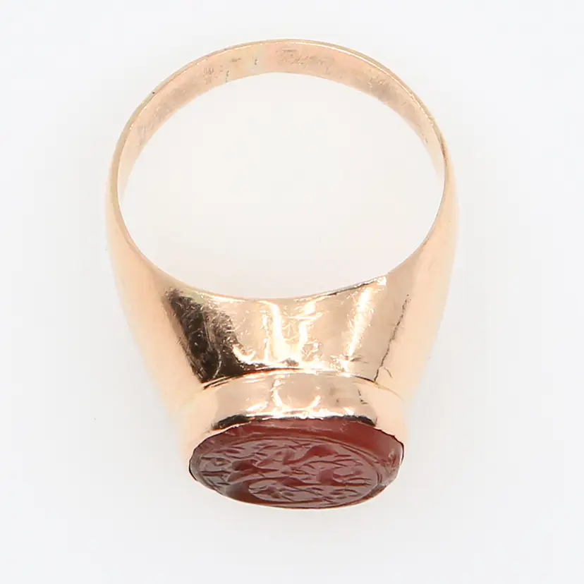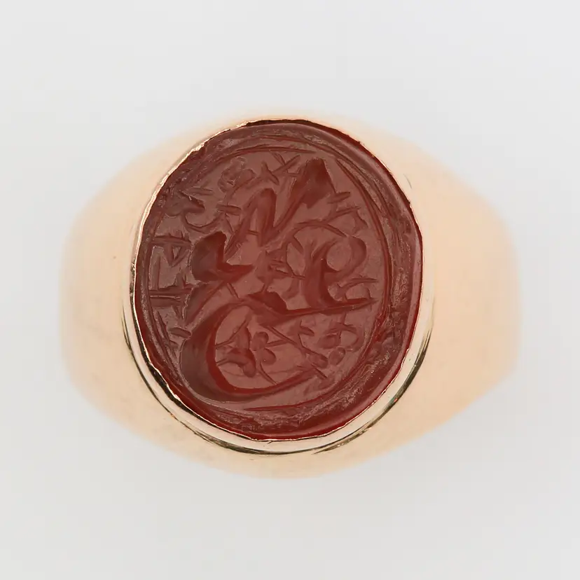 Gorgeous Georgian era 10K gold signet ring featuring a hand-carved oval carnelian intaglio with rich dark orange hues and stunning translucency when held to the light. The intaglio showcases a beautifully flowing calligraphic Arabic inscription, along with intricate hand-etched symbols. It was likely used as a wax seal for sealing letters. A classic piece of history, this ring can be worn as a pinky ring or resized to fit any finger. A rare and elegant treasure, perfect for antique jewelry collectors and those who appreciate historical craftsmanship.
