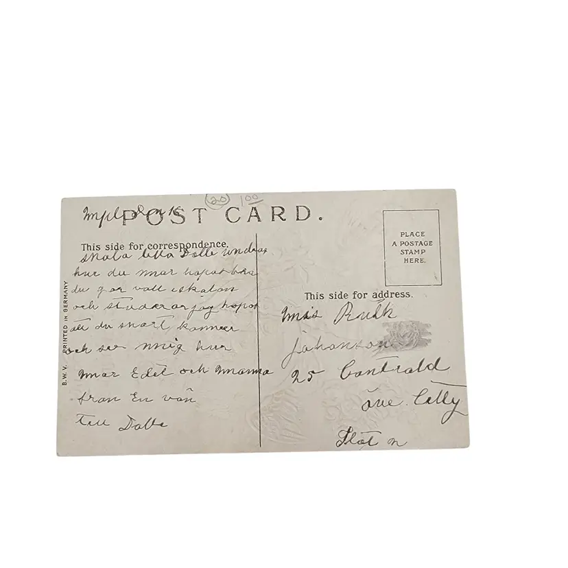 This charming antique Valentine postcard tells a tale of affection with its cherubic angels, abundant roses, and handwritten messages—a nostalgic glimpse into heartfelt love.