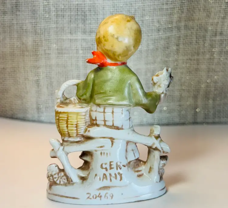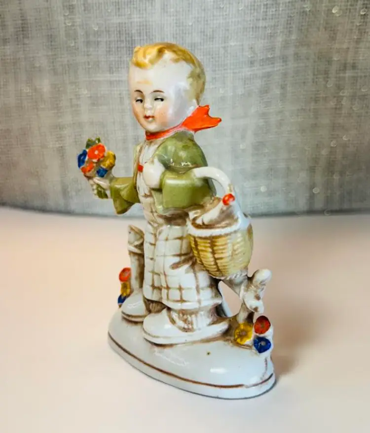 This antique German porcelain figurine features a beautiful blonde boy with a basket, perfect for any Victorian fair or collectible display.