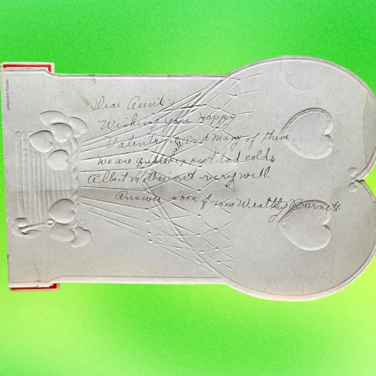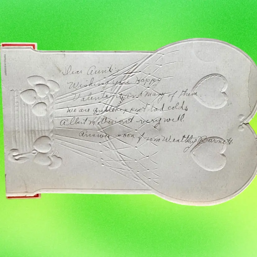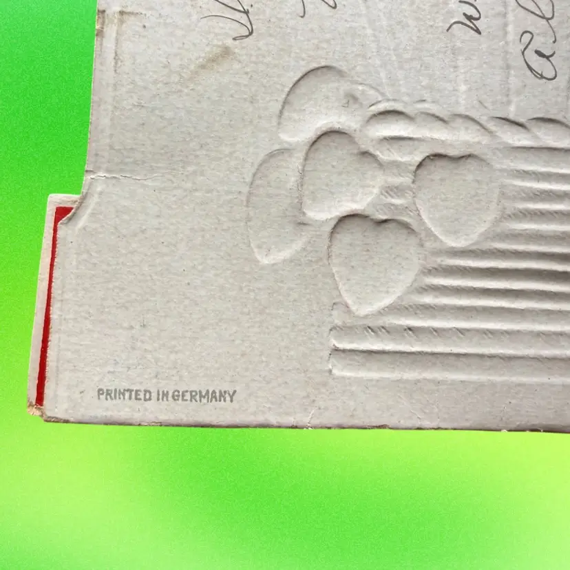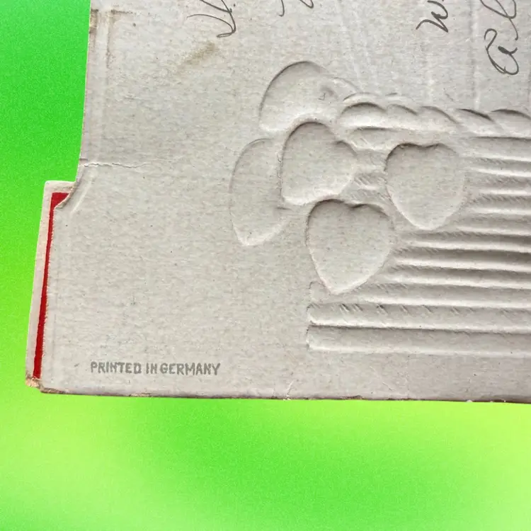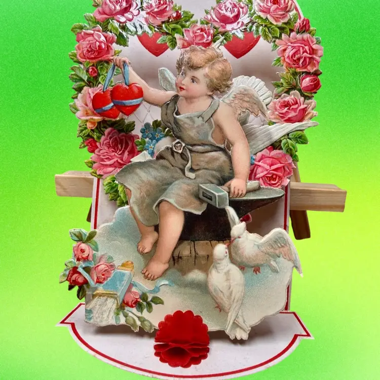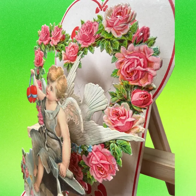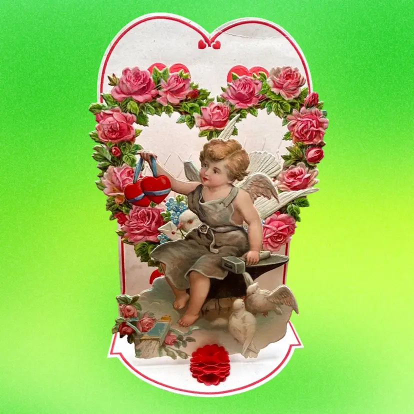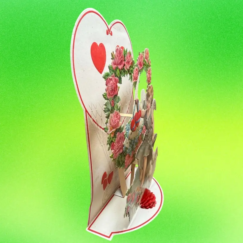4.75”x7.5”. Beautiful antique valentine, which pops out to be 3D and stands on its own. Features a cherub angel & doves. Backdrop features a rose heart shaped wreath & a hot air balloon. Signed on the backside. Made in Germany. Honeycomb is in great condition. Has some wear/discoloration due to age. Top of heart has a crease.